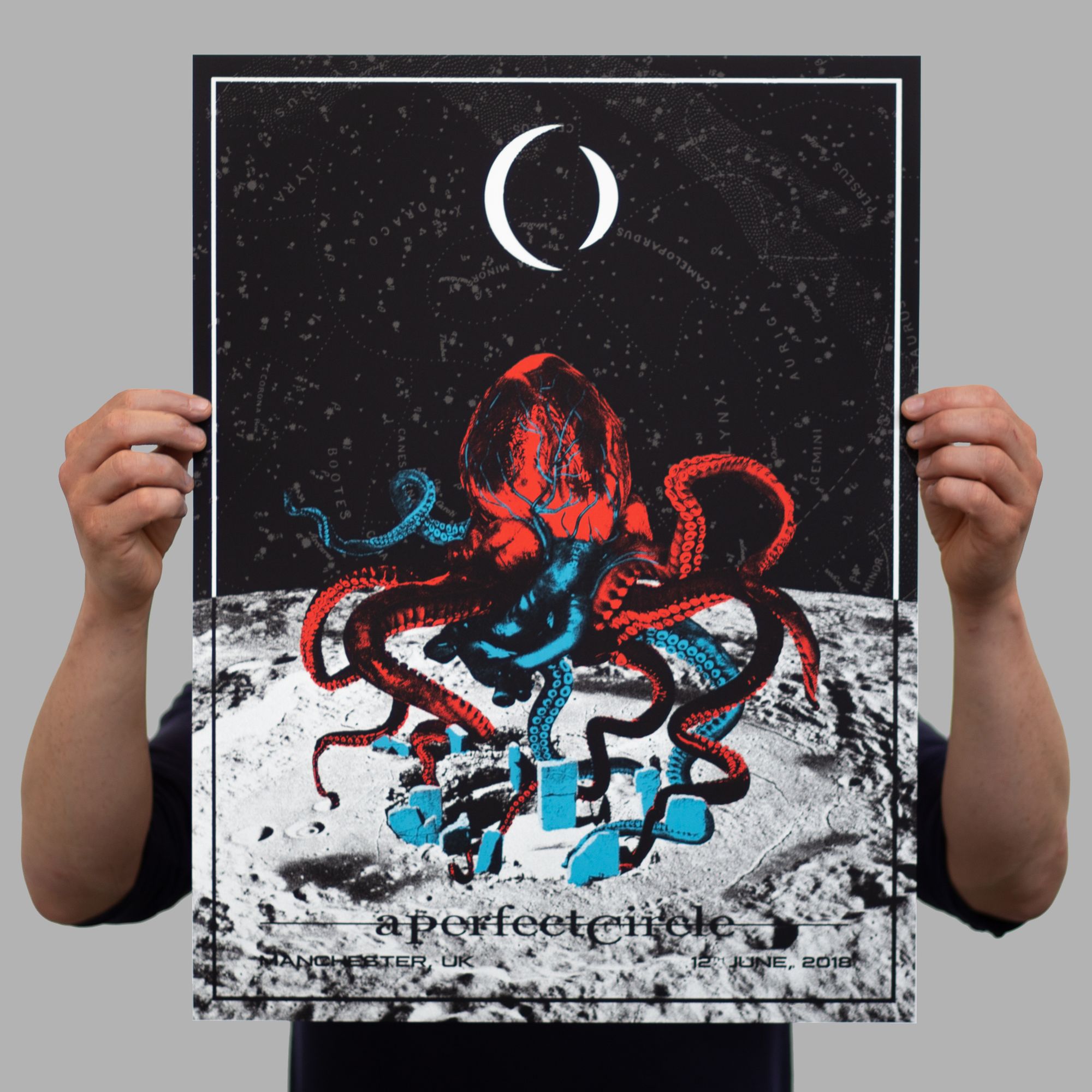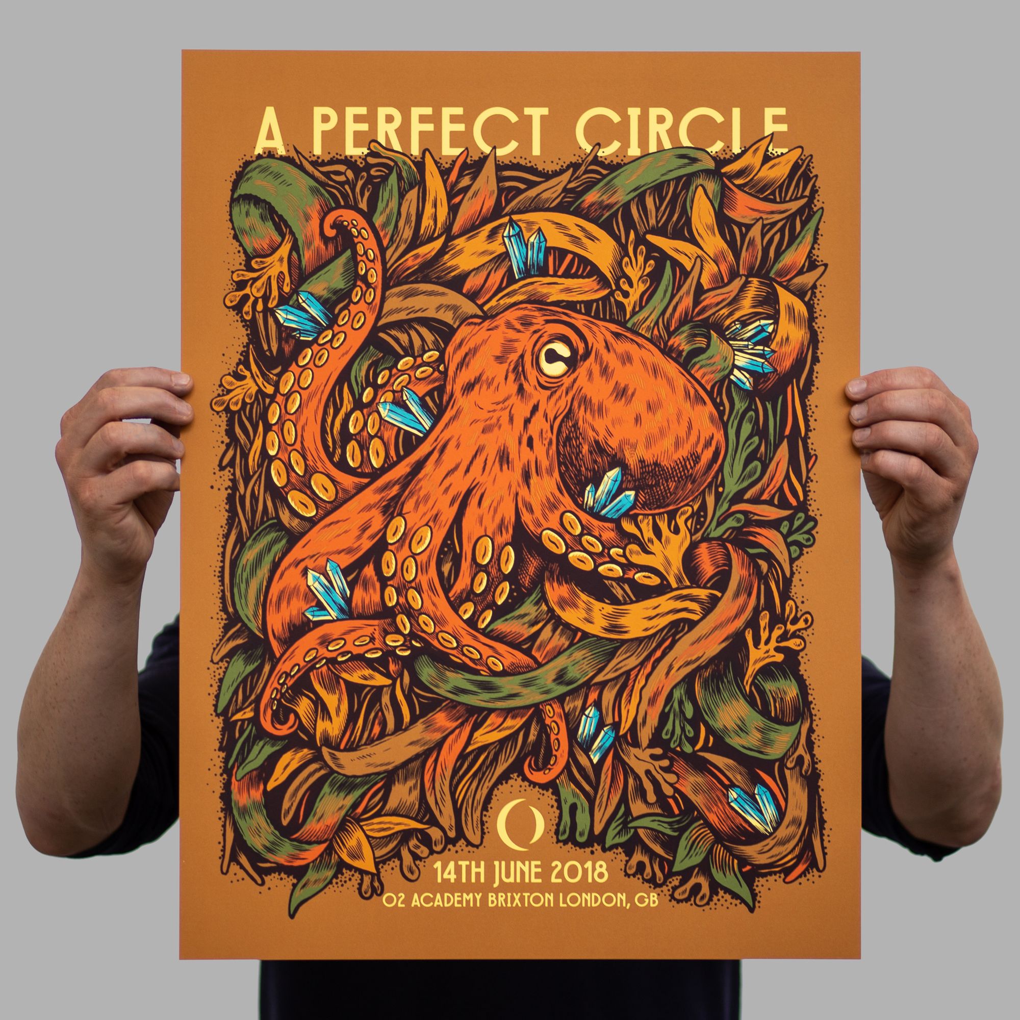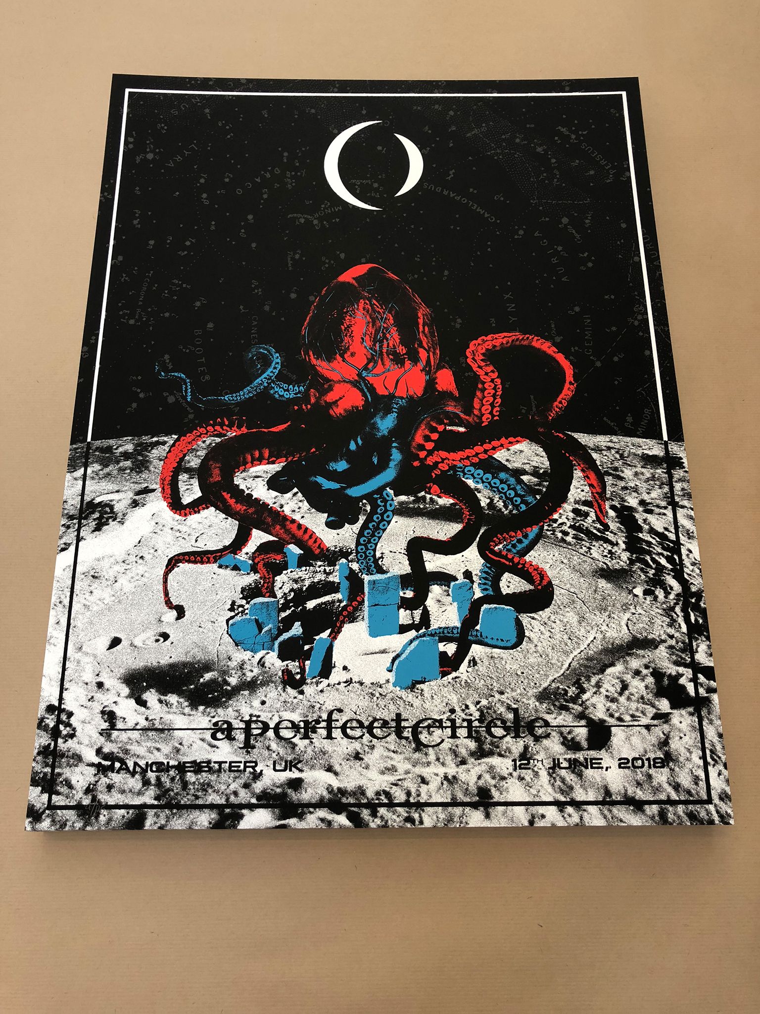 There is a huge scene in the US for collectable gig posters, and it’s been steadily growing on this side of the Atlantic, in the UK and Germany especially. It’s always an exciting prospect when an American band tours Europe because the desire for gig posters comes with them, and in the case of A Perfect Circle’s tour, they really went to town with commissioning artists for each and every date.