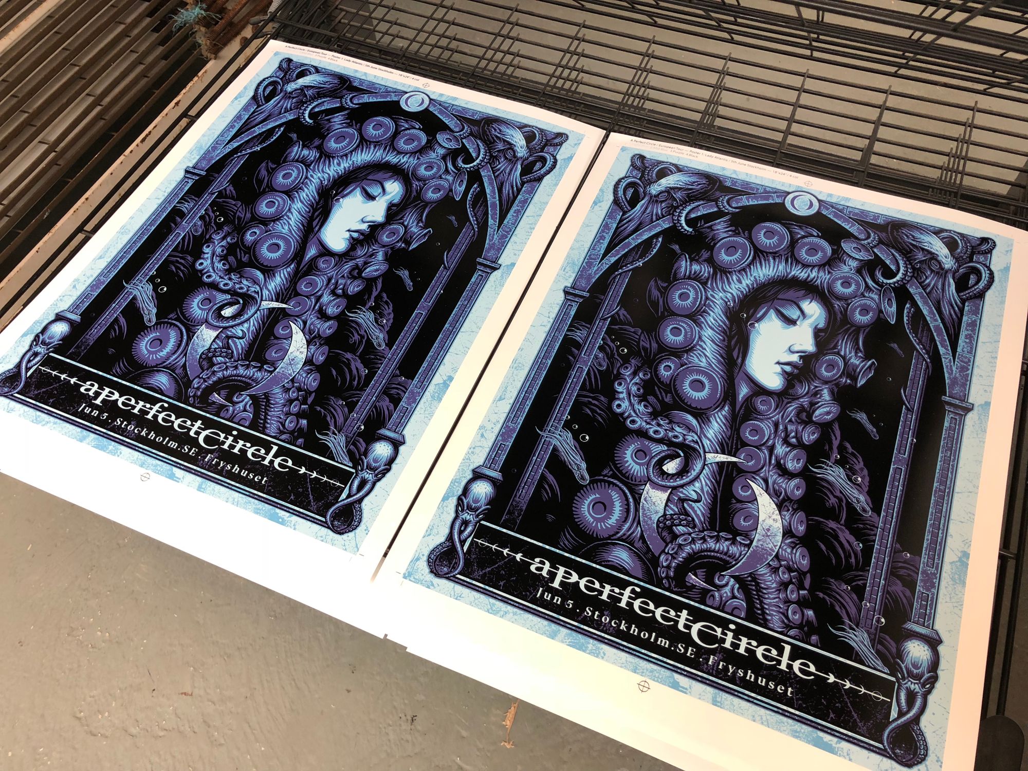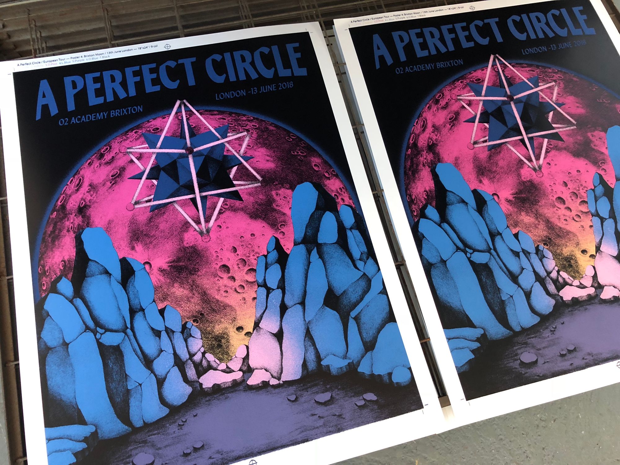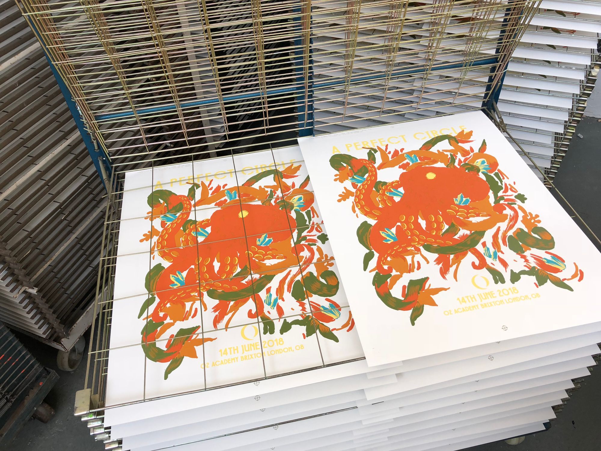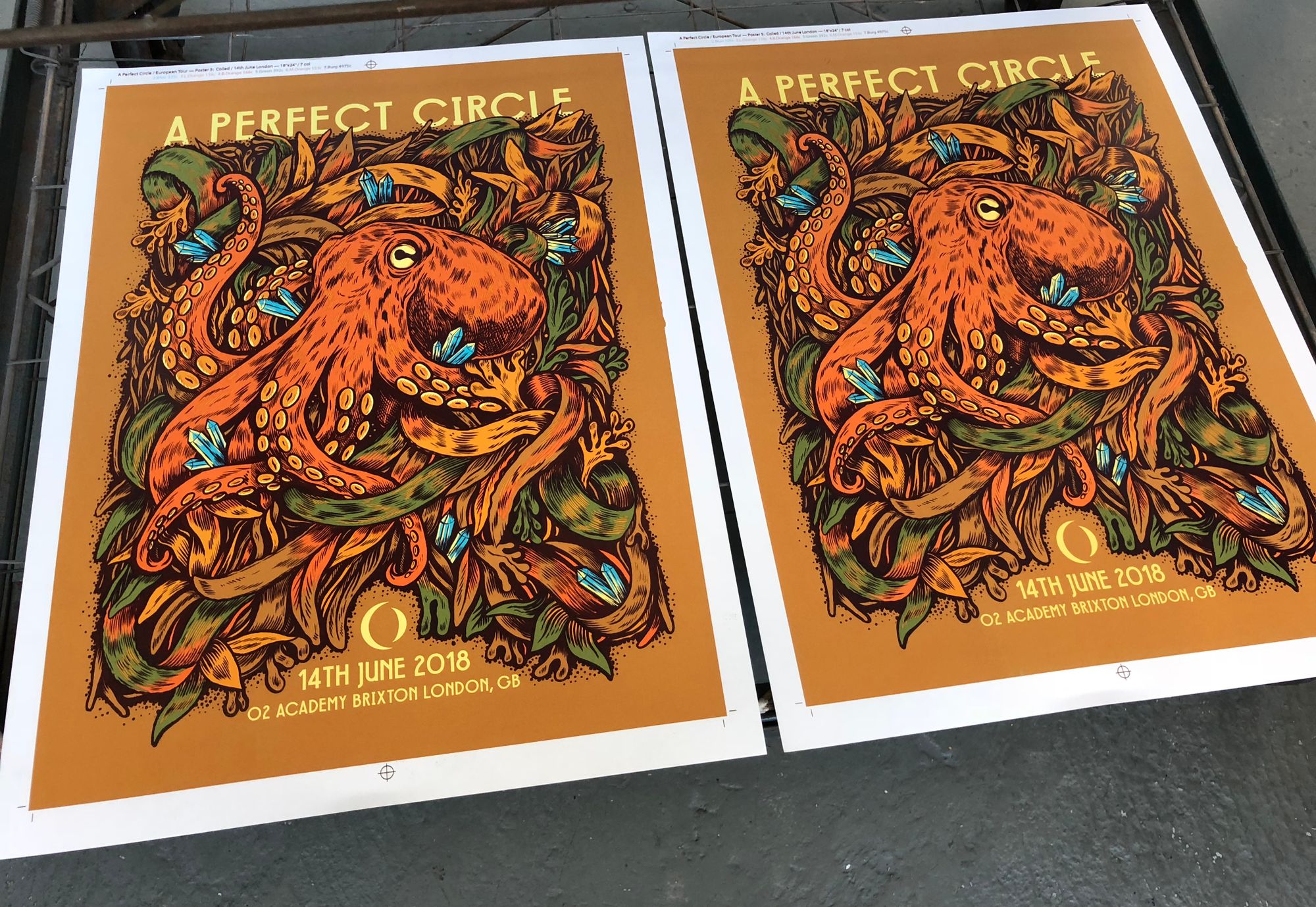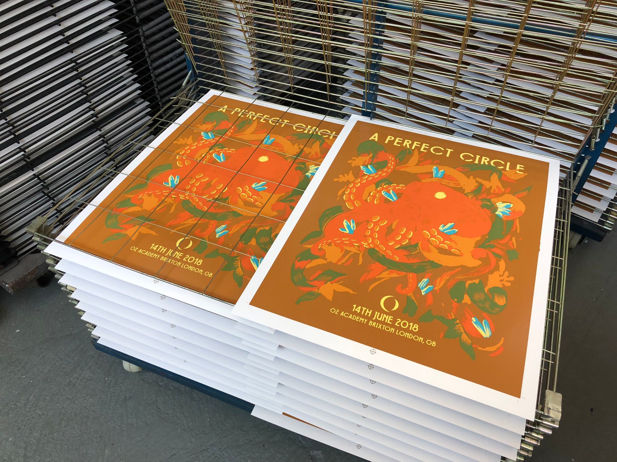 We had the great pleasure of screenprinting eight posters for the European leg of A Perfect Circle’s tour, which we worked on over a busy nine-day period in early June. With all AP's long since in the hands of the artists, and having never shared these posters on our blog, it's exciting to reveal this fantastic body of work.