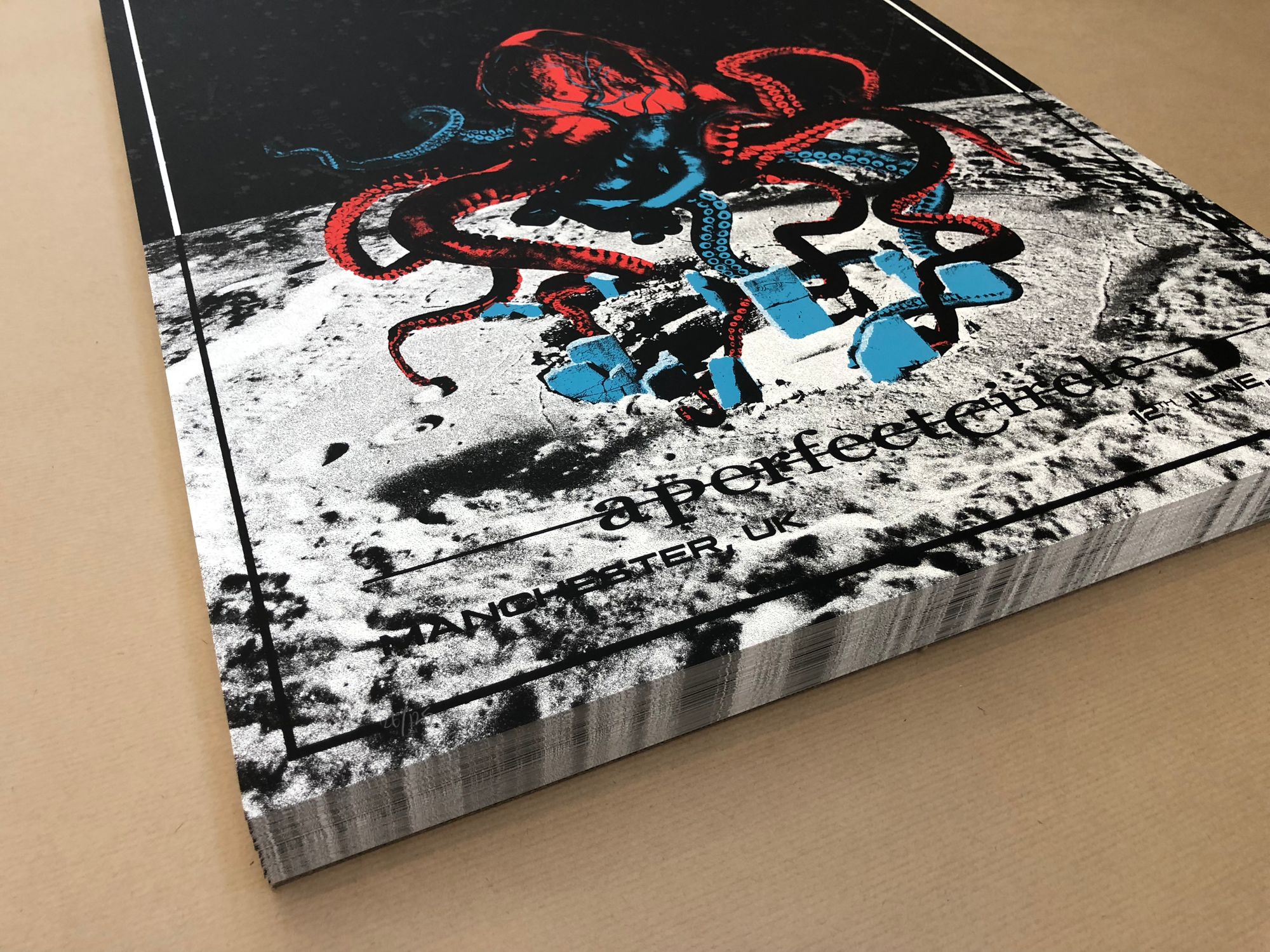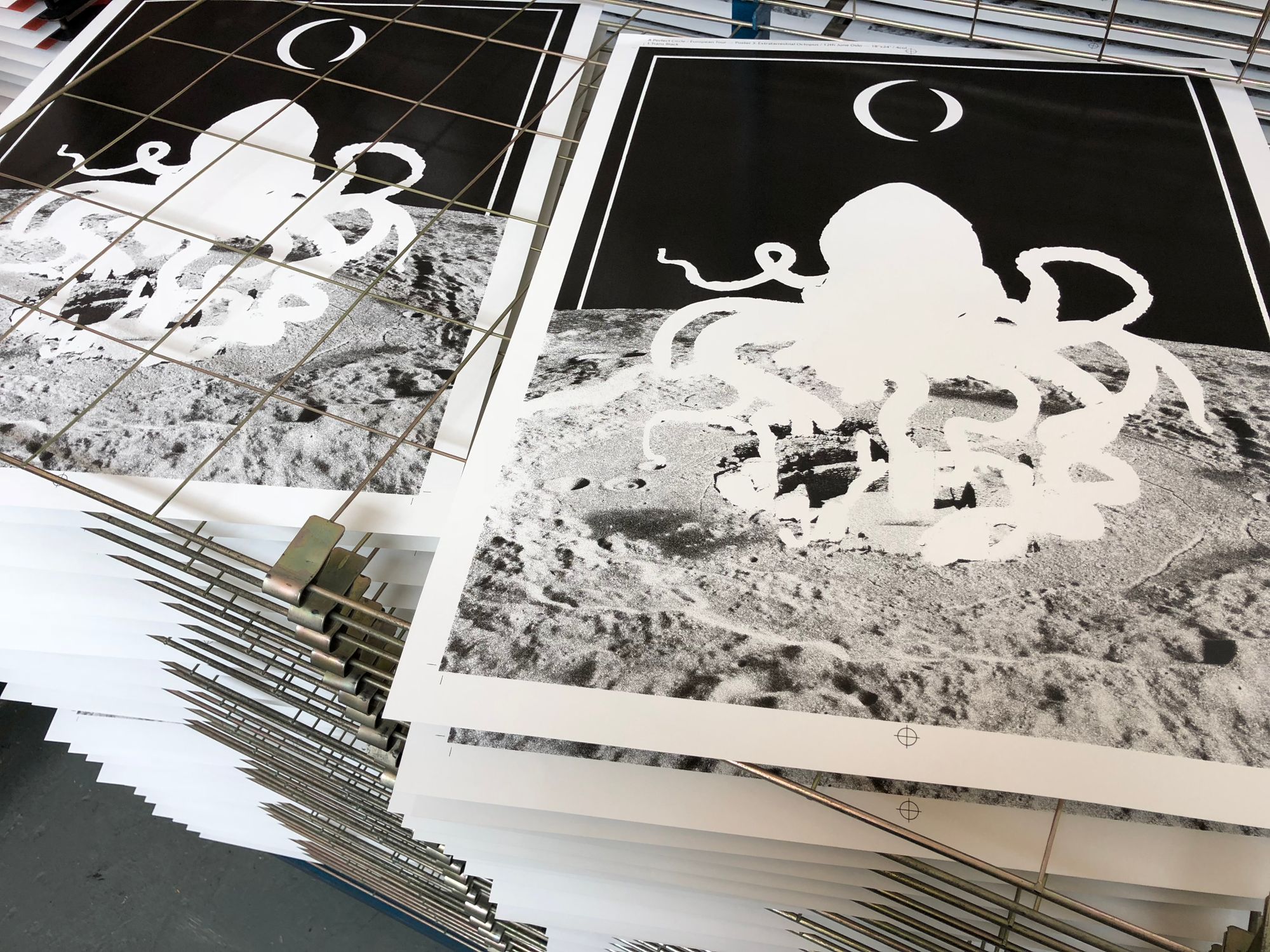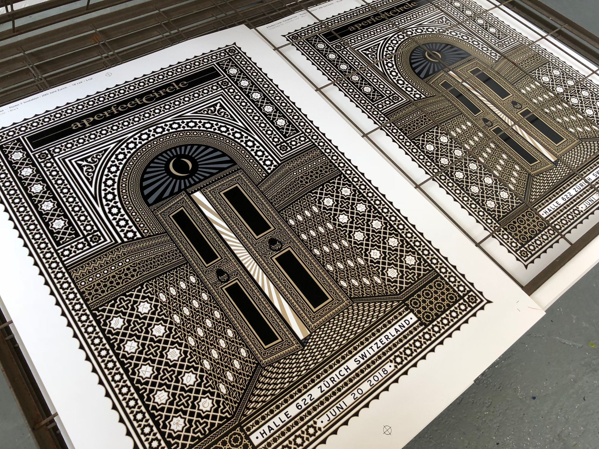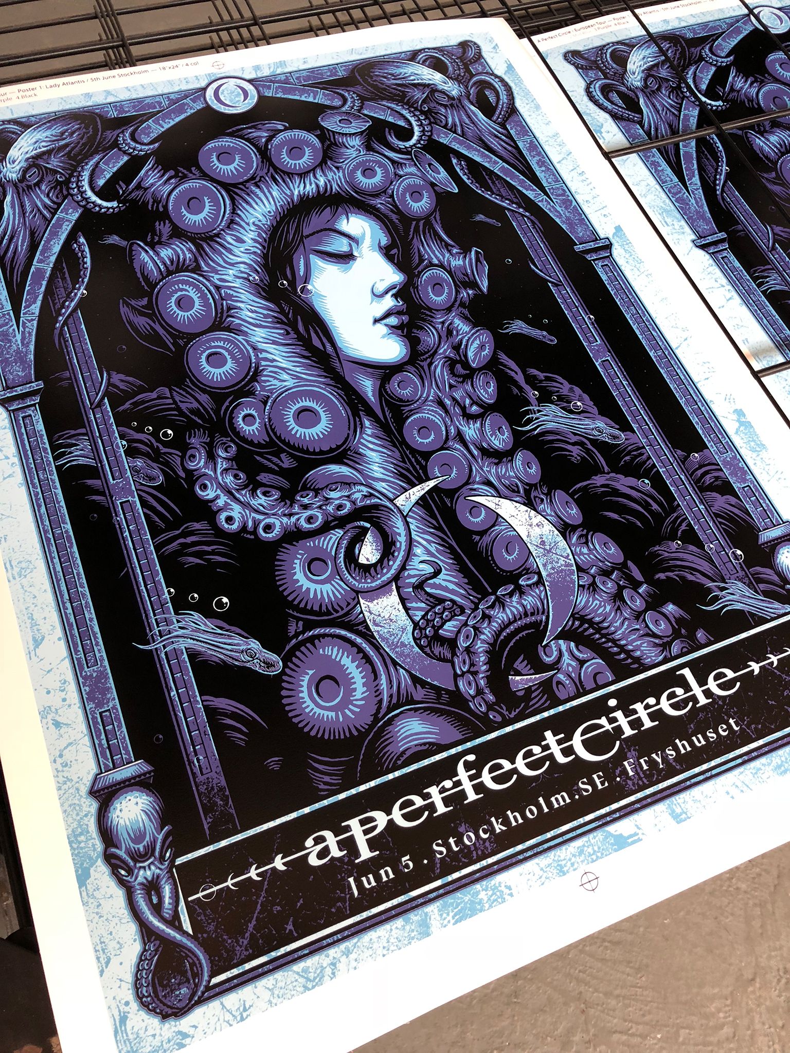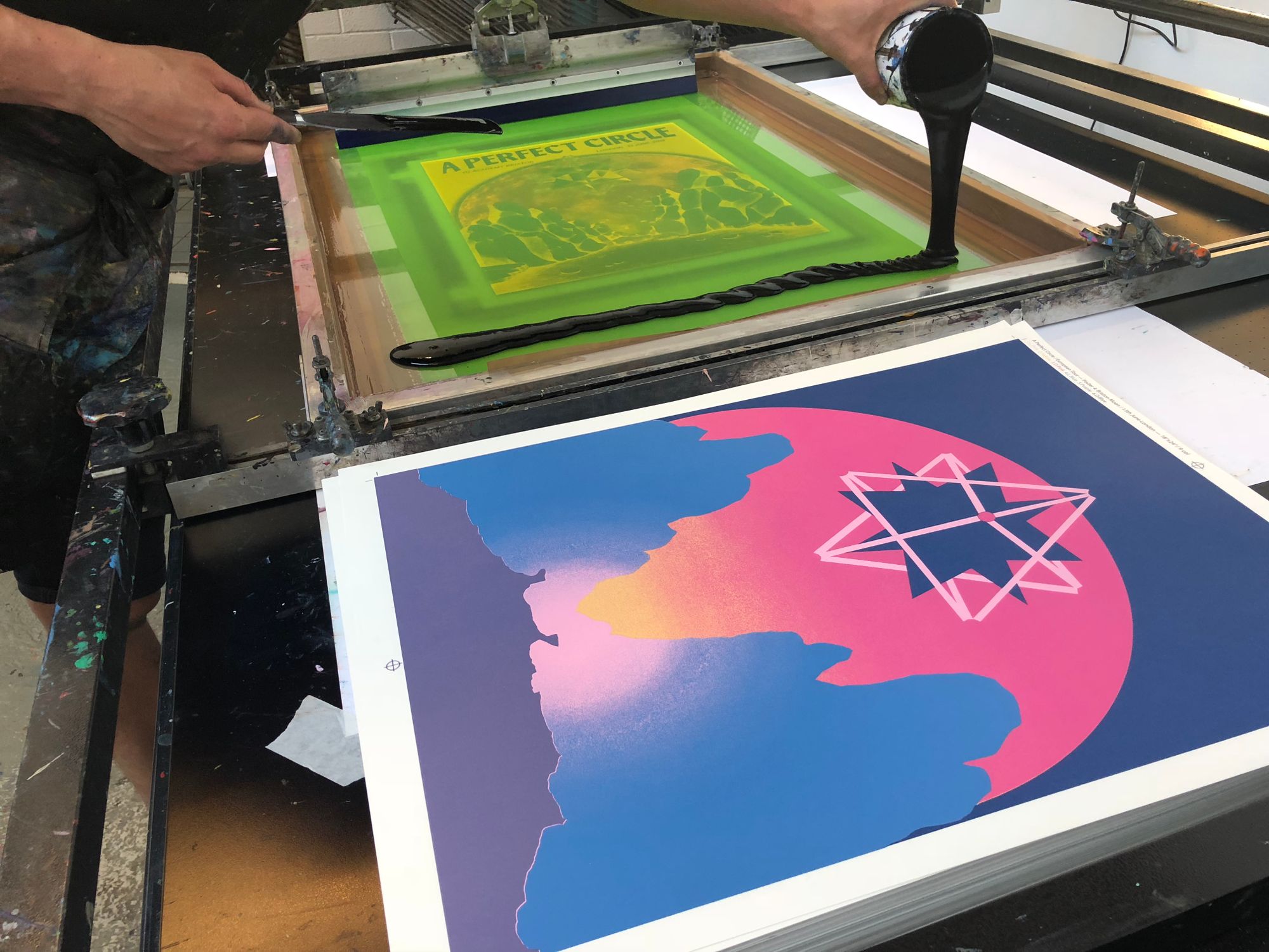 We had the great pleasure of screenprinting eight posters for the European leg of A Perfect Circle’s tour, which we worked on over a busy nine-day period in early June. With all AP's long since in the hands of the artists, and having never shared these posters on our blog, it's exciting to reveal this fantastic body of work.