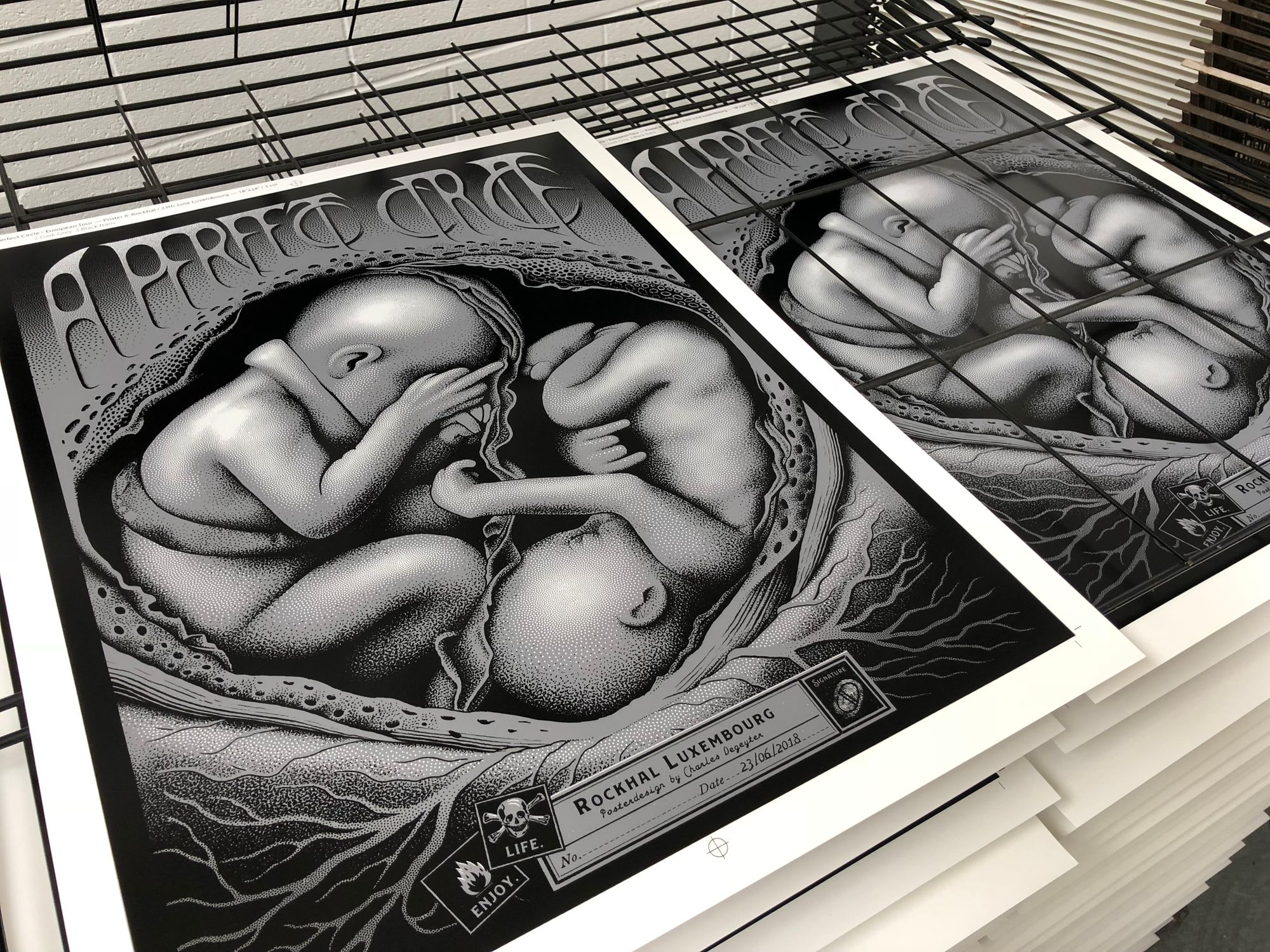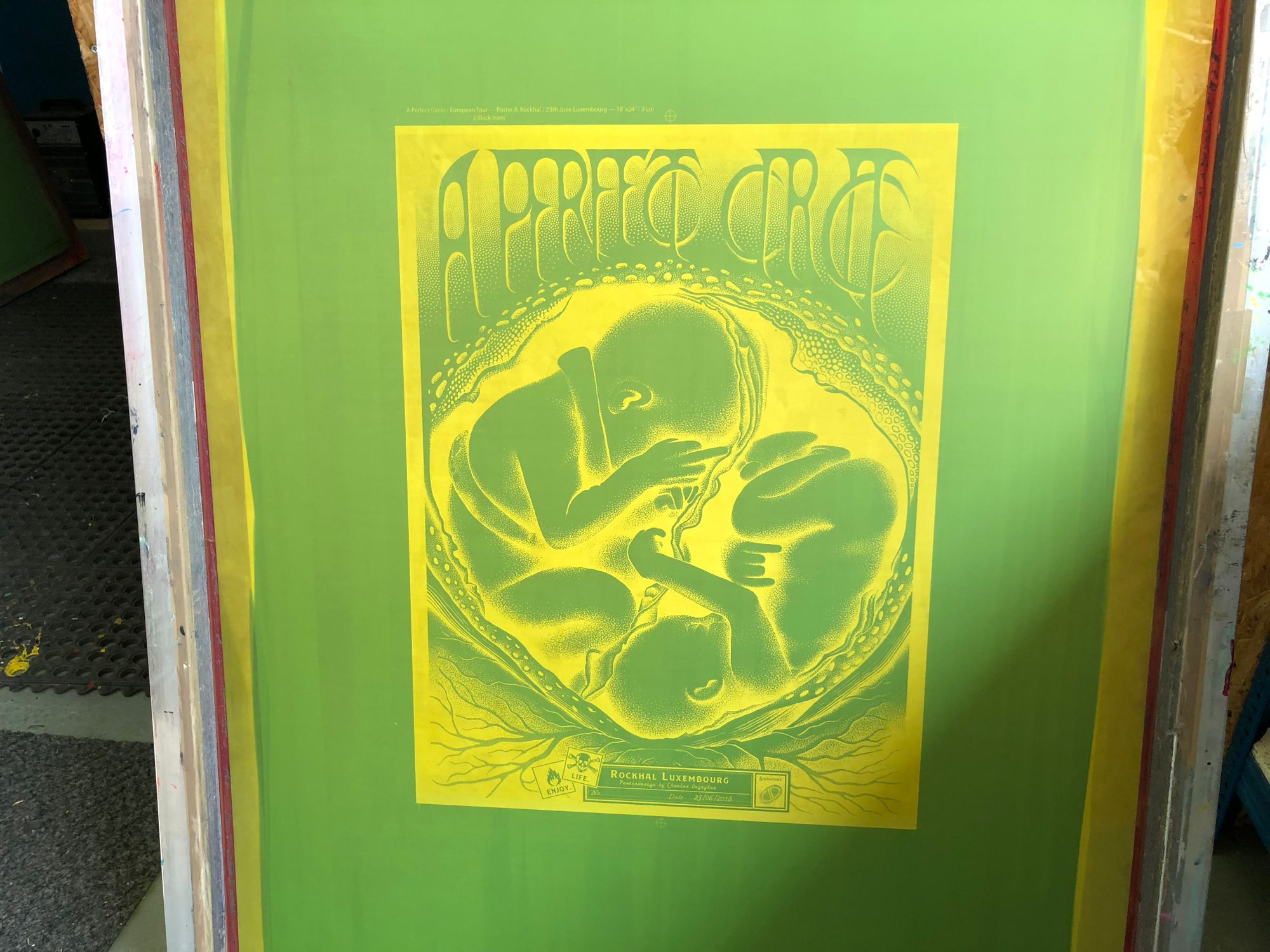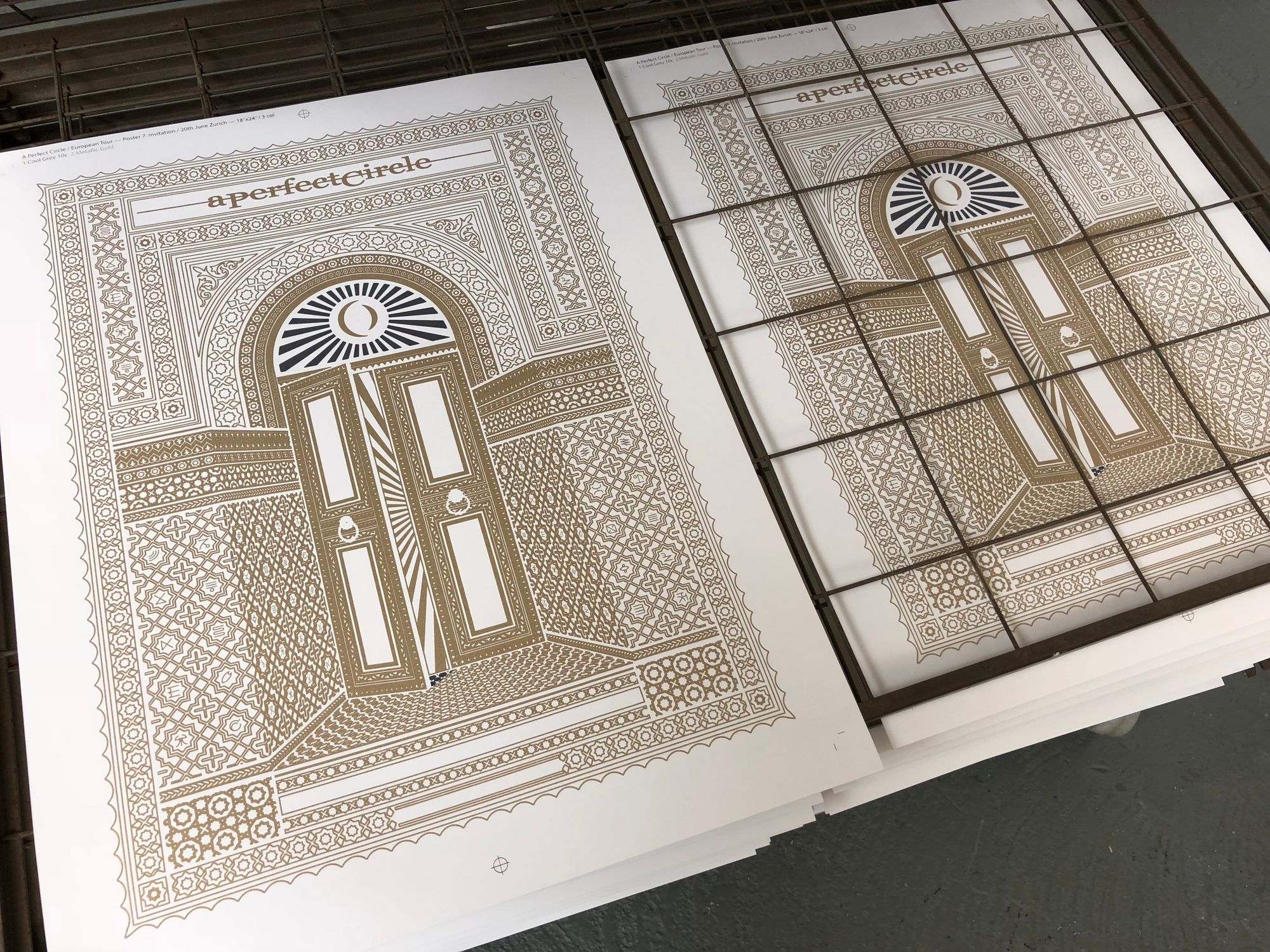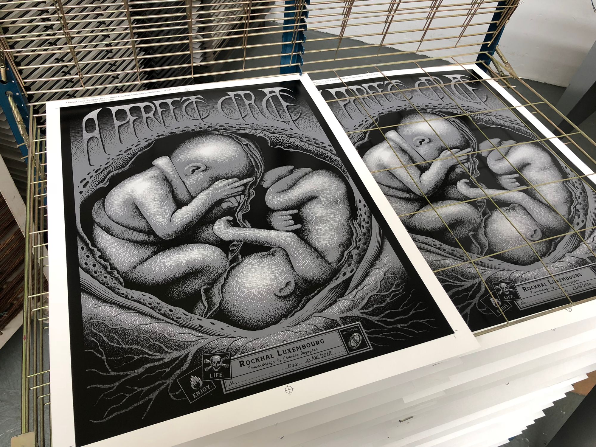 We had the great pleasure of screenprinting eight posters for the European leg of A Perfect Circle’s tour, which we worked on over a busy nine-day period in early June. With all AP's long since in the hands of the artists, and having never shared these posters on our blog, it's exciting to reveal this fantastic body of work.