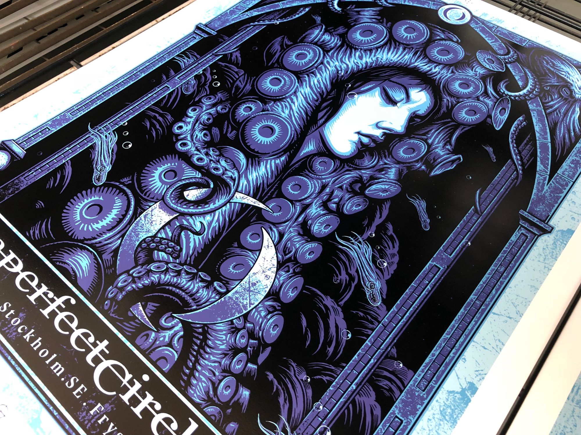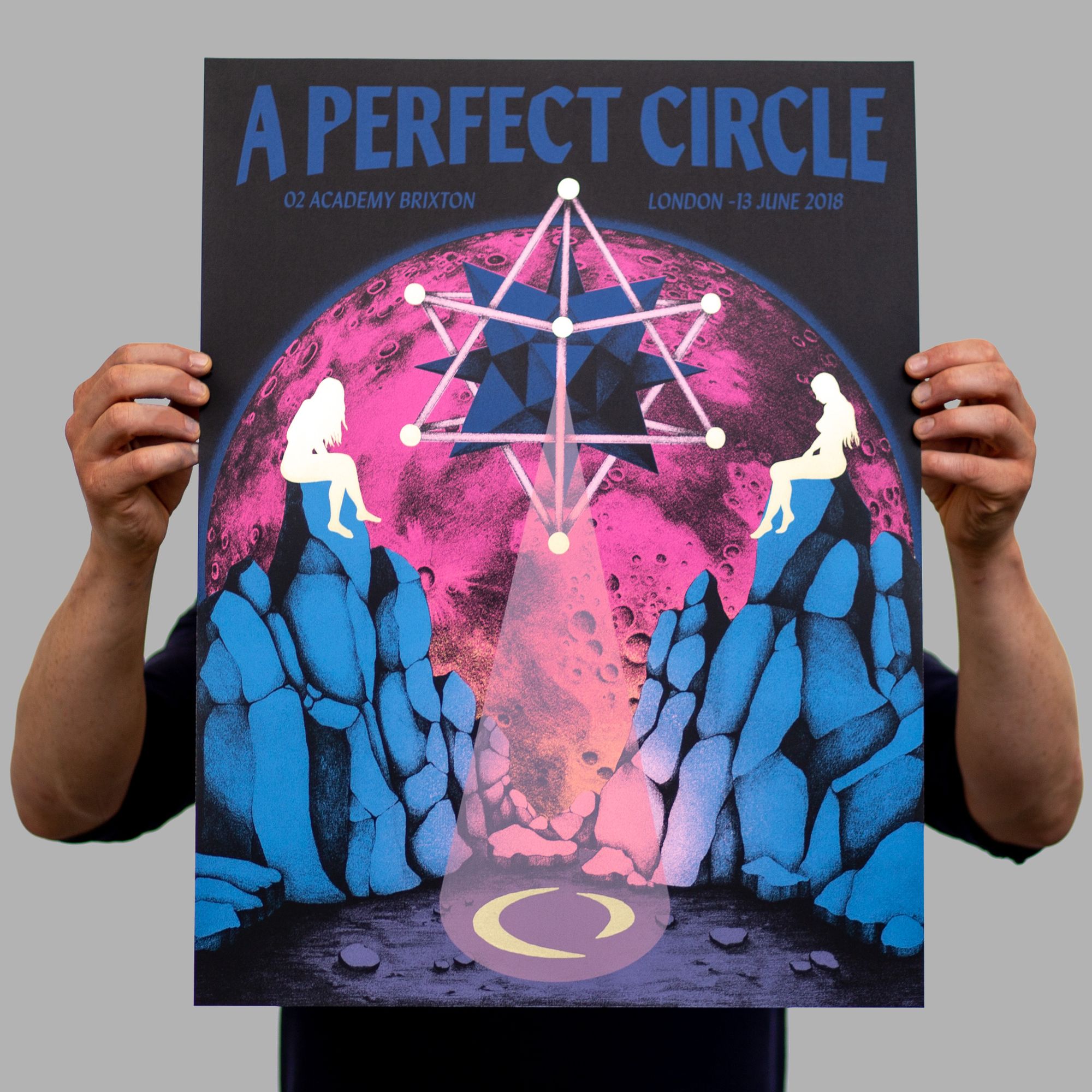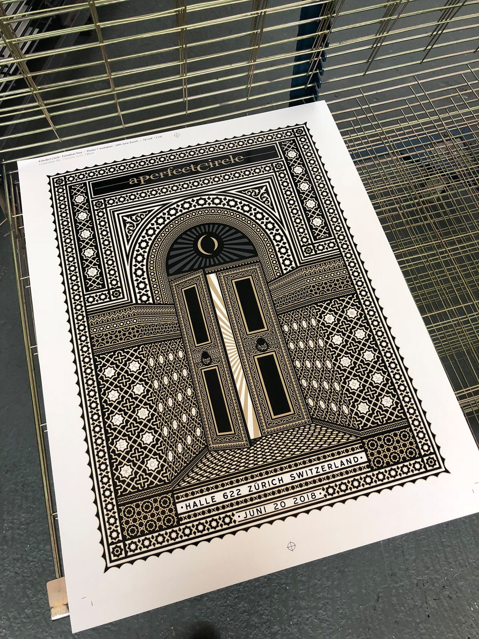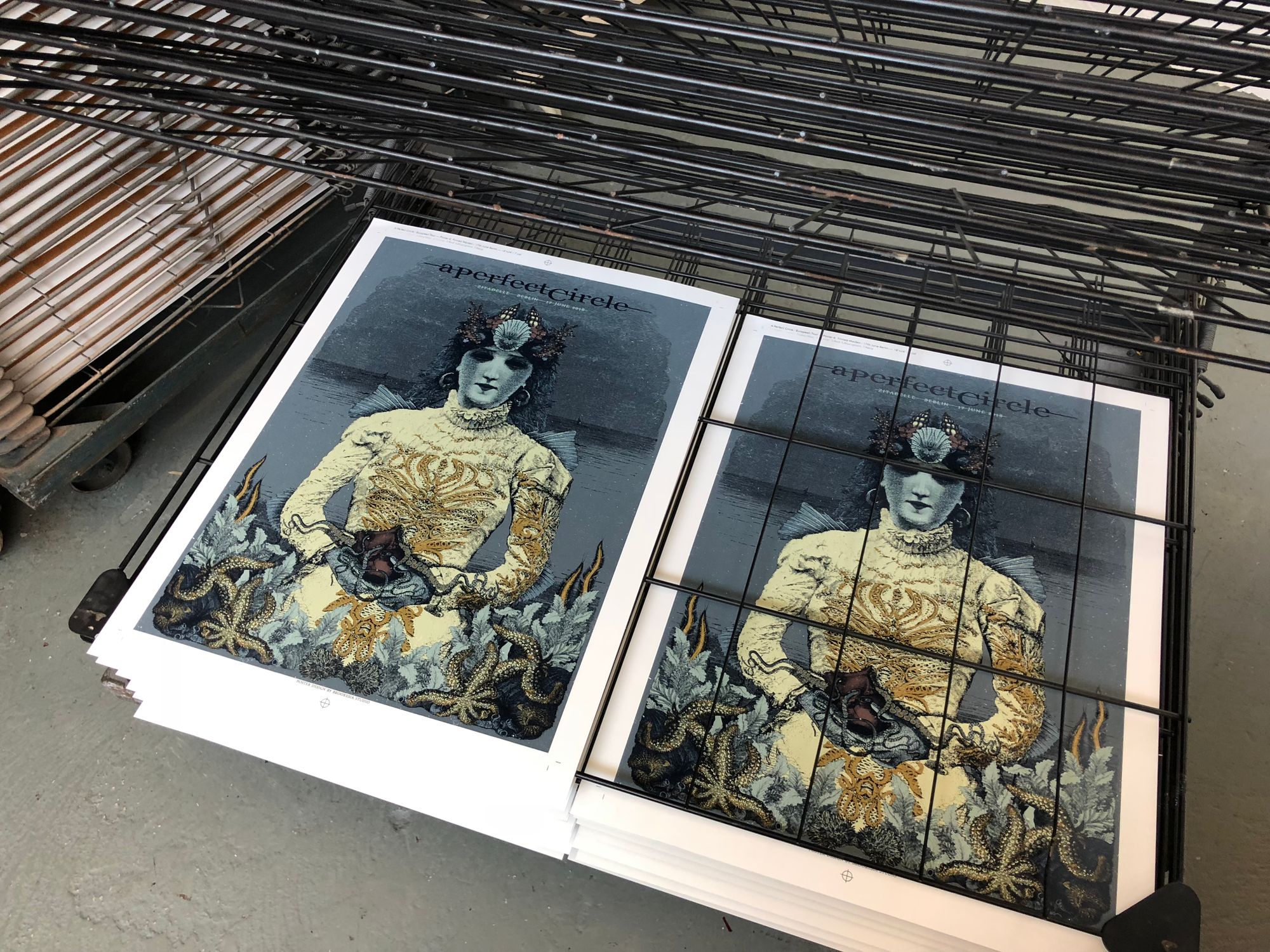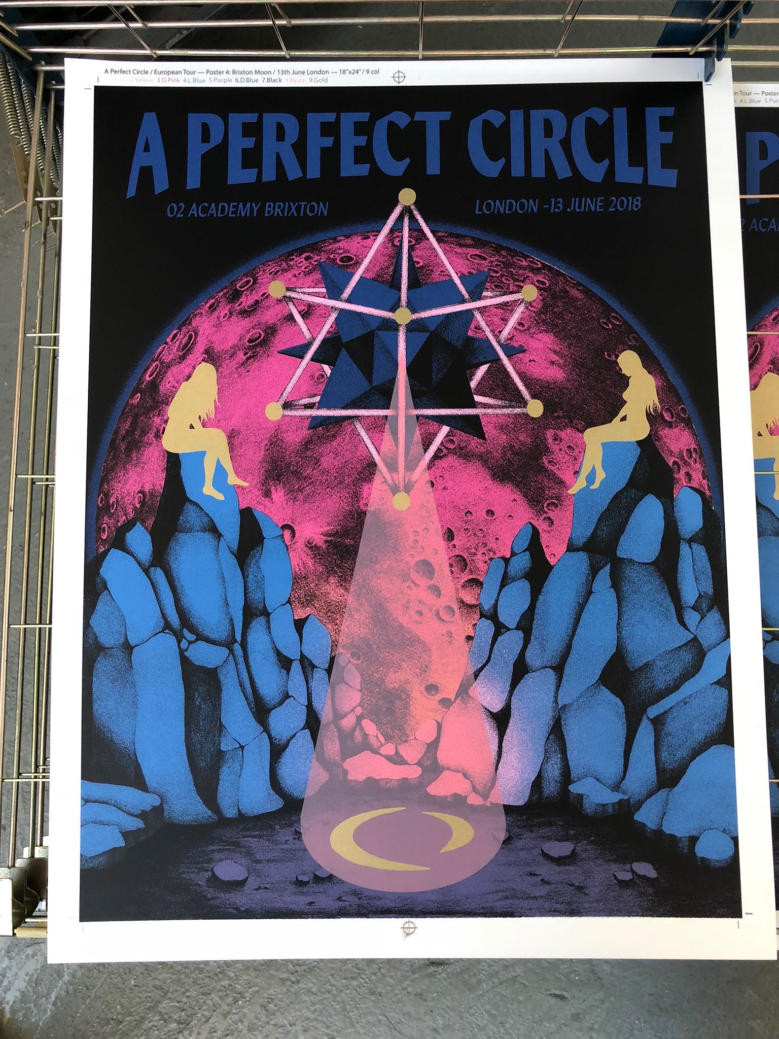 We had the great pleasure of screenprinting eight posters for the European leg of A Perfect Circle’s tour, which we worked on over a busy nine-day period in early June. With all AP's long since in the hands of the artists, and having never shared these posters on our blog, it's exciting to reveal this fantastic body of work.