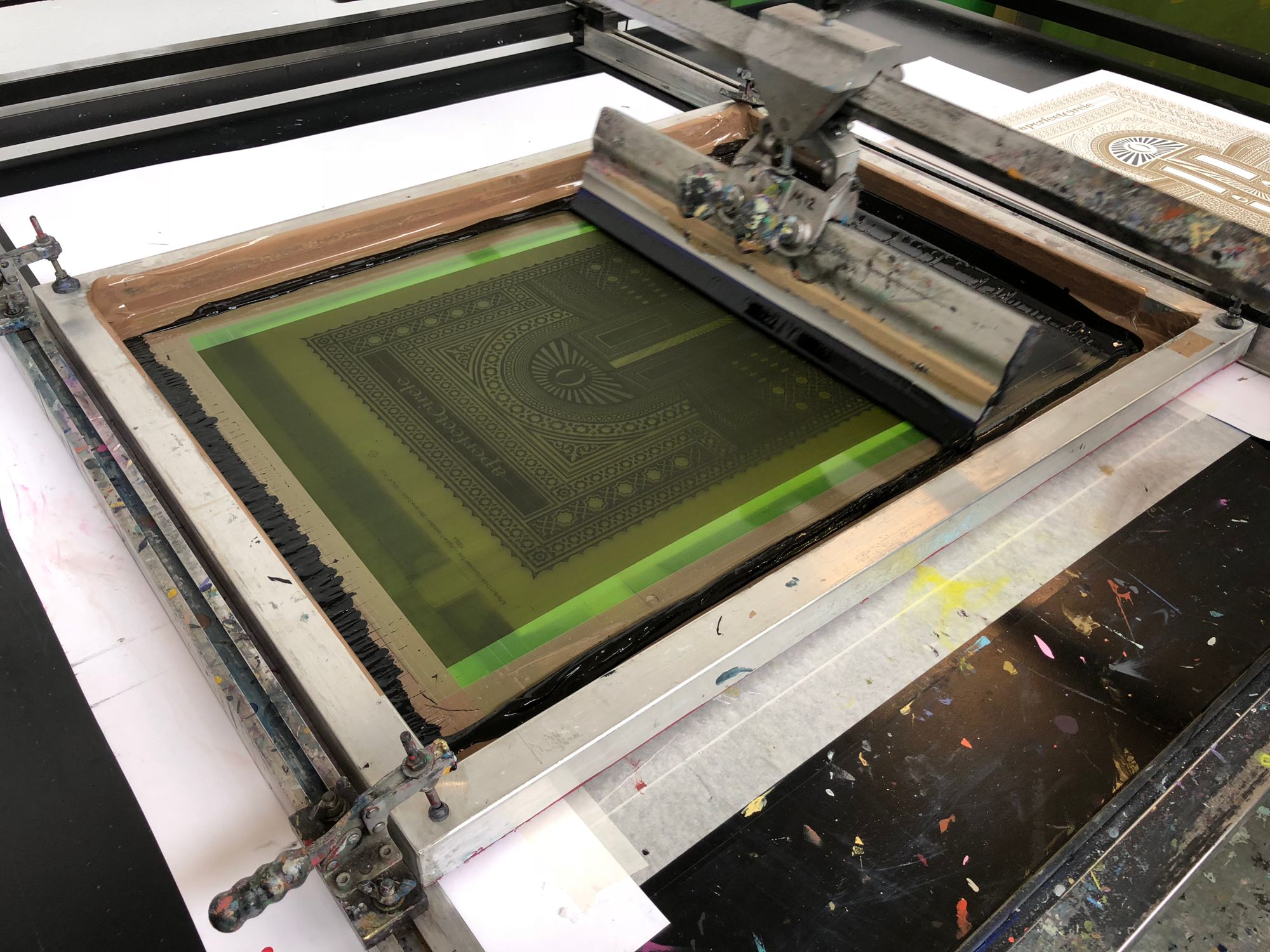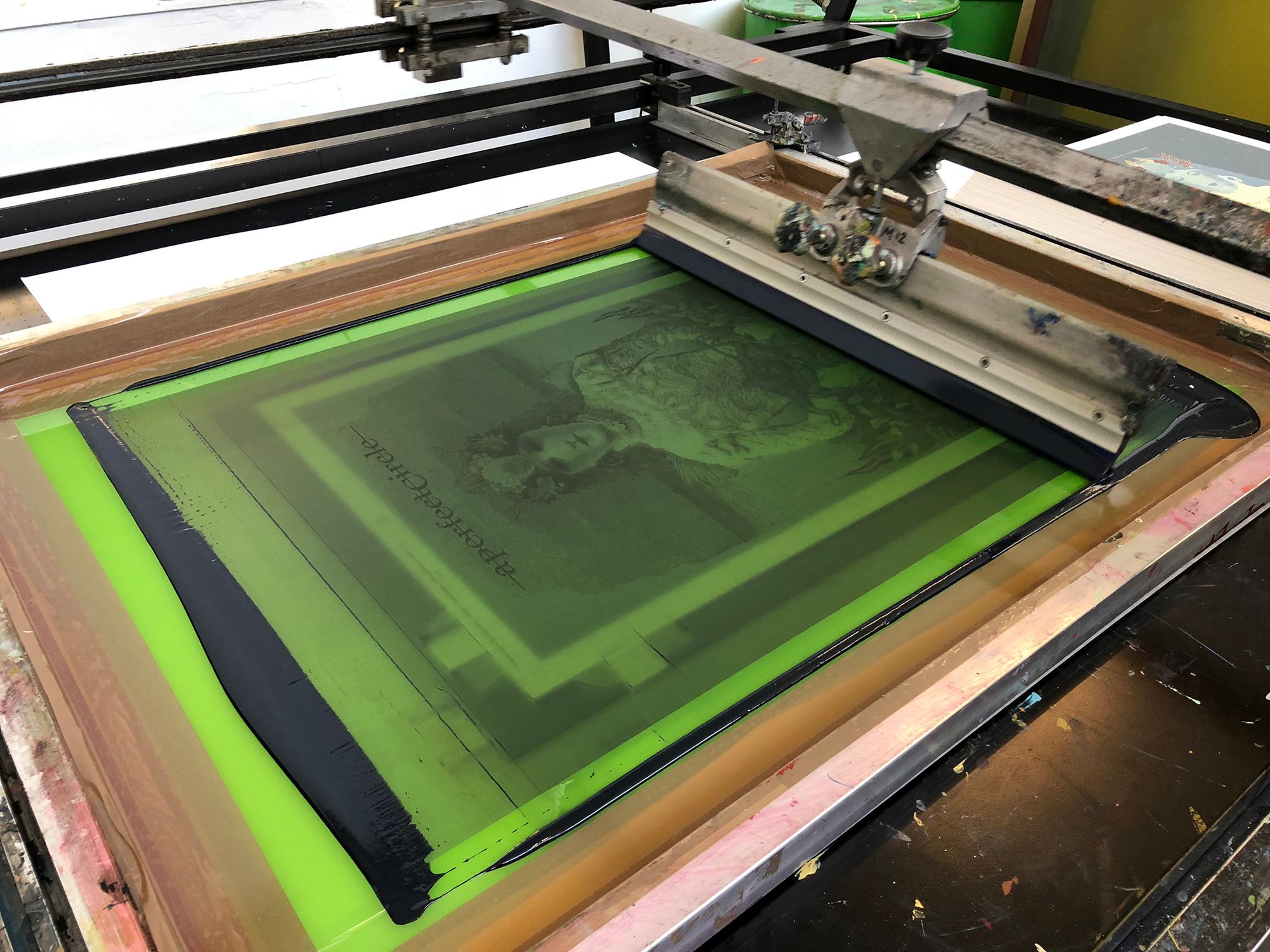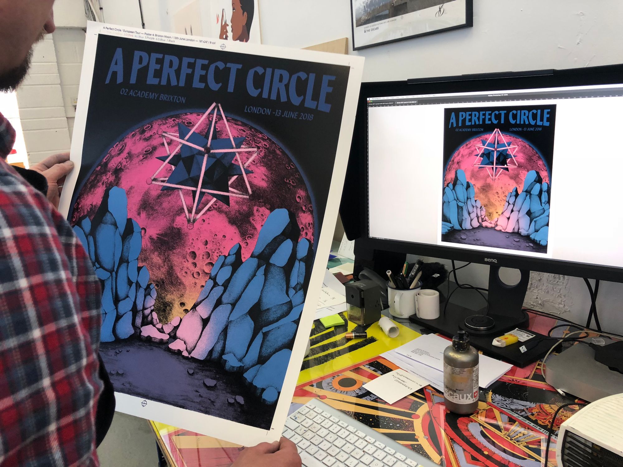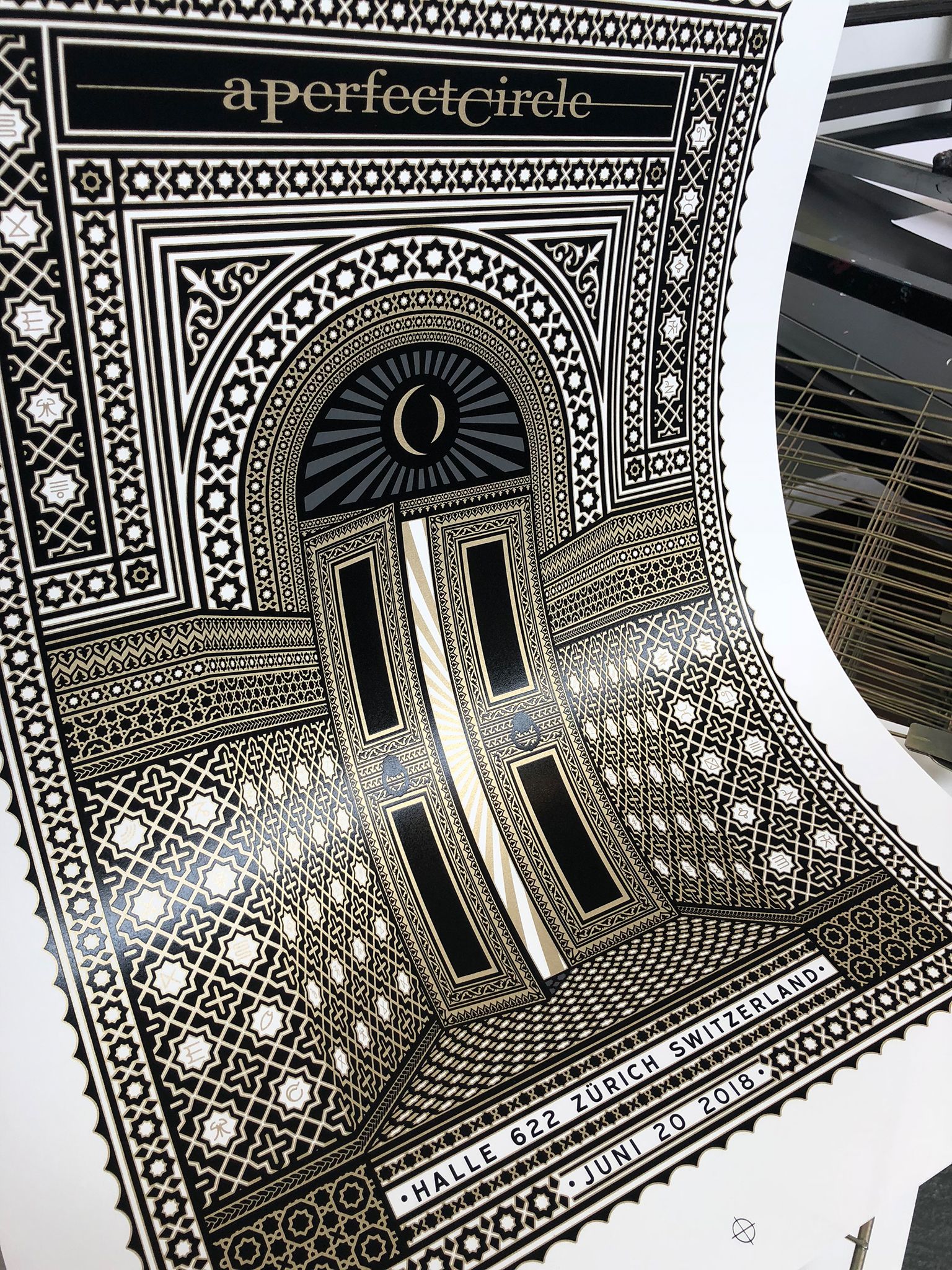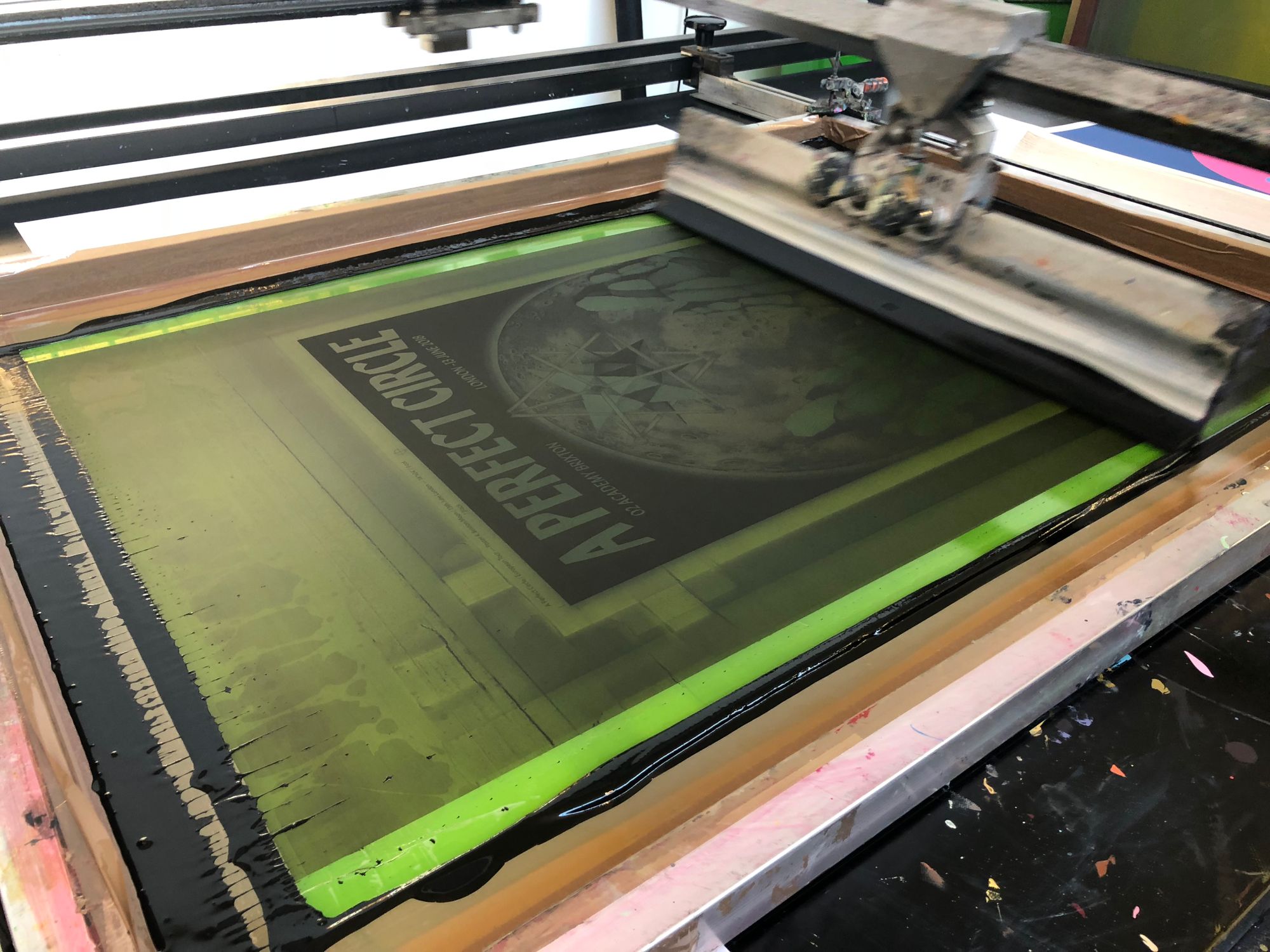 We had the great pleasure of screenprinting eight posters for the European leg of A Perfect Circle’s tour, which we worked on over a busy nine-day period in early June. With all AP's long since in the hands of the artists, and having never shared these posters on our blog, it's exciting to reveal this fantastic body of work.