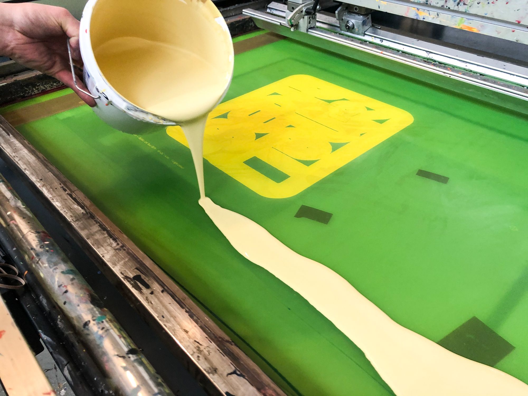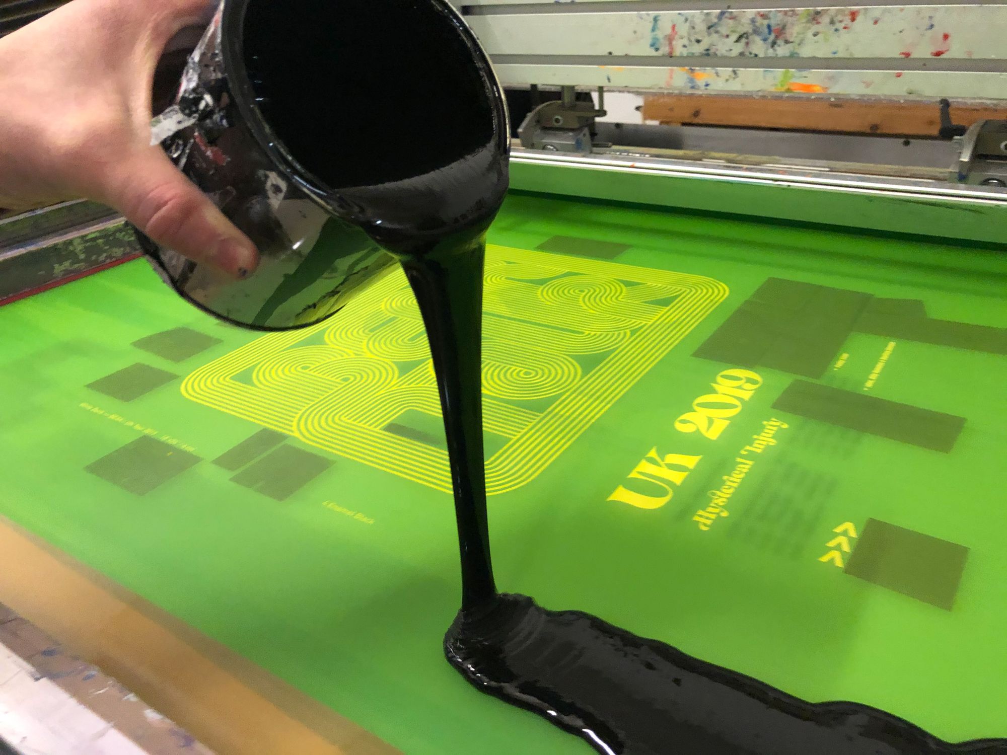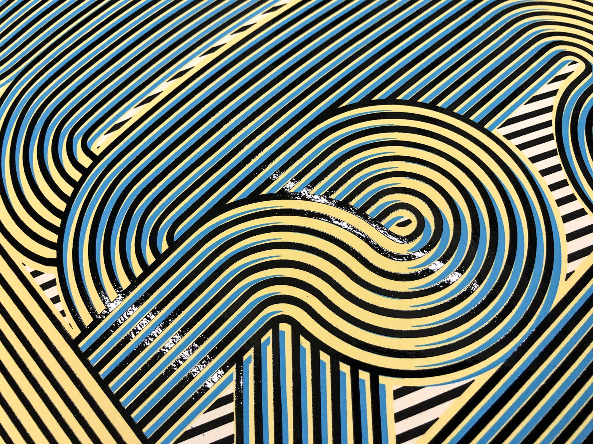This is an 18”x24” edition of 200, printed in 4 colours onto 285gsm speckled Woodstock Betulla paper. There are two blacks inks in the print, one of which has a super high-gloss enamel finish.