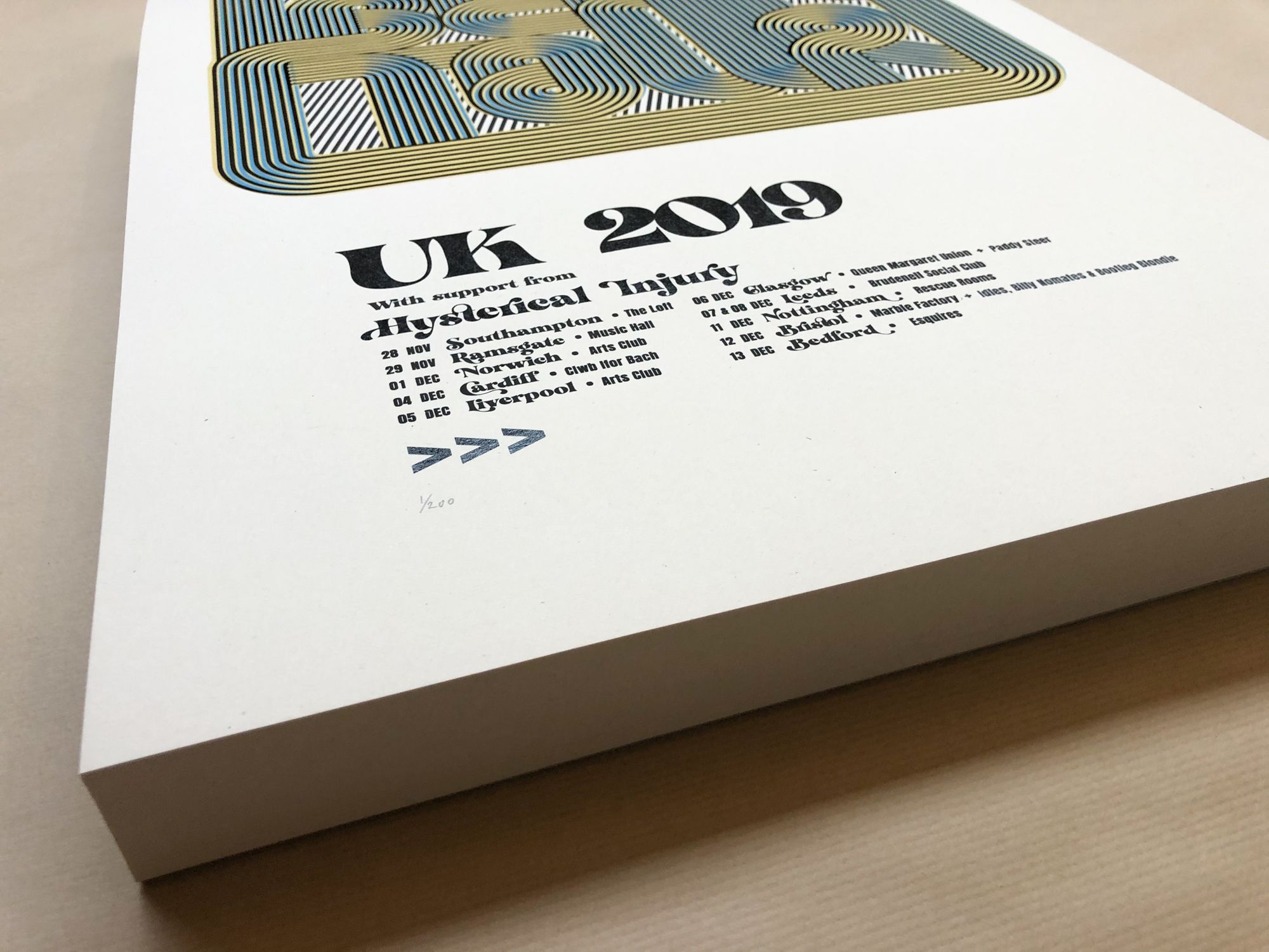 We’re big fans of the band and approached them a couple of months ago to propose designing and printing a poster for their then-upcoming tour. The result is this wonderful coming together of typography and print. Thank you, BEAK>, for the opportunity, and best of luck with the tour!
