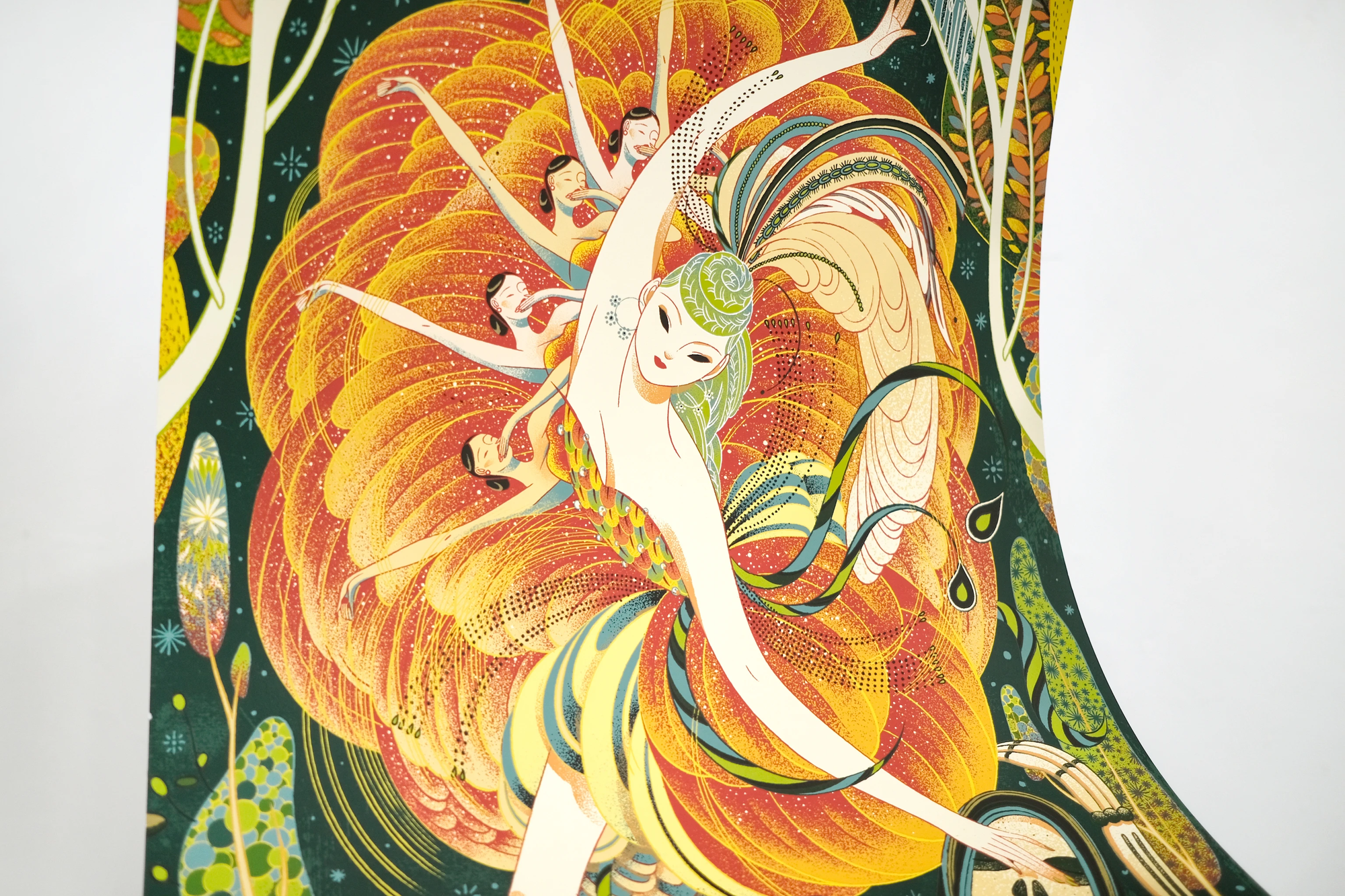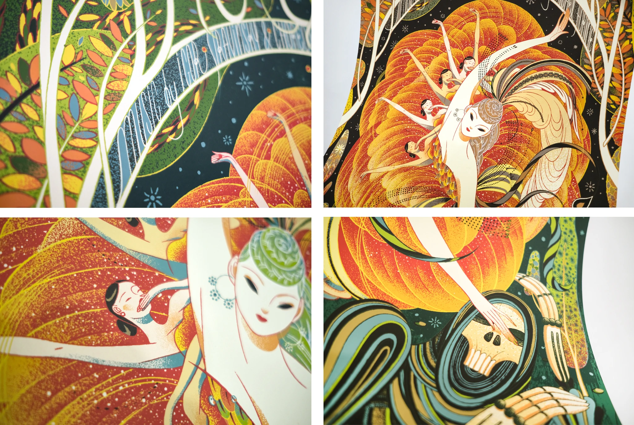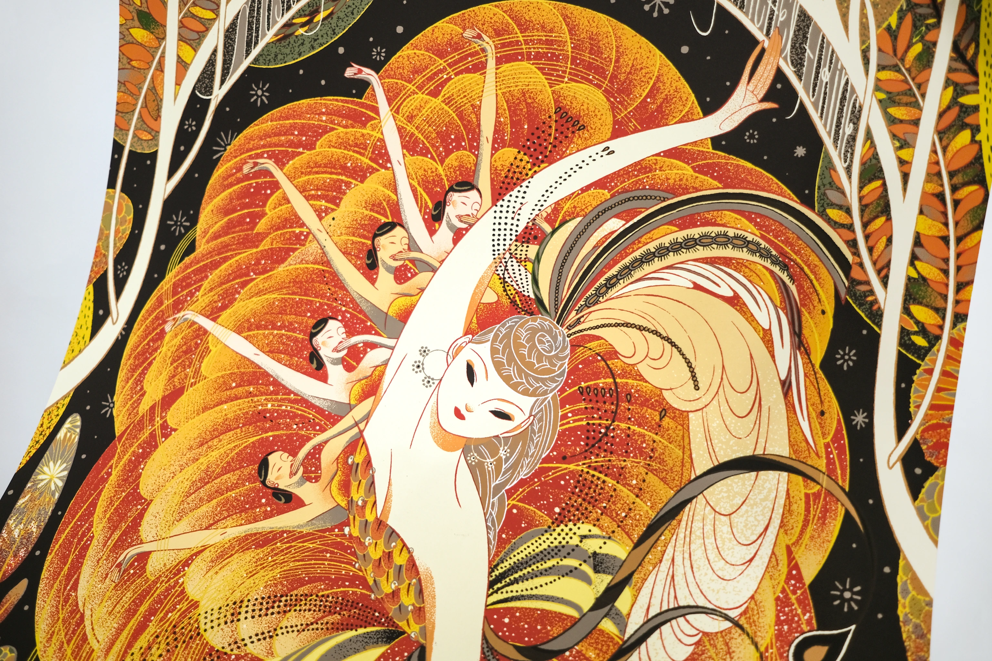 Firebird makes for a resonant next release in the gallery's Ballet Series of prints, a series which has been art directed by the highly talented Nicolas Delort. The work that goes into bringing such illustrations to life in print, starting at the concept phase with the artist, is not to be underestimated. Before we ourselves set eyes on the final artwork, there will have been an in-depth process of collaboration between the artist, art director, and the gallery. Hugely commendable work, and remarkable when considering the level at which the finished piece was delivered. Then a whole new block of work begins, which isn't simply sitting down and separating the artwork for print — there is much conversation about how the illustration will translate to the medium, there is a long list of decisions to make about how the artwork's colours will layer up and interact with one another, and then the separation work finally begins.