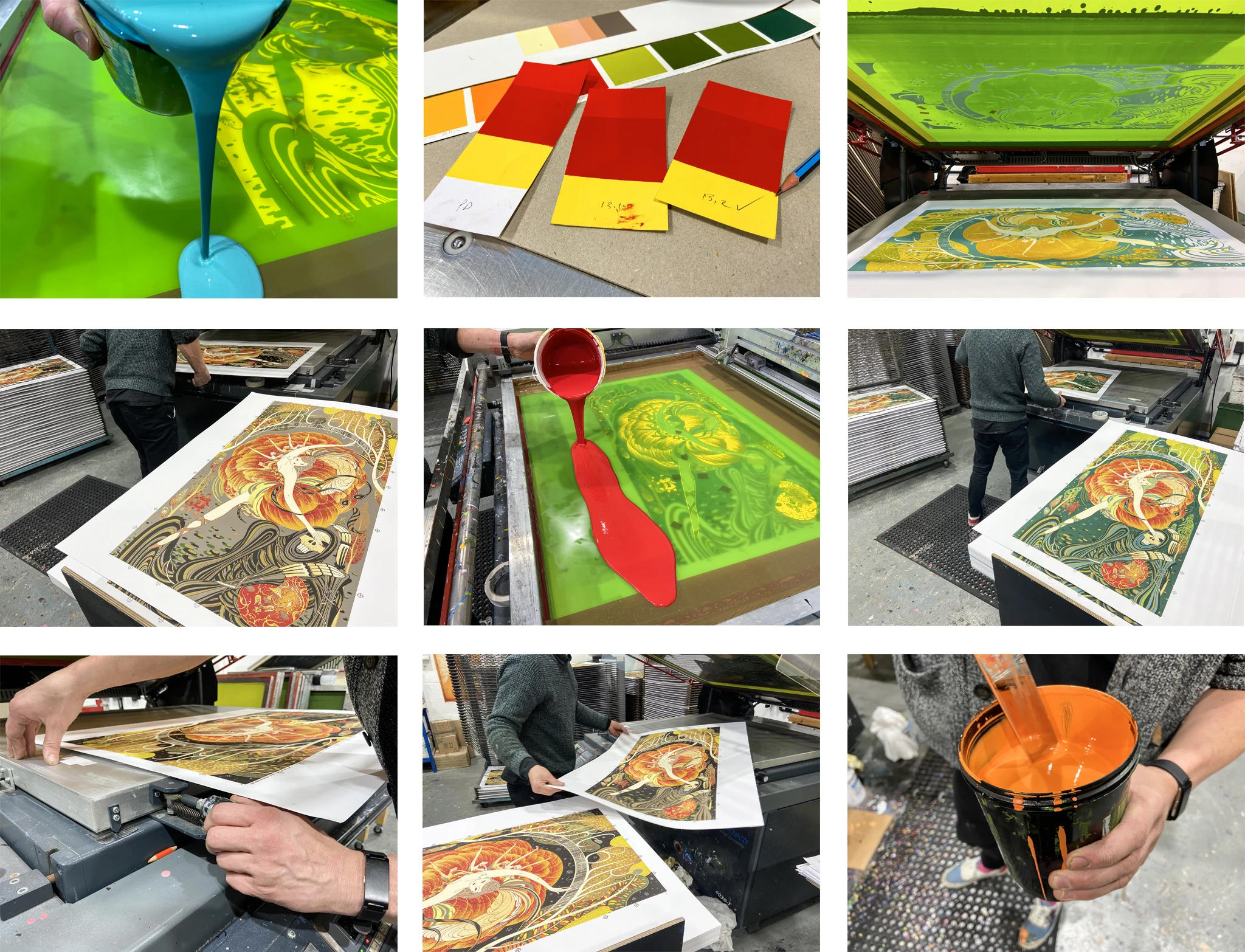 Firebird was separated for print and screen printed at the White Duck Editions studio in a 21 colour Eternal Variant edition of 100+AP's and 19 colour Infernal Variant edition of 50+AP's. Both prints 18"x36" on 300gsm Gmund Bauhaus paper.