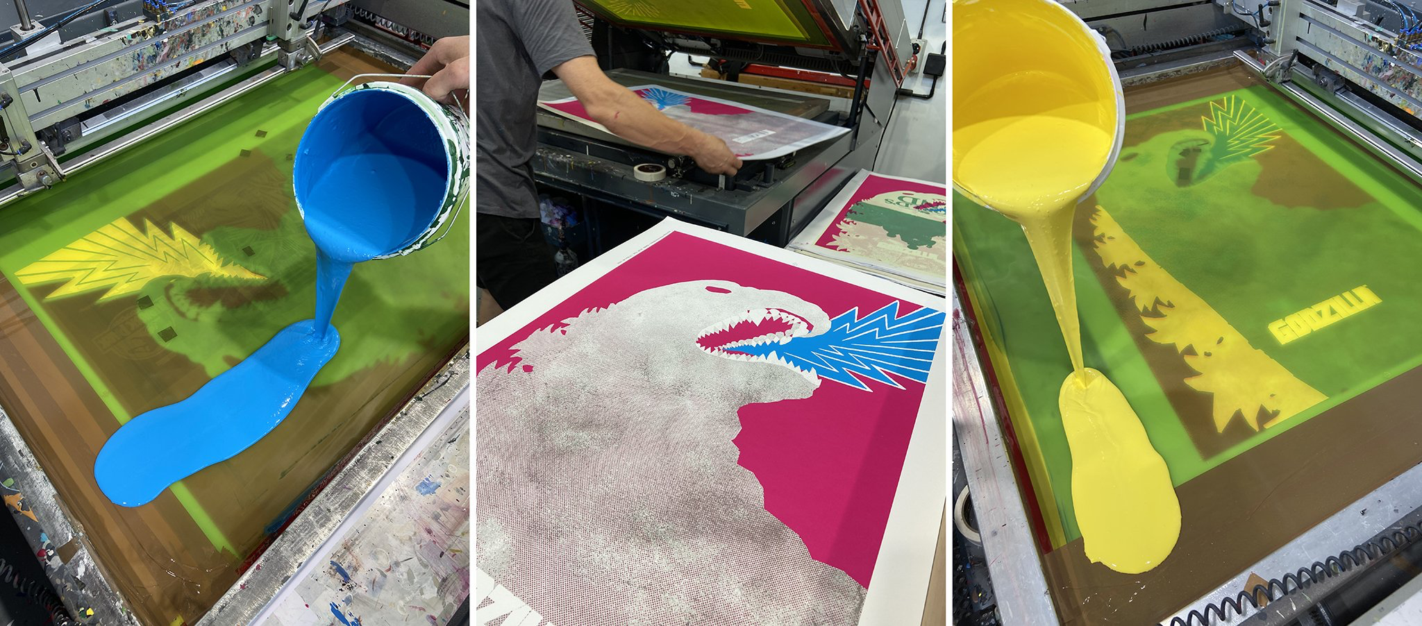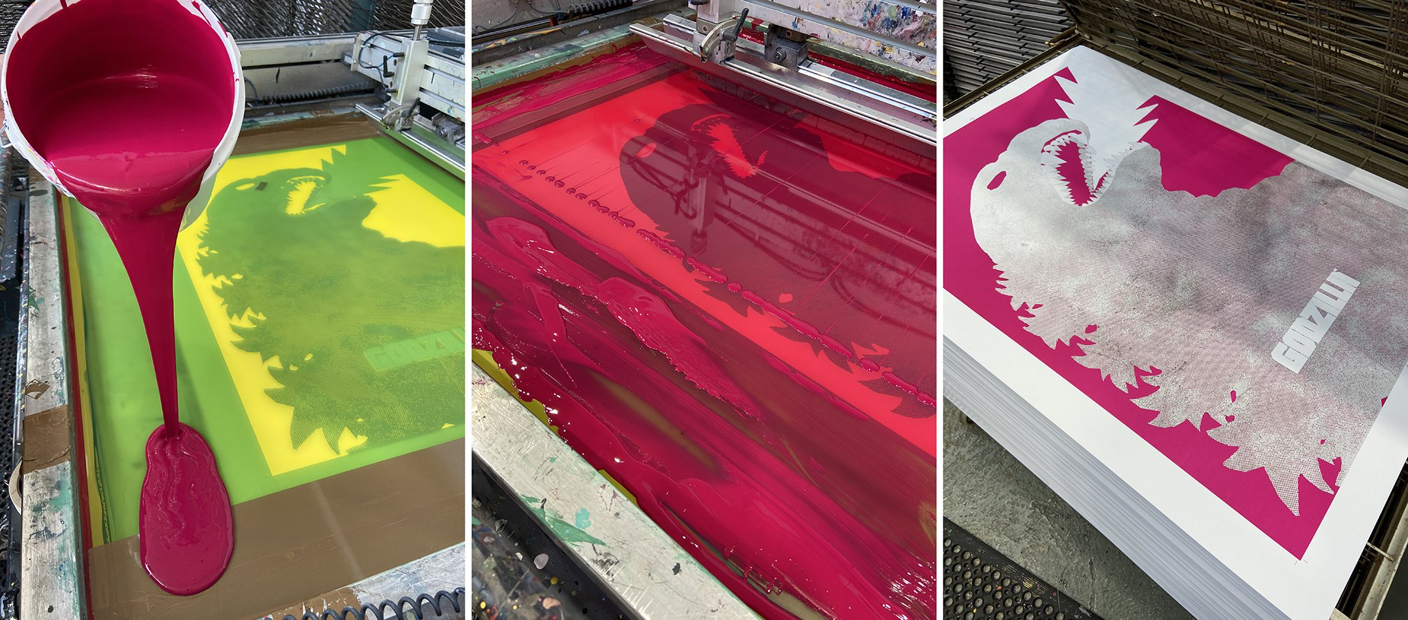 ‘Godzilla’ was screenprinted at the White Duck Editions studio in a 24”x36” worldwide edition of 300 + AP’s. 5 colours on 300gsm Gmund Bauhaus paper, using a mixture of opaque, translucent, and semi-fluorescent inks.