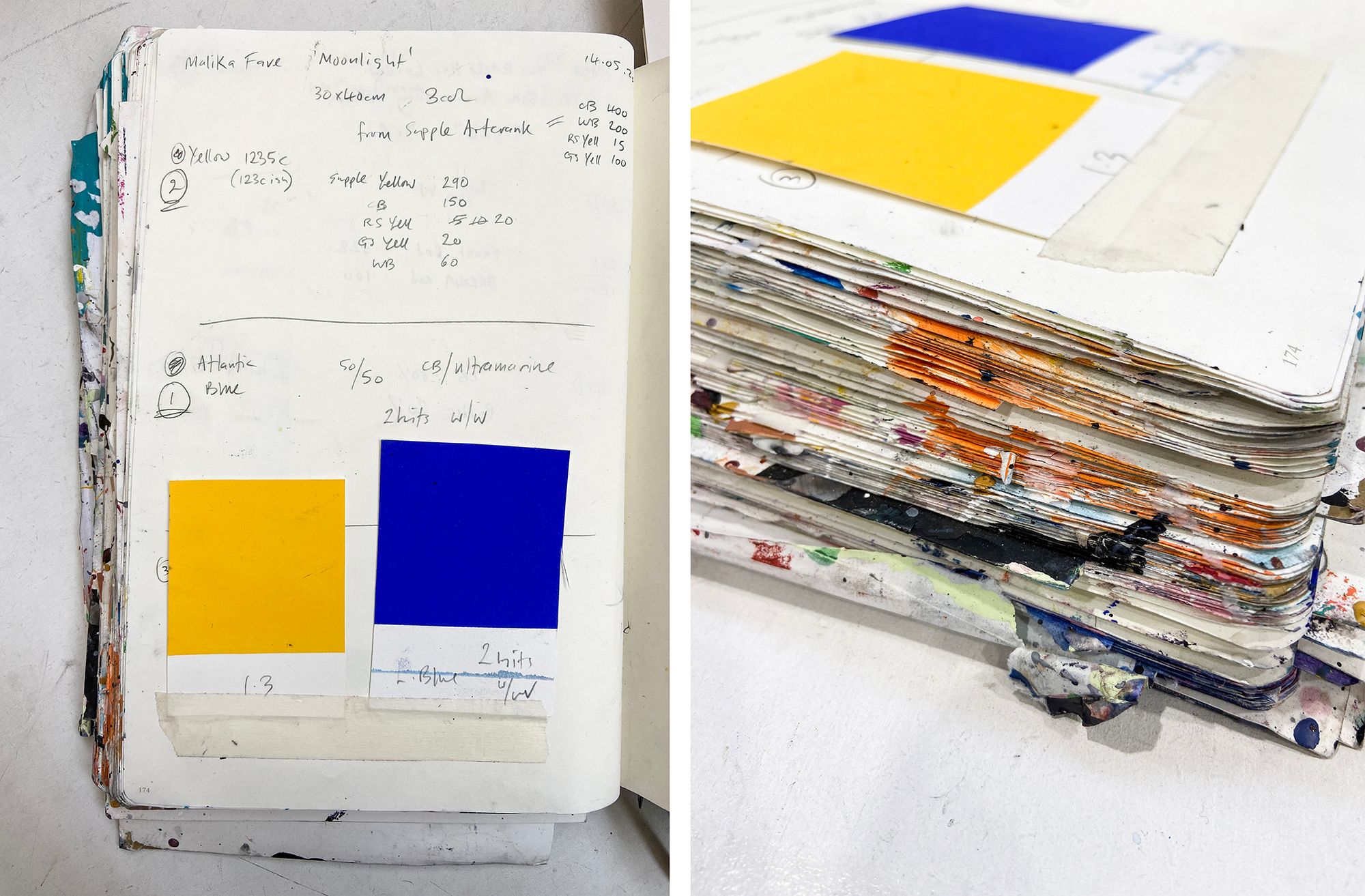We find the screenprint medium to be perfect for exploring these rarefied sensorial experiments of colour. There is a controlled consistency to the process that allows us to work systematically through a range of shades, to arrive at one colour—or depth of colour—that does just the right thing when printed.