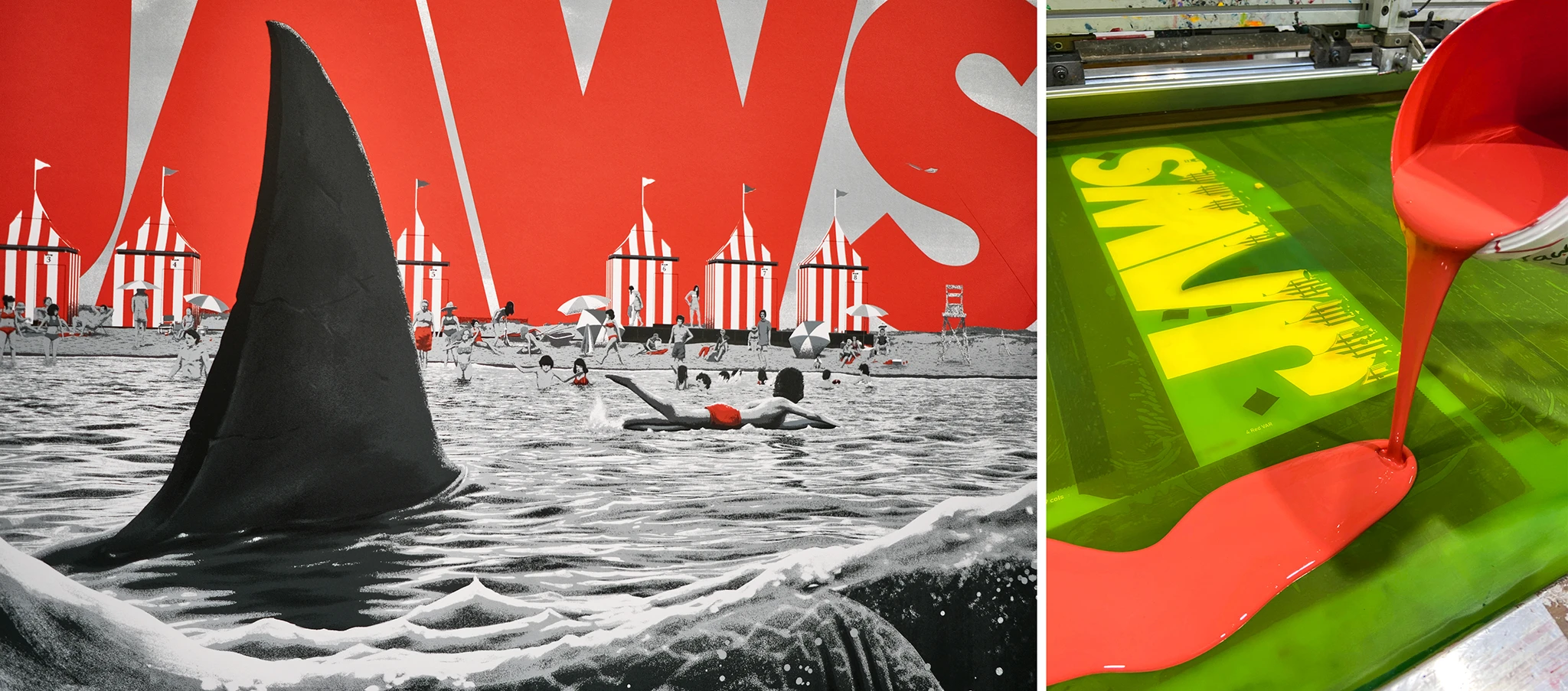 Florey’s art for this poster really is fantastic, and we had a great time building it up in 9 layers. There were a couple of screen changes between the regular and variant edition, most notably in the red, where the subtle Jaws title of the regular makes way for the bloody and foreboding title of the grey variant. The variant colour-scheme feels strangely reminiscent of another Spielberg film—Schindler’s List—where at one point the scenes of chaos are poignantly punctuated by the presence of a young girl’s red coat. The coat is later seen discarded and in tatters, much like the yellow lilo of the Kintner boy, found eddying in the gentle surf.