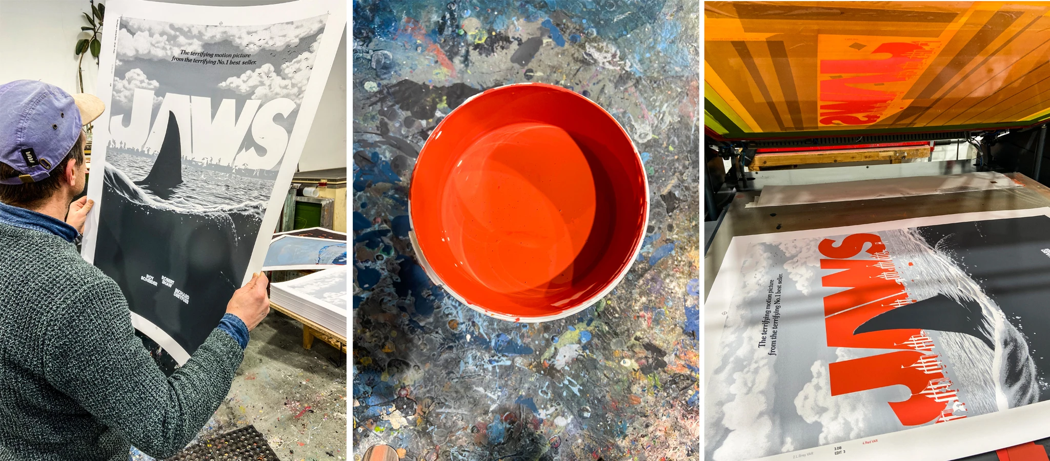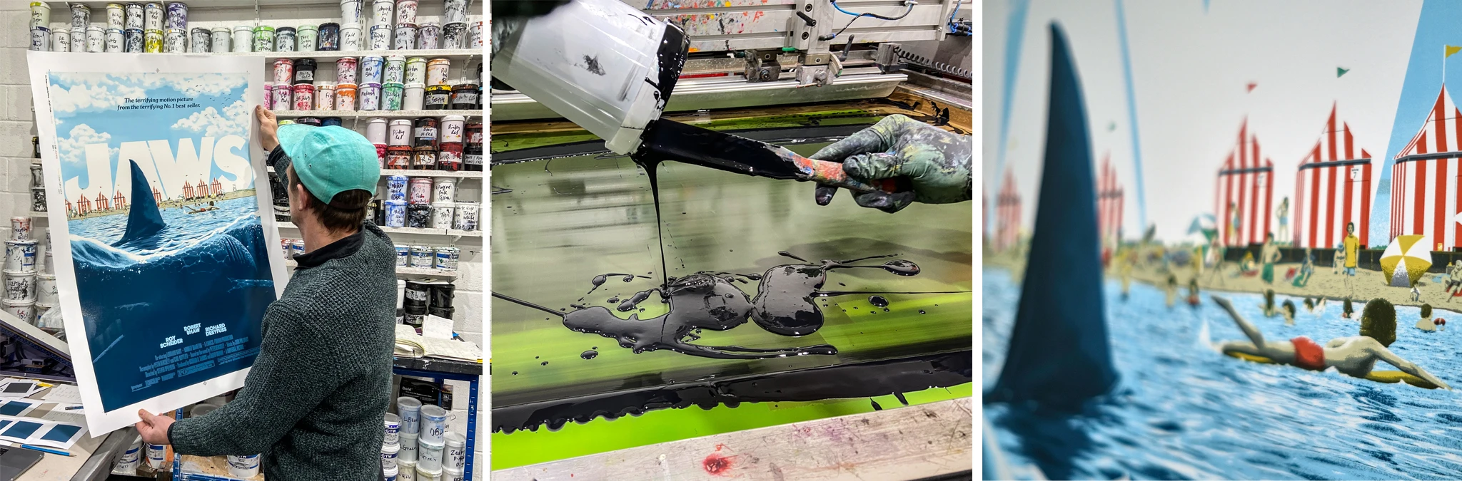 Jaws was screen printed at White Duck in editions of around 200 regular & 100 variant. Both editions were 24”x36” and 9 colours, printed on 300gsm Gmund Bauhaus paper.