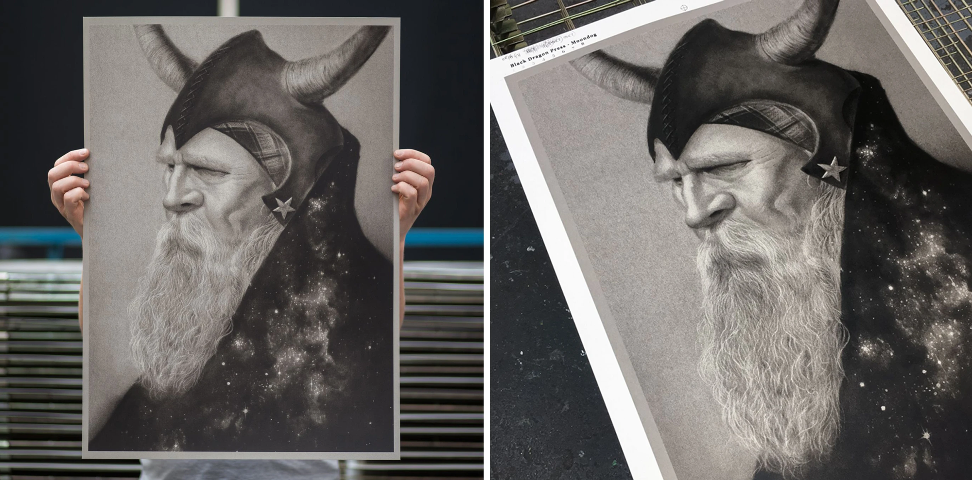 The Ruas editions were closely followed by an excellent portrait piece by Randy Ortiz, depicting the instantly recognisable Viking of 6th Avenue, Moondog. Our understanding is that this piece was commissioned out of a simple love for jazz, on the part of James, the Black Dragon Press proprietor. In any case, the superb pencil drawing by Ortiz translated wonderfully to screen print (below).