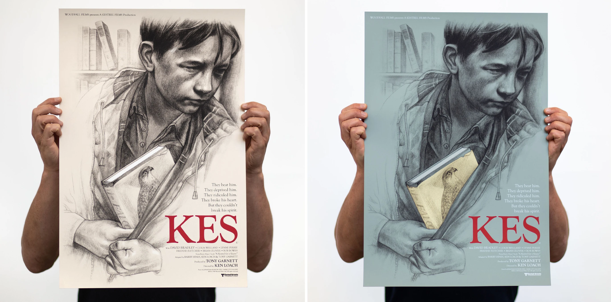 More recently, we got to work on a fantastic project with Dark City Gallery and Jonathan Burton, which celebrated the 50th anniversary of Ken Loach’s classic British film, Kes. Jonathan captured the conflicted expression of Billy with a real tenderness and lightness of touch. The moment depicted is when Billy takes the falconry book, gifting himself something when he already has so little. From the point of view of the screen print, it was hugely rewarding to create such a faithful translation. As part of the project, Dark City Gallery produced a wonderful film, which puts a spotlight on the creation of the poster and the history of Loach's film. We’ve posted it below, for your pleasure.