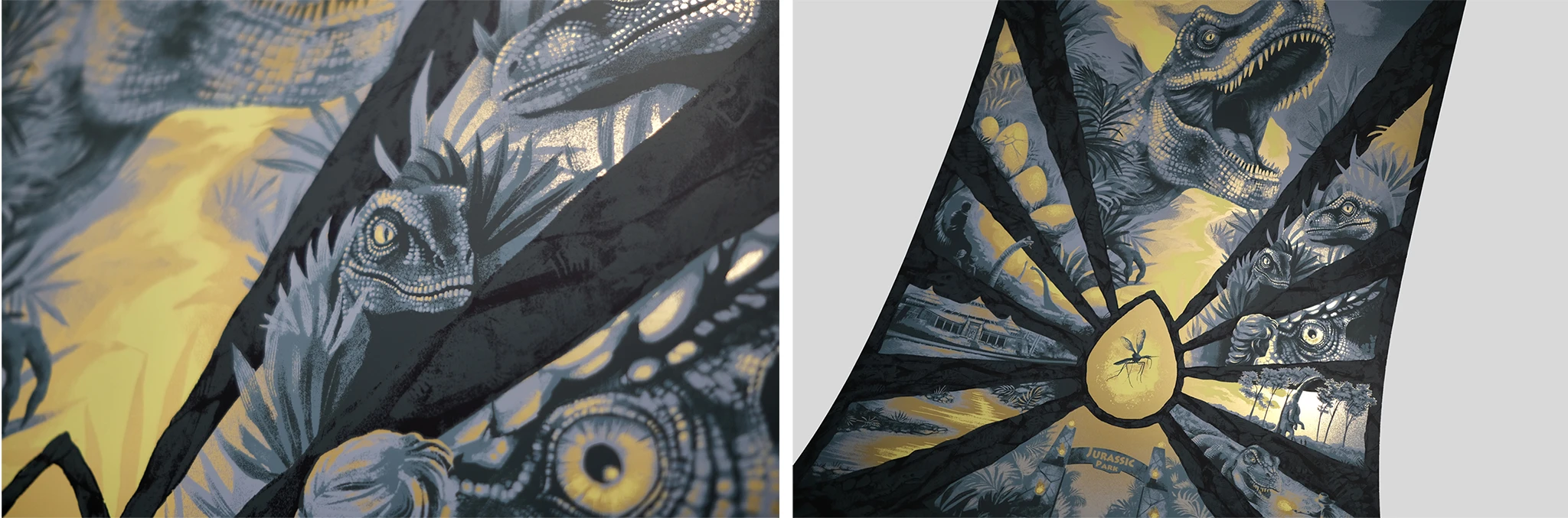 Jurassic Park was screen printed at White Duck Editions, in a 5 col, 24”x36” regular edition of 150+AP’s on 285gsm Woodstock Giallo paper & variant edition of 75+AP’s on 275gsm Matte Gold Mirri Foil.