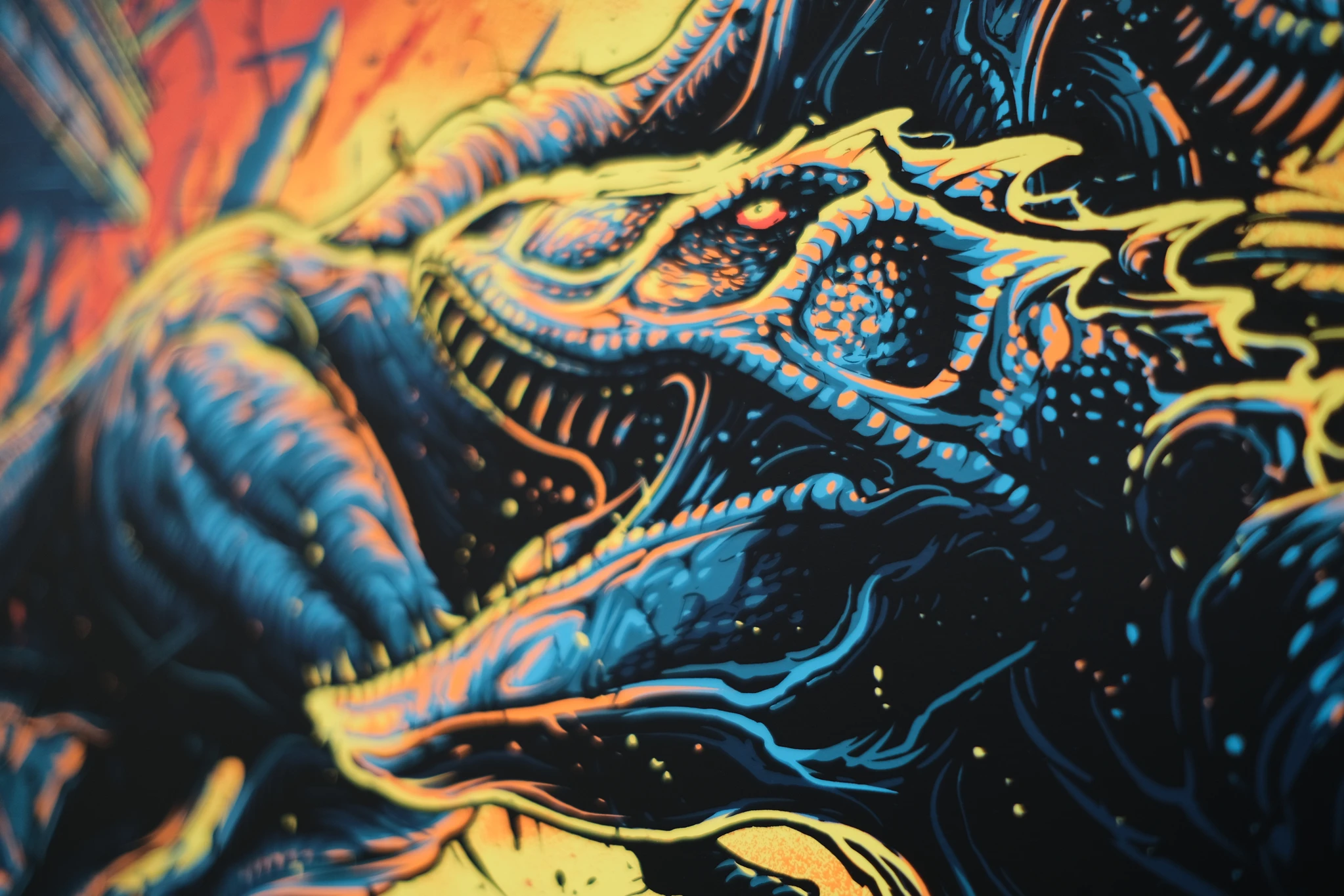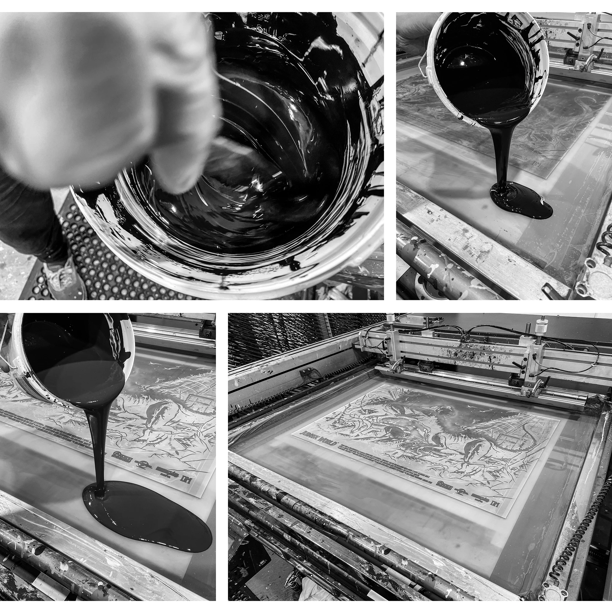 It’s an epic artwork, full of energy and bombast, and was so enjoyable to screen print. It’s been a few years since we produced any of Dan’s work, and many years (8-10?) since we printed what were some of his earliest horror editions. His artwork always packs a punch and has layers of delicate depth, but the evolution and refinement in his style is abundantly clear to see.