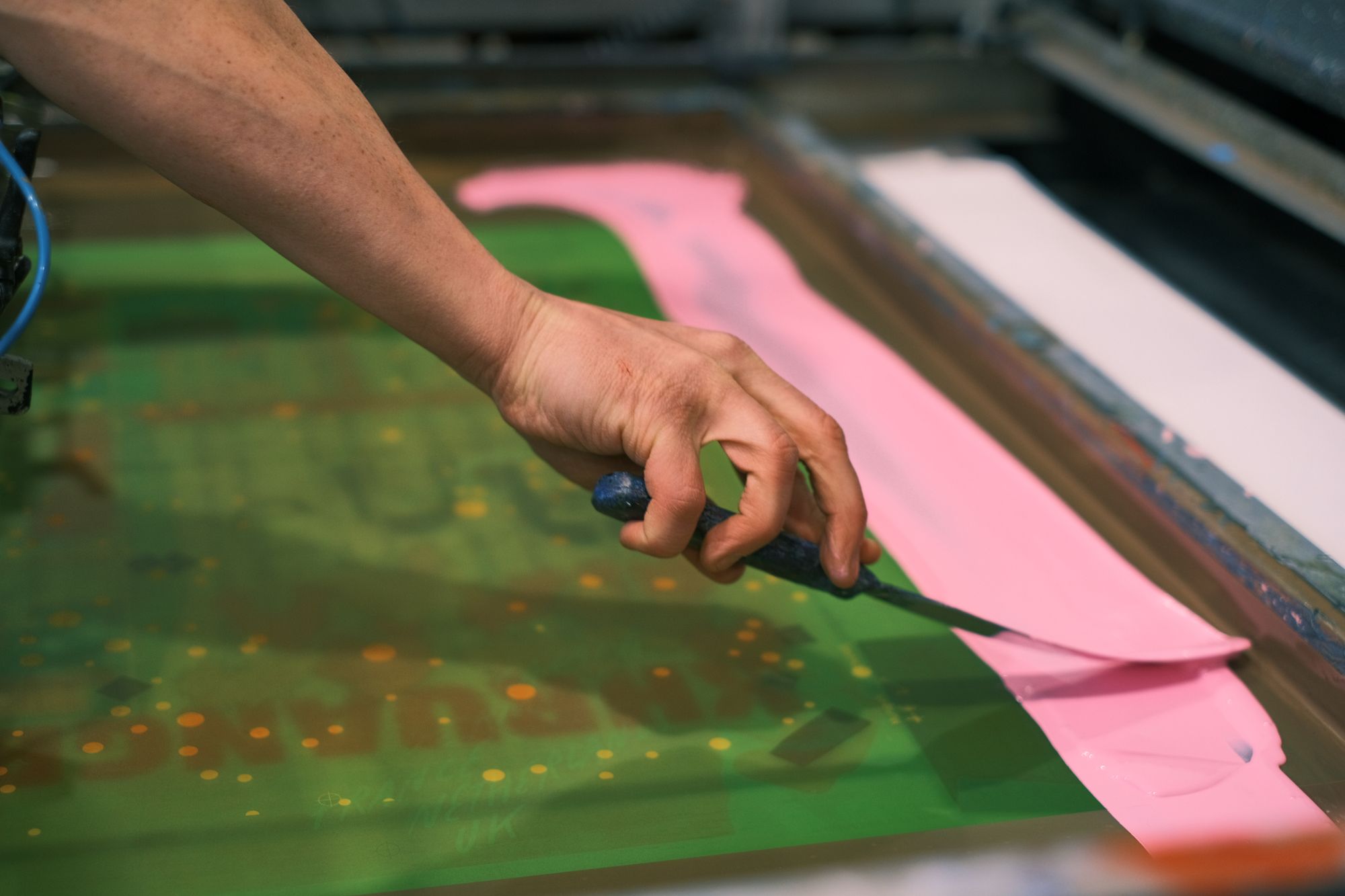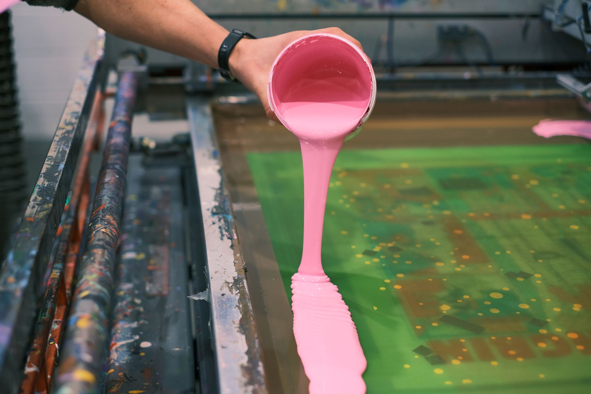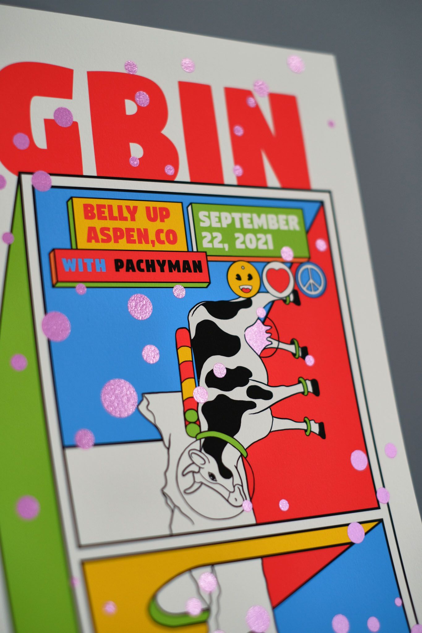 Khruangbin at Belly Up in Aspen follows in a similar vein, insomuch as the edition is primarily a giclée, printed on 100% cotton paper, and with a screenprint embellishment. However, this time around the metallic has given way to a pink enamel ink that has been built up with repeat layering. The finish is tactile and glossy and provides a striking contrast to the bright, flat, detailed tones beneath.