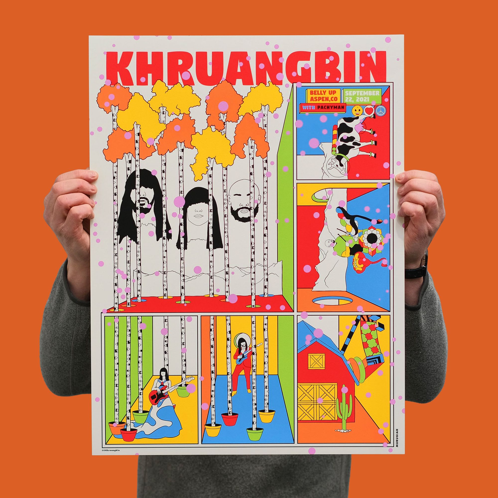 Murugiah, master of bold colour and surrealist composition, releases a unique artist’s proof edition of his superb Khruangbin poster artwork.