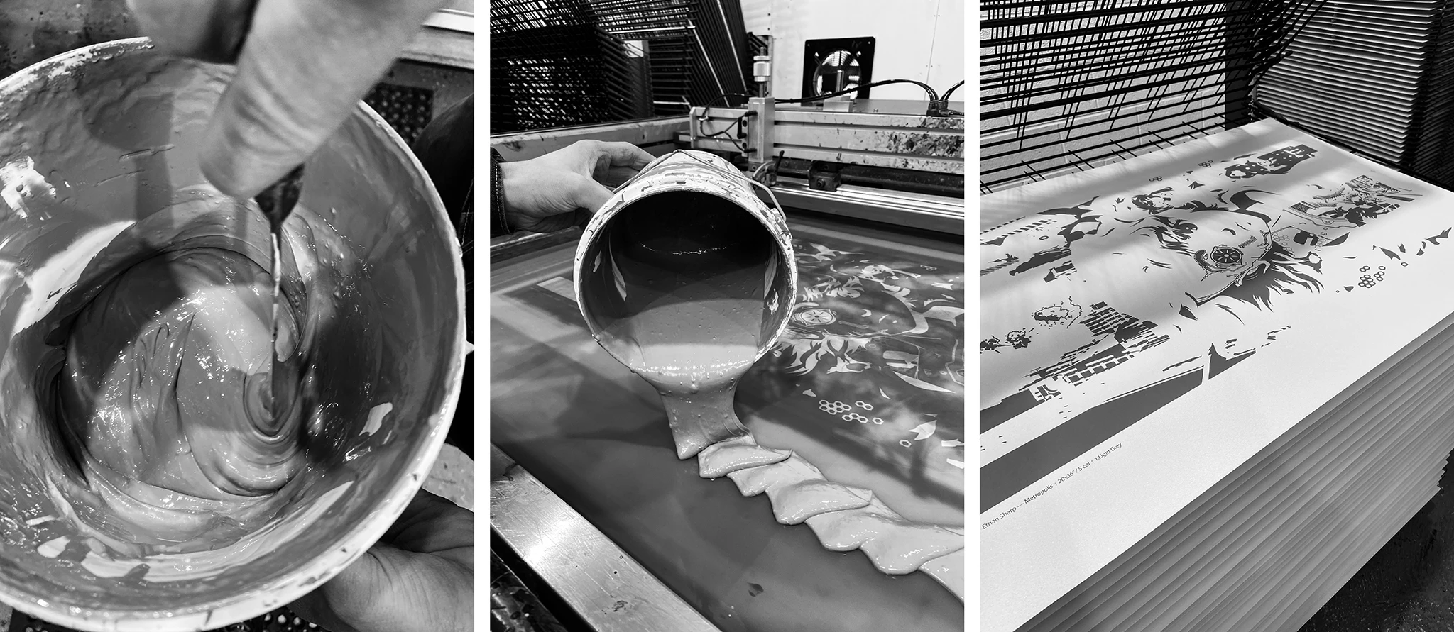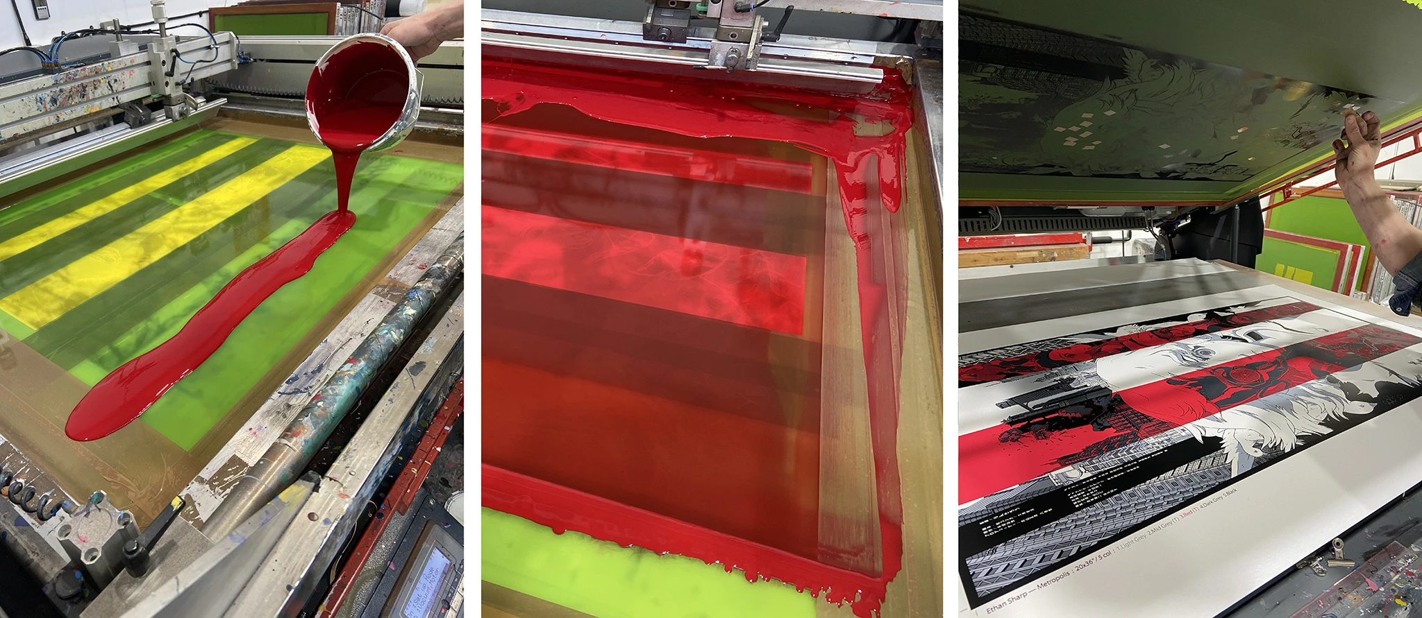For Metropolis, we worked with Ethan in a very similar way to Perfect Blue, which involved a thorough colour matching process and discussion about papers. The screen print is comprised of five colours, which are two opaque greys, one translucent grey, a highly pigmented translucent red, and black. The red sits midway in the print order, overlapping the first greys to create a series of red tones, with dark grey and black running over the top. A sheer registration takes place down each side of the red columns, which is critical in maintaining the integrity of the illustration.
