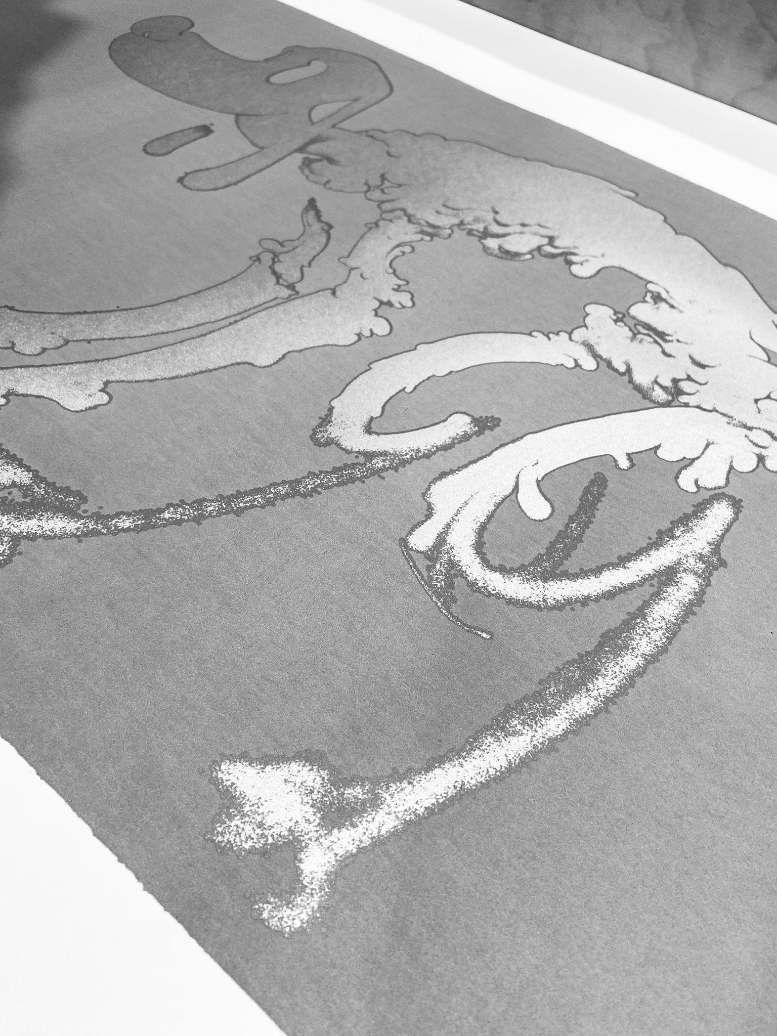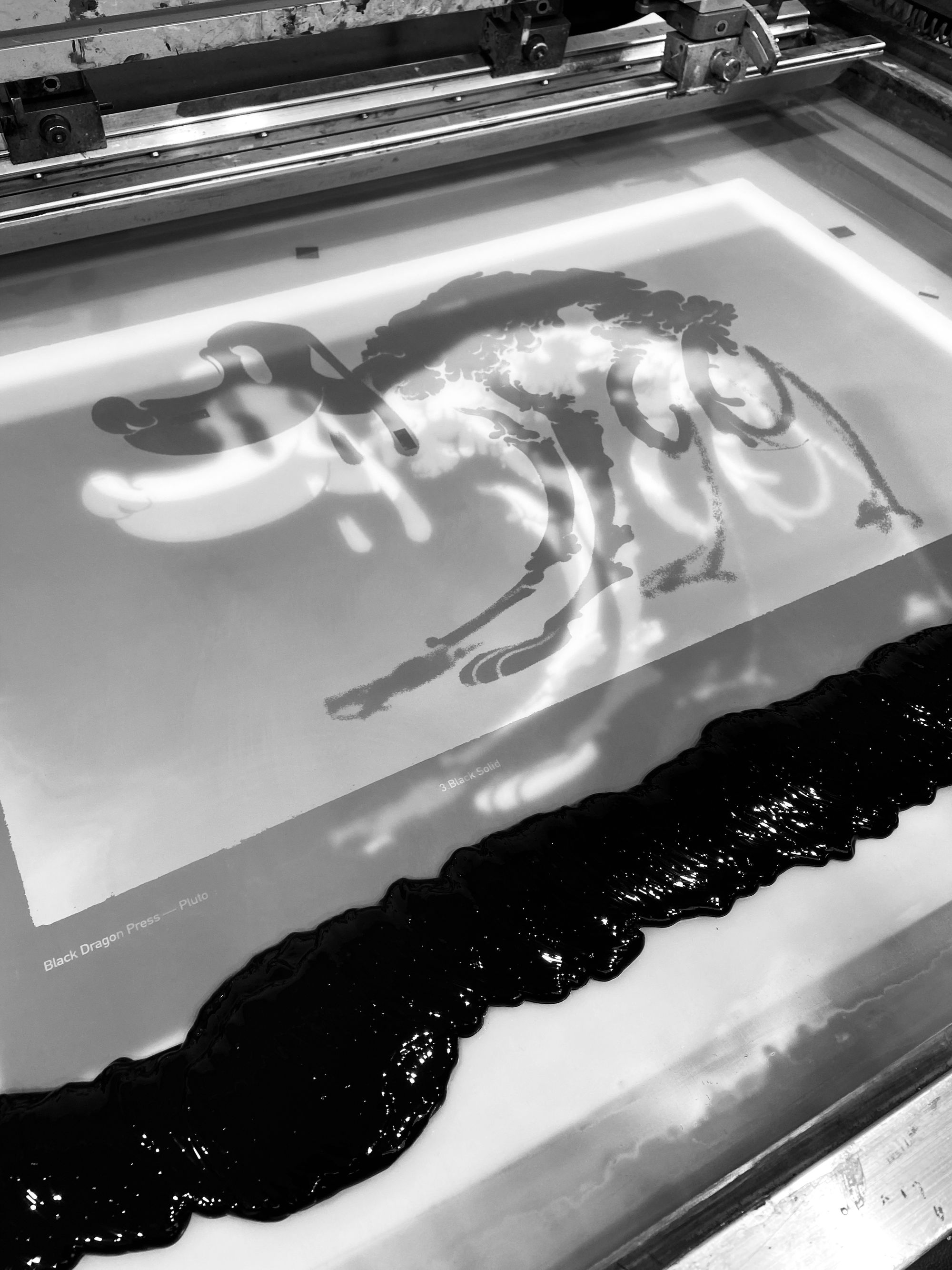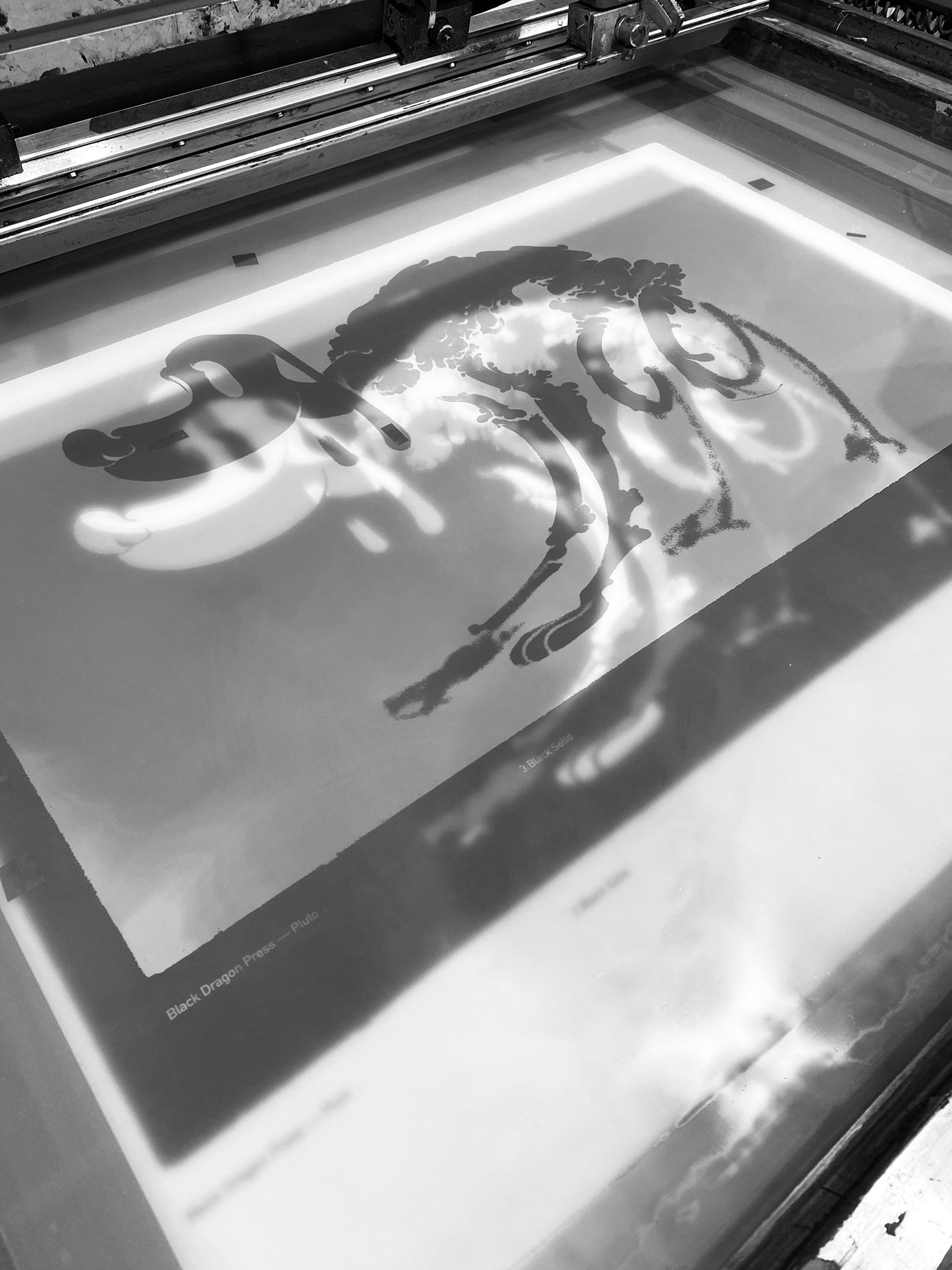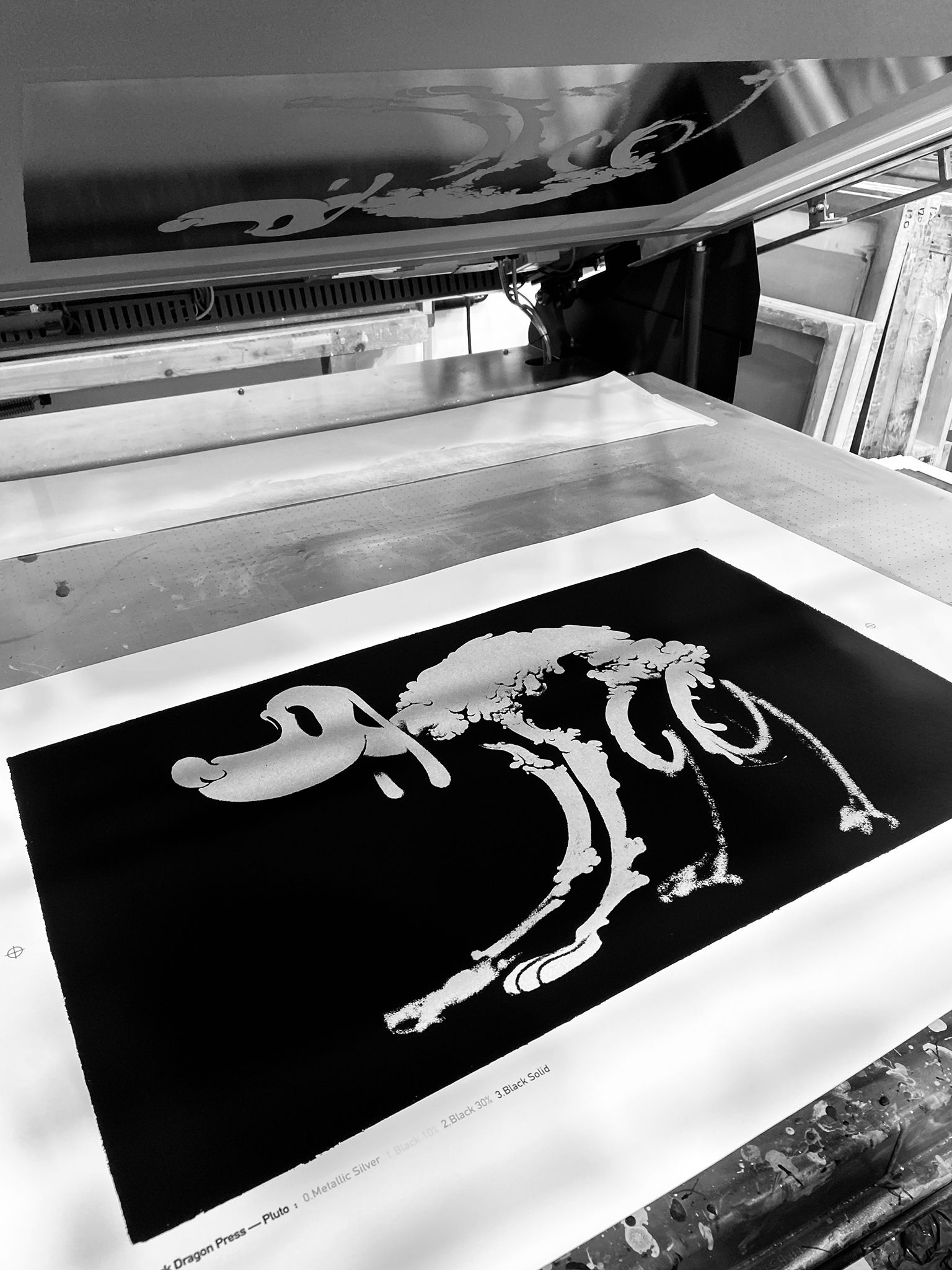 The print begins with a lustrous metallic silver, followed by two translucent blacks, which build the body of the print and add detail to the character, and finally, an opaque black is added, to give the edition its dense, heavy feel.