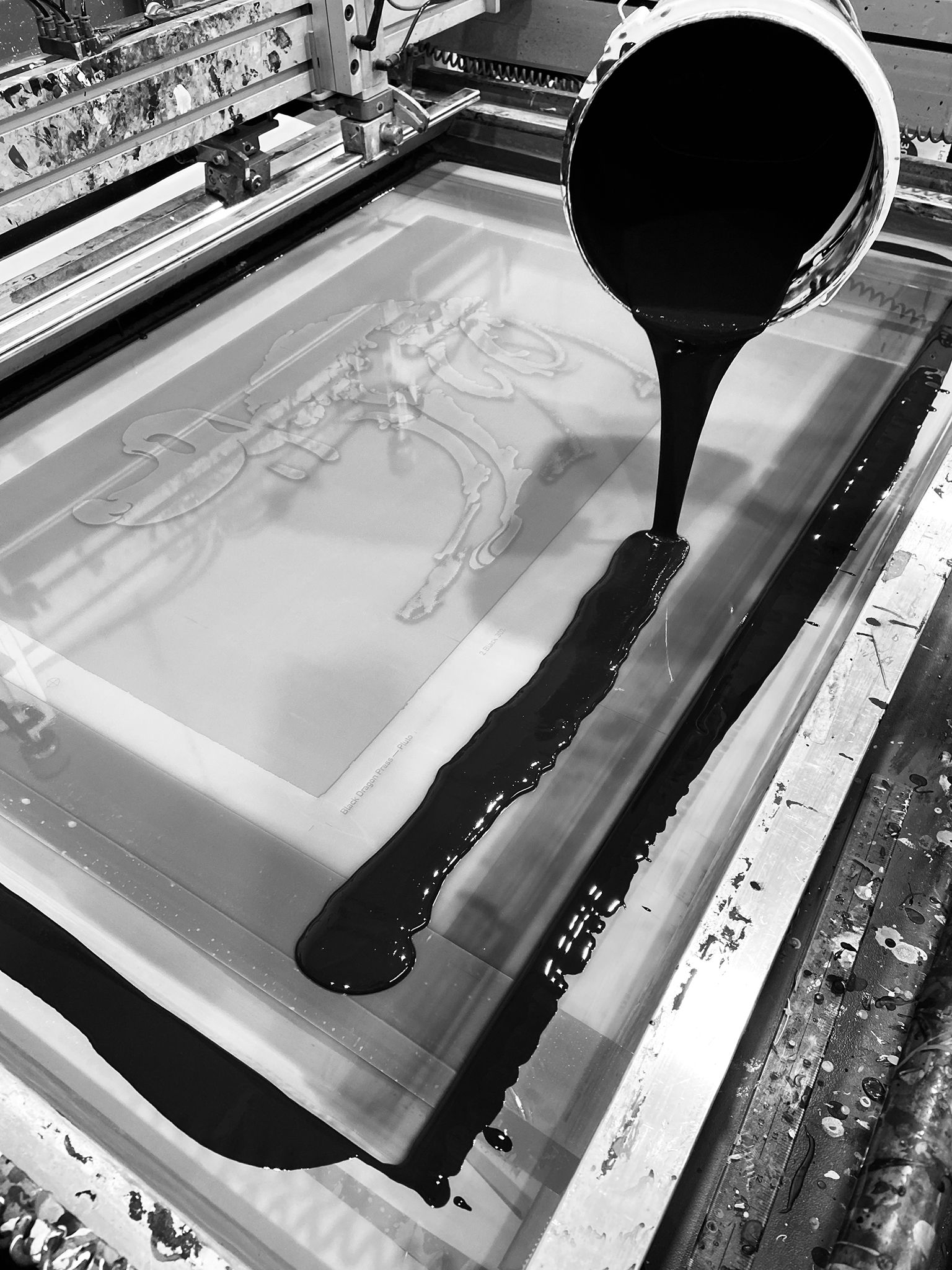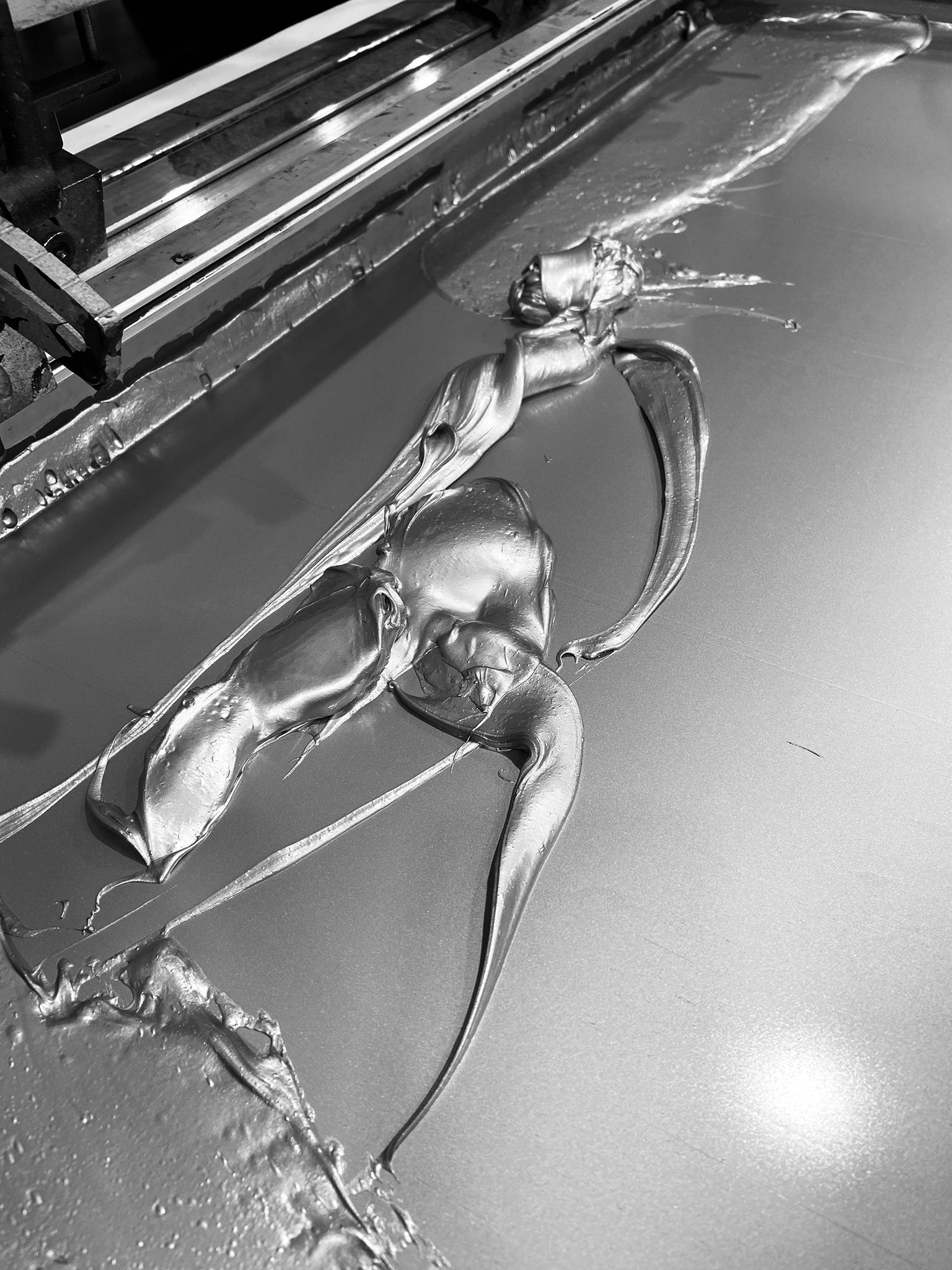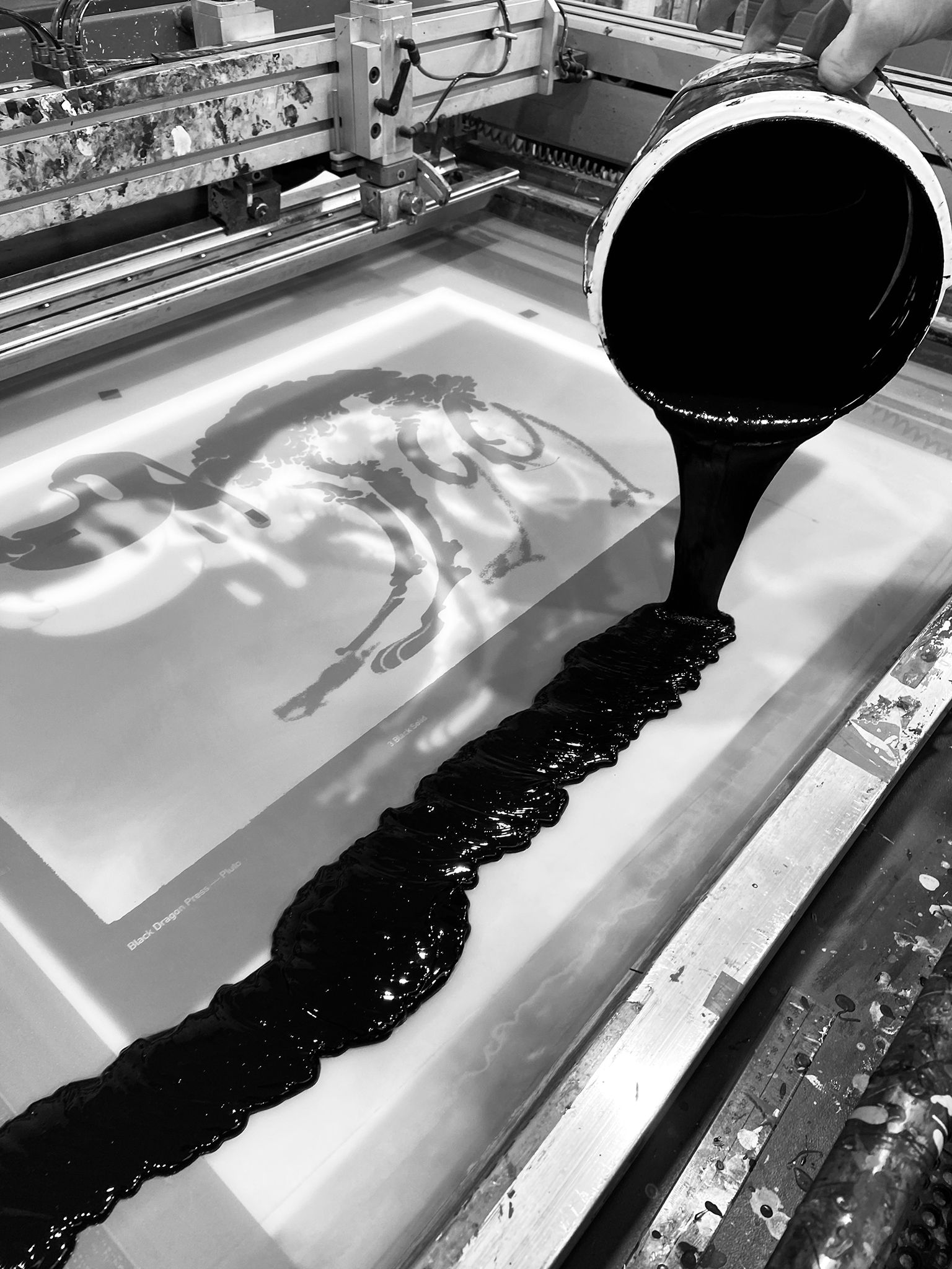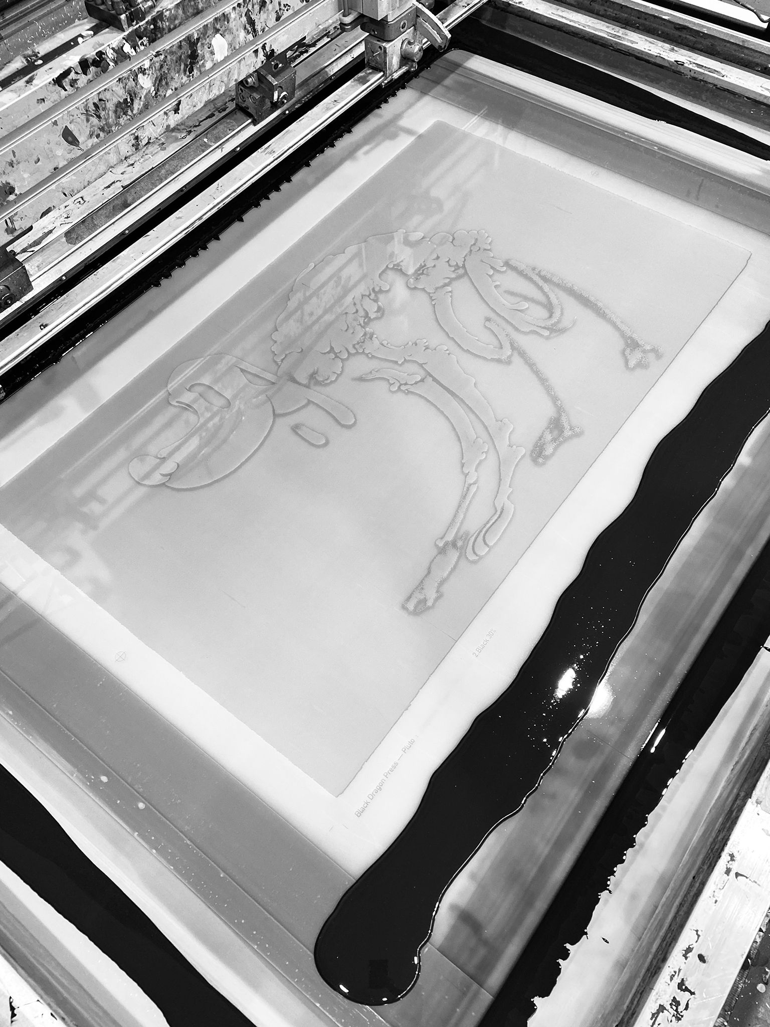 The print begins with a lustrous metallic silver, followed by two translucent blacks, which build the body of the print and add detail to the character, and finally, an opaque black is added, to give the edition its dense, heavy feel.