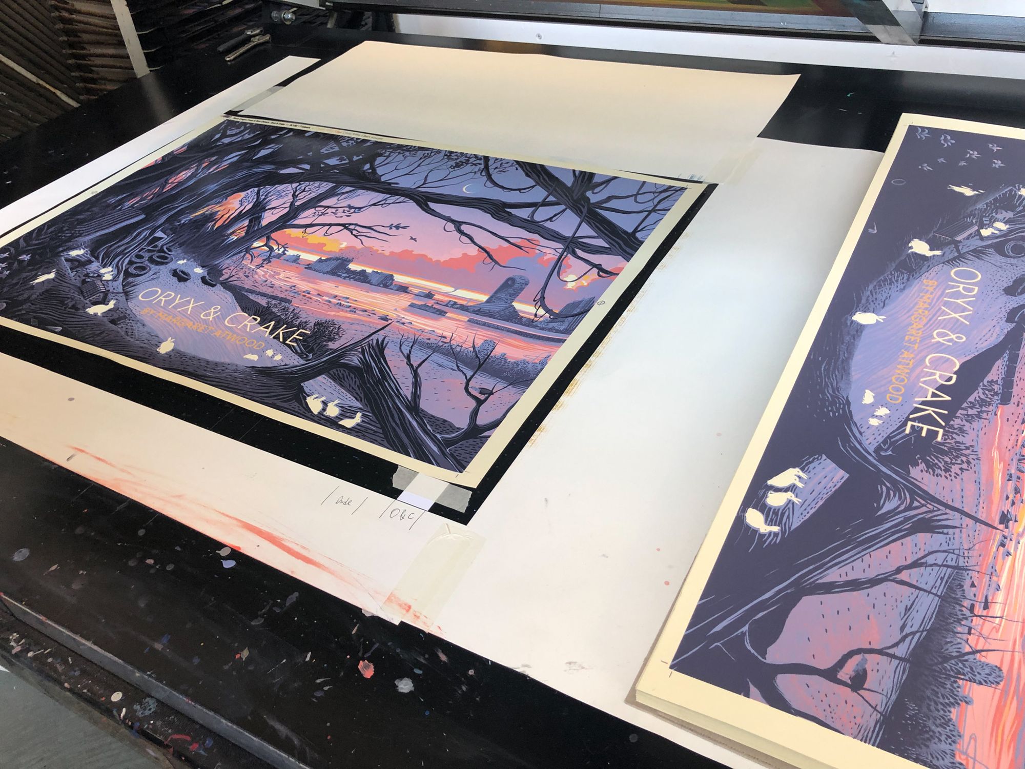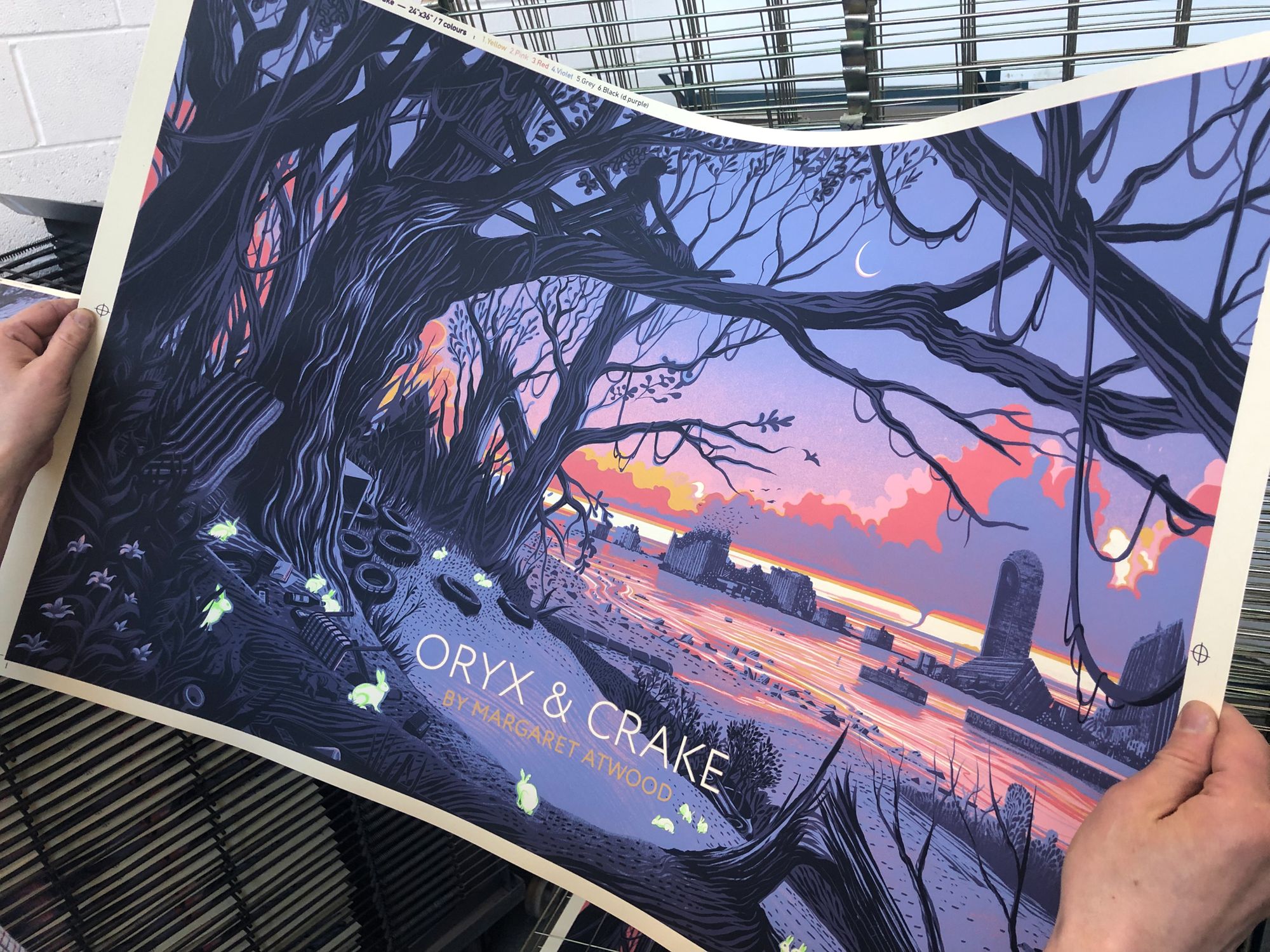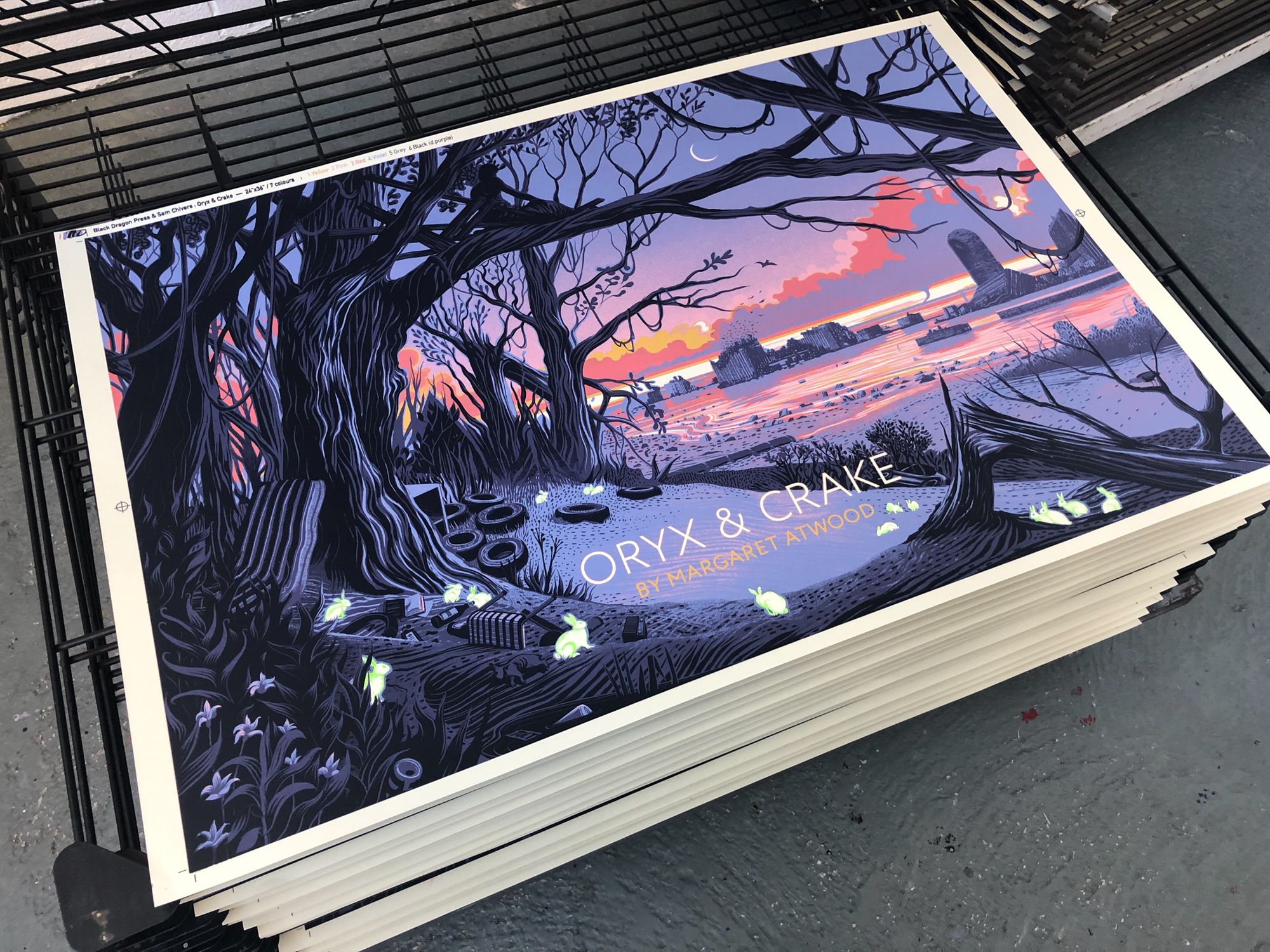 Oryx & Crake is screen-printed at 36”x24”, in 7 colours onto 270gsm ‘China White’ Colorplan. Visit Black Dragon Press for full release details.