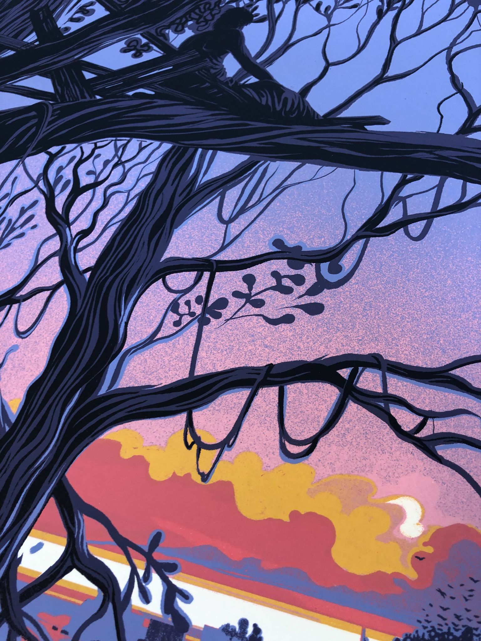 Oryx & Crake is a work of dystopian fiction by renowned novelist Margaret Atwood, and the wonderful artwork by Sam Chivers portrays a great vision of the novel. One of the story’s main protagonists, Snowman, sits in his tree, surveying in the sunset the ruins of our collapsed world, while dotted all around the scene are clues to the broader context of Atwood’s meticulous work.