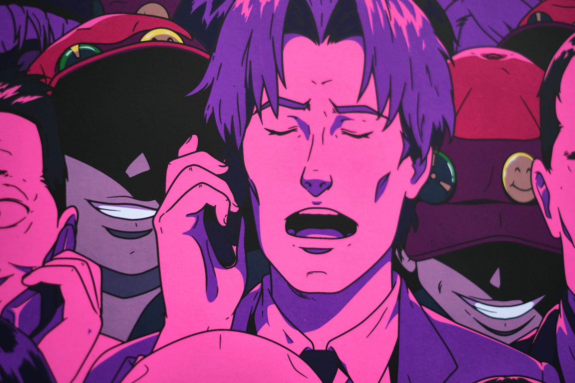 Not only is Paranoia Agent the third print of Ethan’s we’ve worked on, but it is also in many ways his most ambitious and complex. The screenprint is constructed in 12 layers, with 13 colours in total, two of which comprise a split-fountain* in the background.