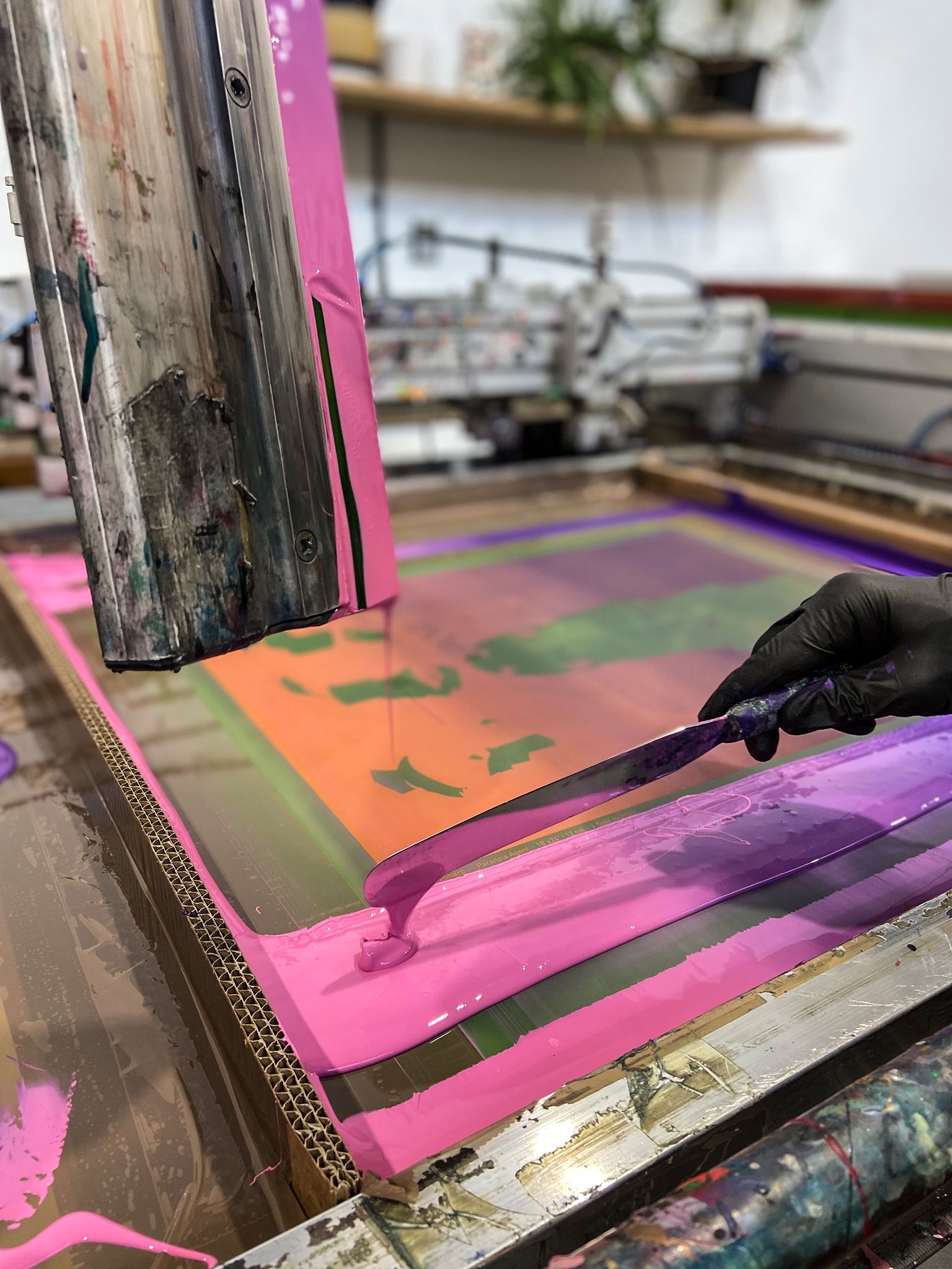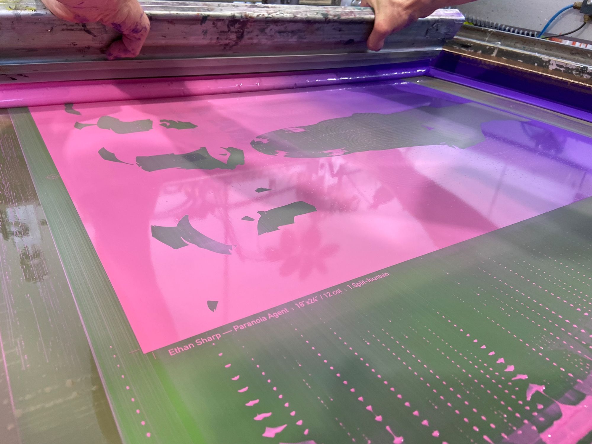 The standard procedure with a print of this nature is to create the entire colour palette of inks ahead of running the edition. When complex translucencies are involved, there are simply too many possible variables for one to run headlong into the work. What looks great in Photoshop doesn’t always translate to what is possible in print.