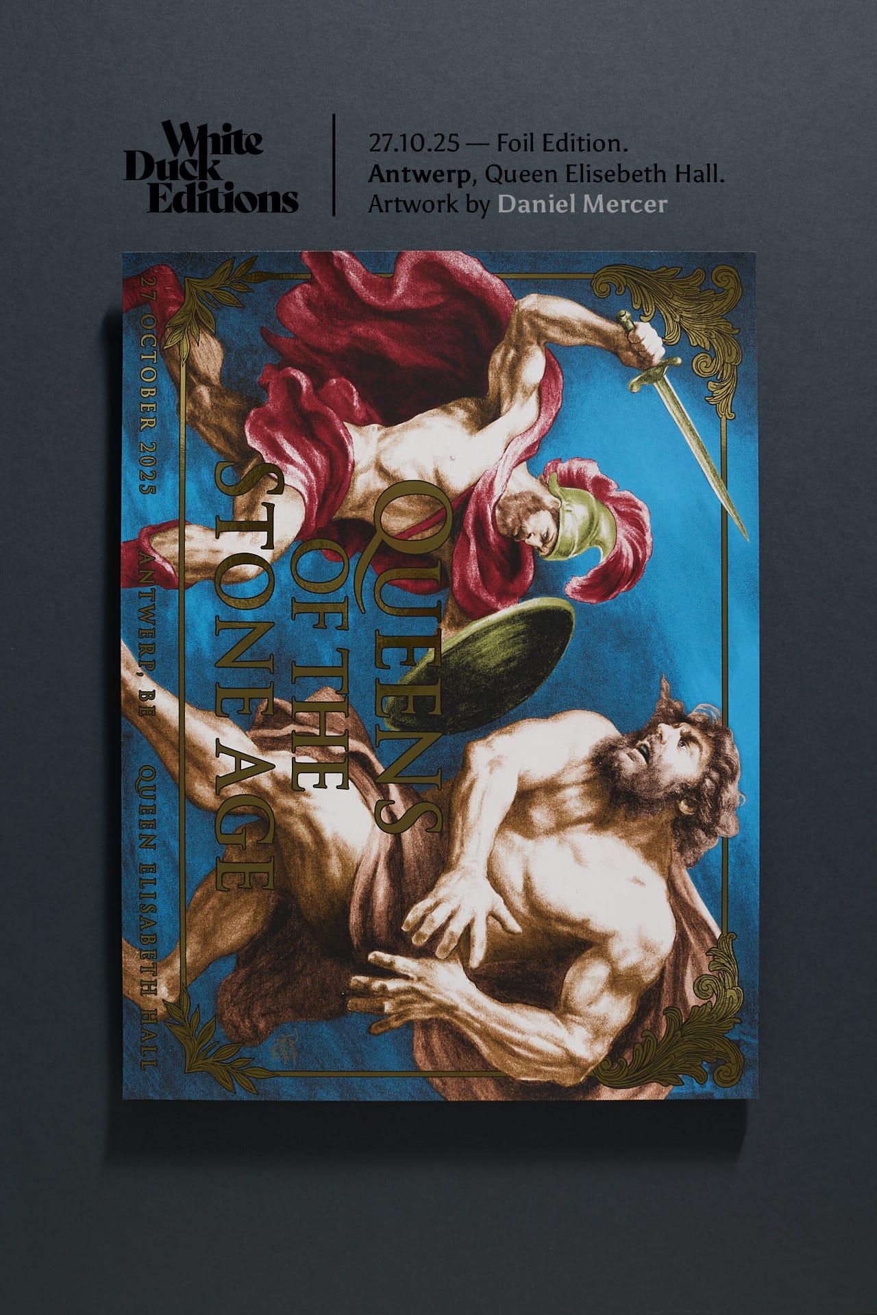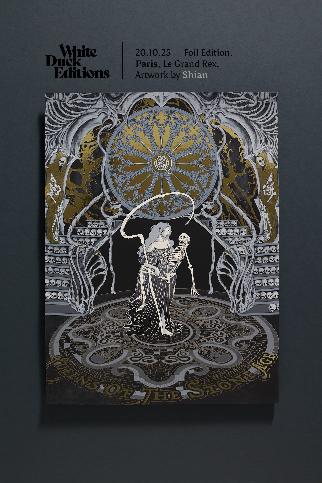 With this richly imbued material to draw upon, a roster of fantastic artists was assembled by Bravado to create concert posters for every city on the tour: Milan, Paris (the band's muse), Basel, Berlin, Copenhagen, Amsterdam, Antwerp, and finally London, where QOTSA played the inimitable Royal Albert Hall.