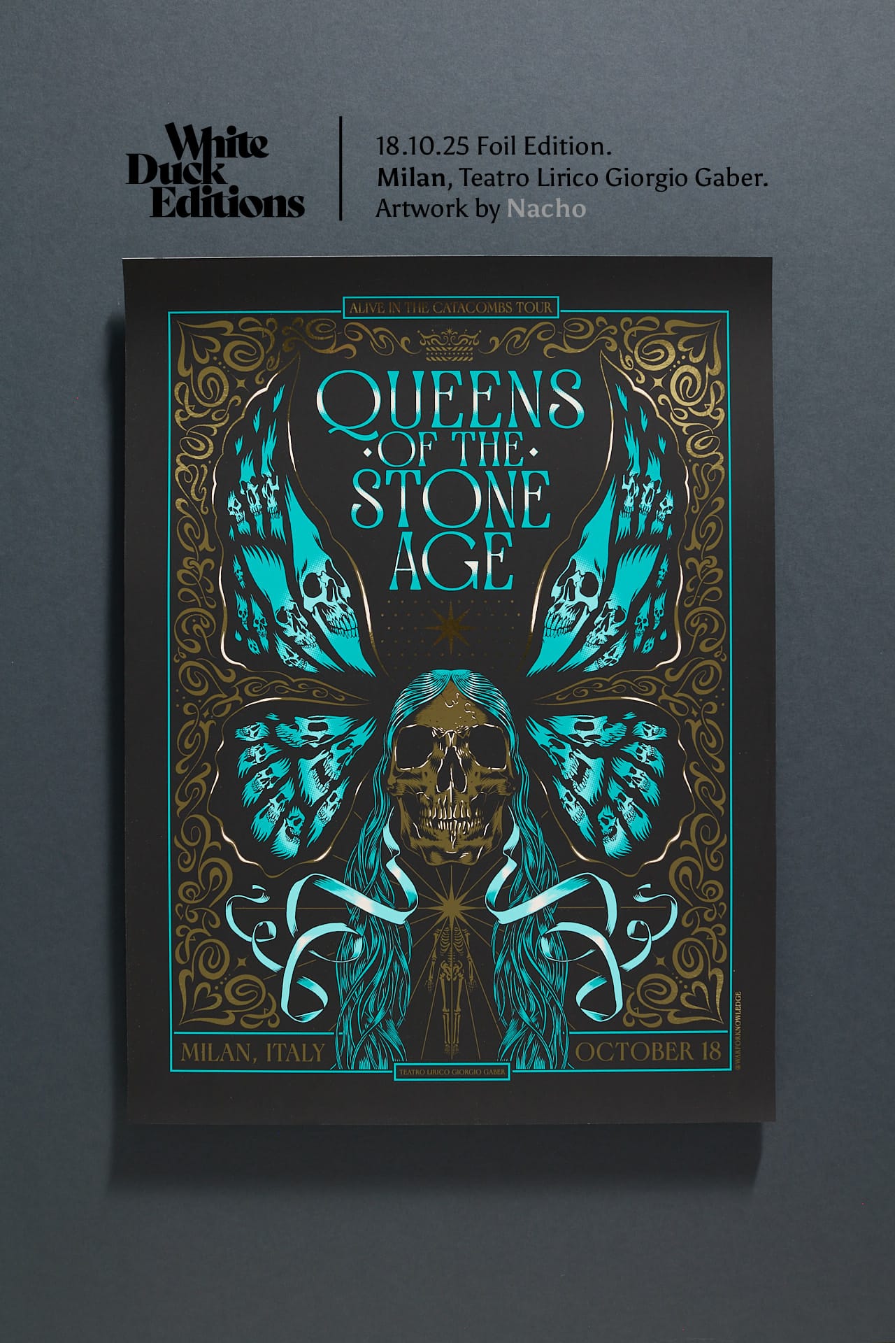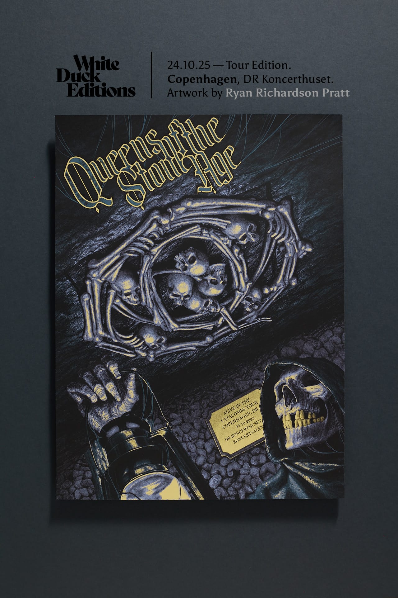 Hot on the heels of their critically acclaimed Alive In The Catacombs, QOTSA lit up the concert halls of Europe and North America and produced a silkscreened poster for every stop along the way. Let us tell you about how we printed for the European swing of the tour.