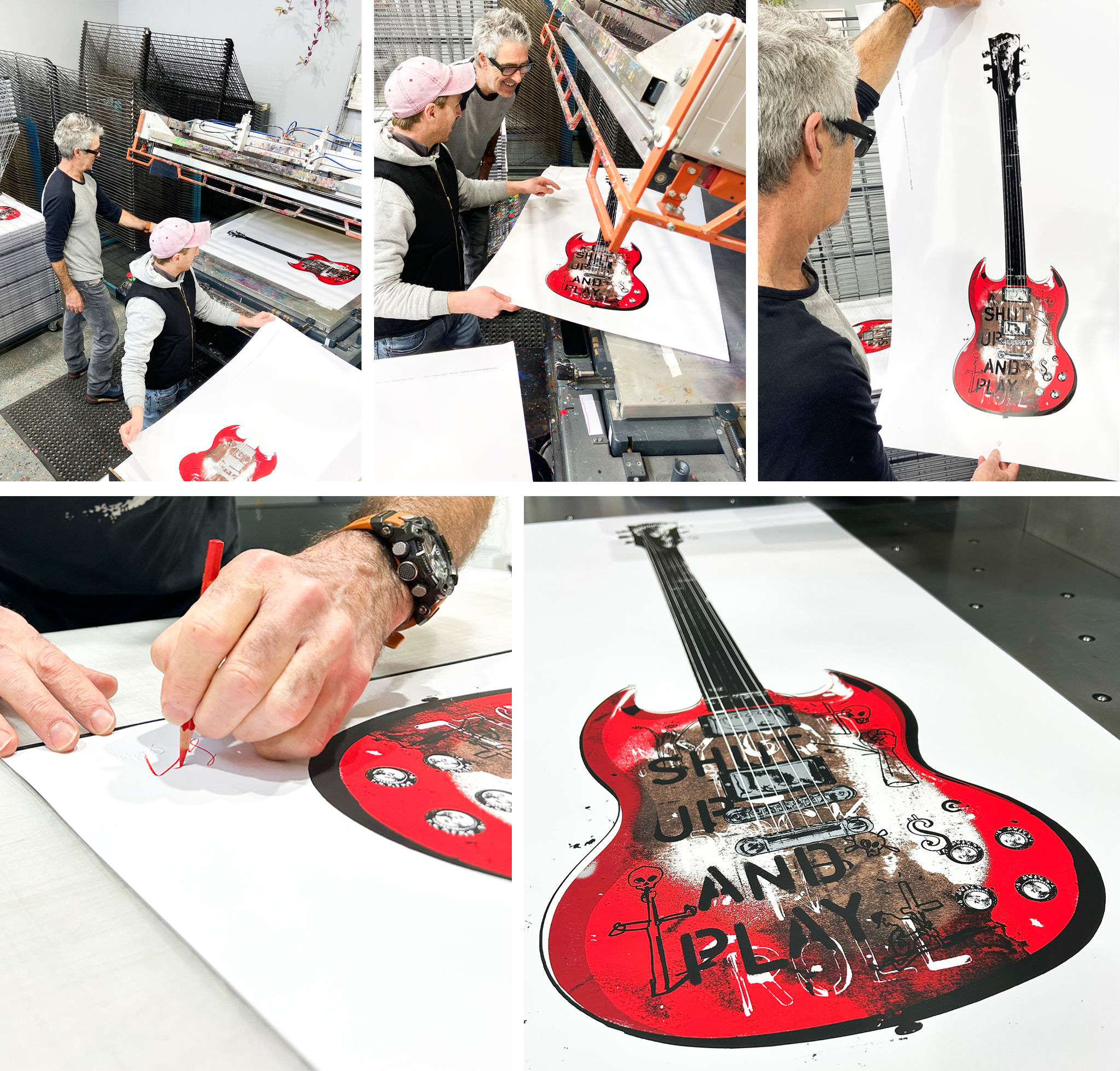 This edition was truly collaborative from the outset. We worked closely with Simon to deconstruct his Gibson SG illustration into seven distinct print layers, ensuring that every single detail translated perfectly into silkscreen printed ink. We then produced the strictly limited edition of just 15, here in the White Duck Editions studio, with Spilsbury in-house to get his hands involved in the completion of the edition.
