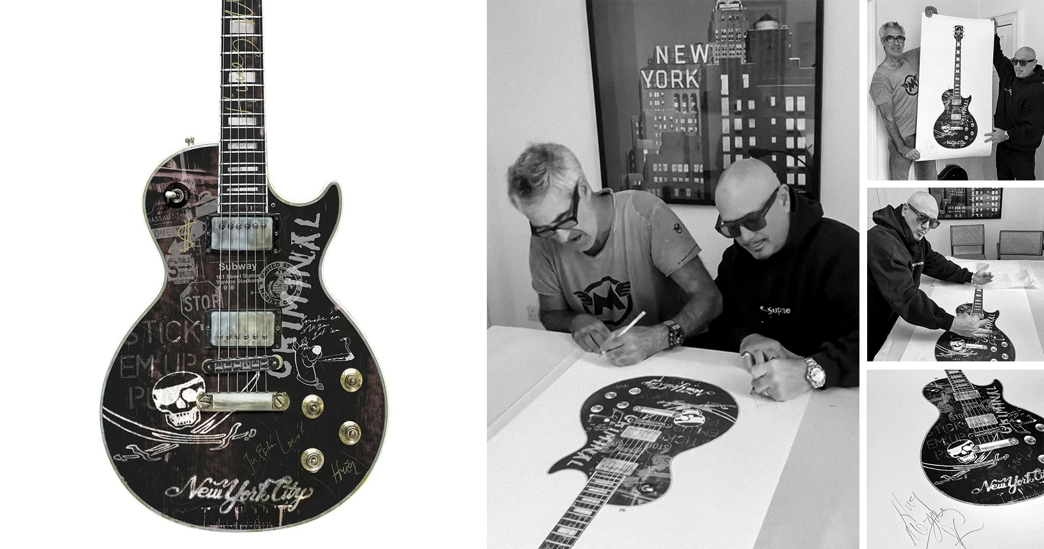 One fine example of this collaborative process is the guitar Spilsbury created with Huey Morgan, frontman of Fun Lovin' Criminals. Working closely with Huey, Spilsbury created just such a Rock & Roll portrait, visually mapping Huey's life — his time in the US marines, his tattoos, and, of course, his beloved Gibson Les Paul Custom. This signed print, offered in a hand-embellished edition, showcases how personal and meaningful Spilsbury’s work can be.