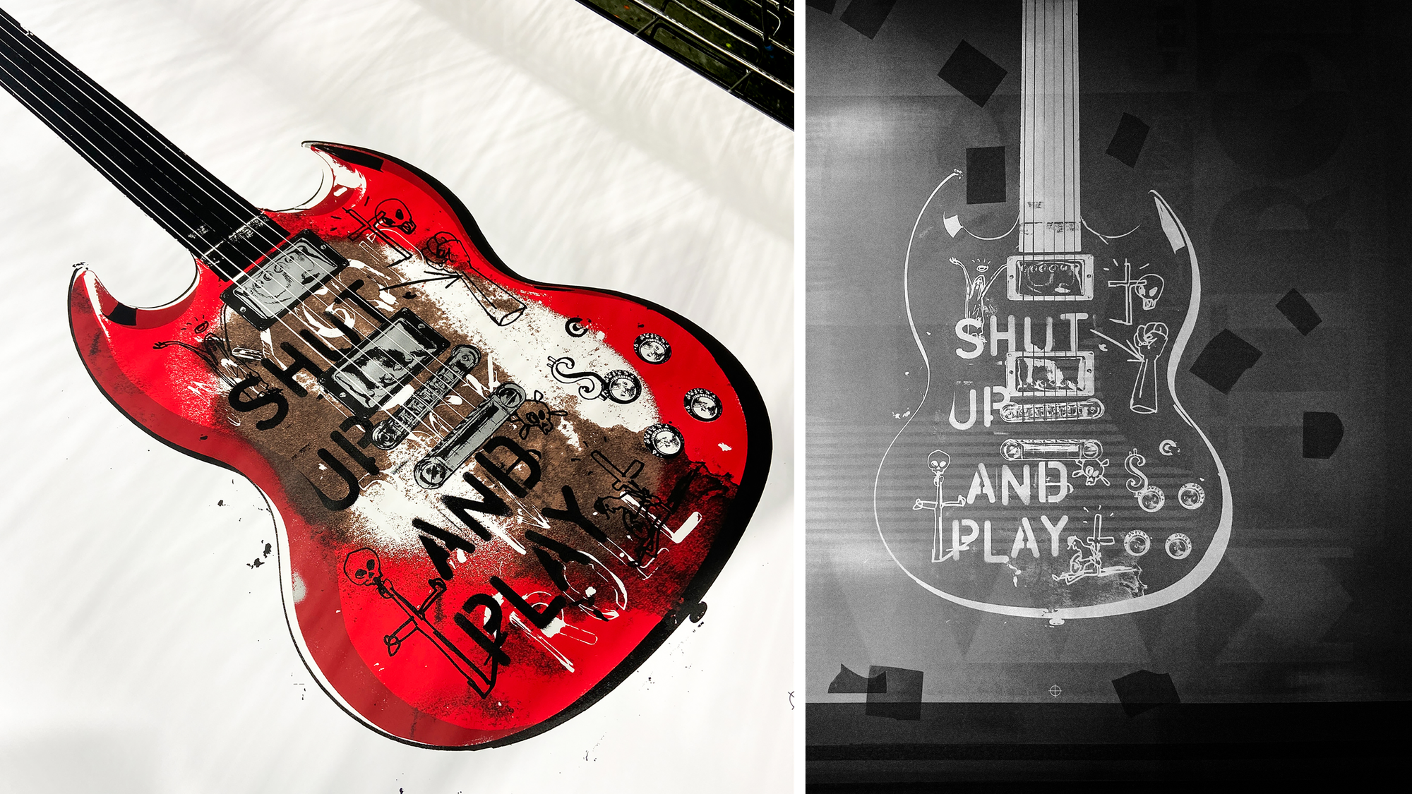 Spilsbury's recent exhibition at The Guitar Show UK was a distillation of this evolving body of work. It included the Gibson SG ‘Shut Up And Play’ silkscreen print, among other guitars, and was a visually striking showcase for this ongoing project.