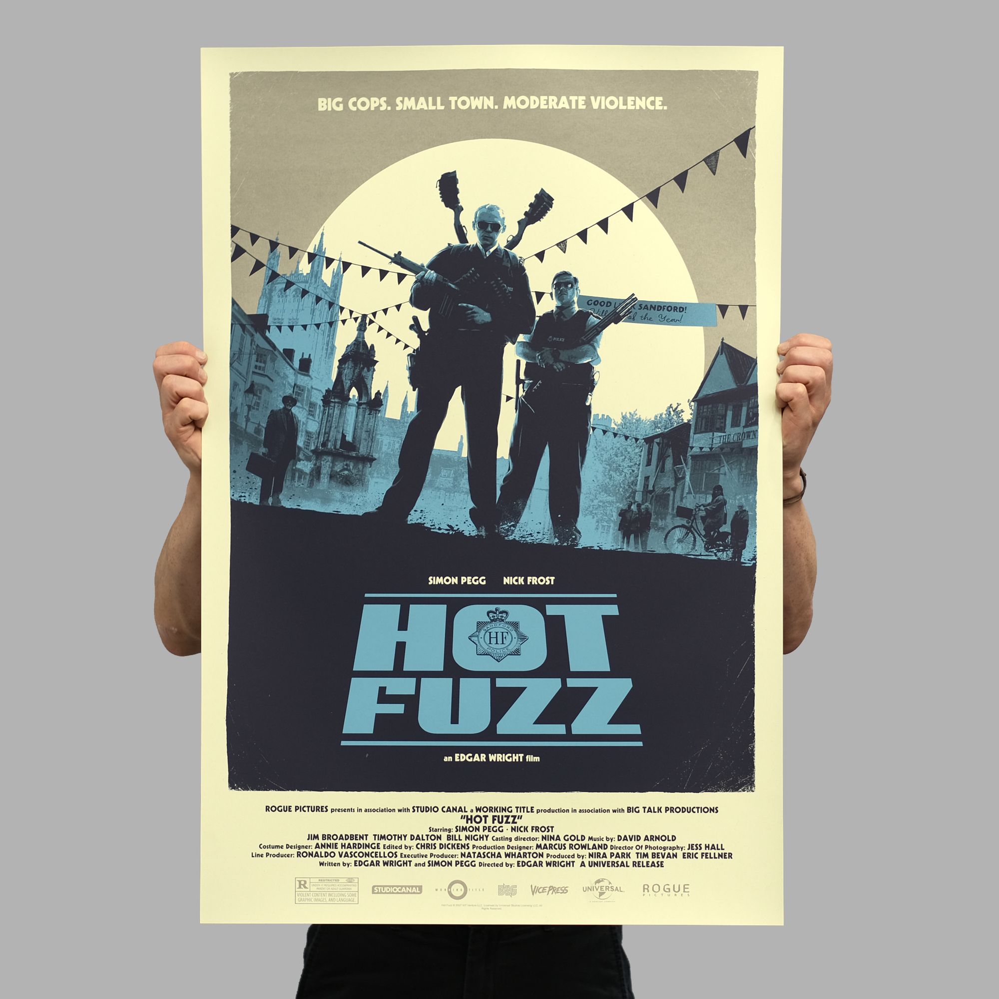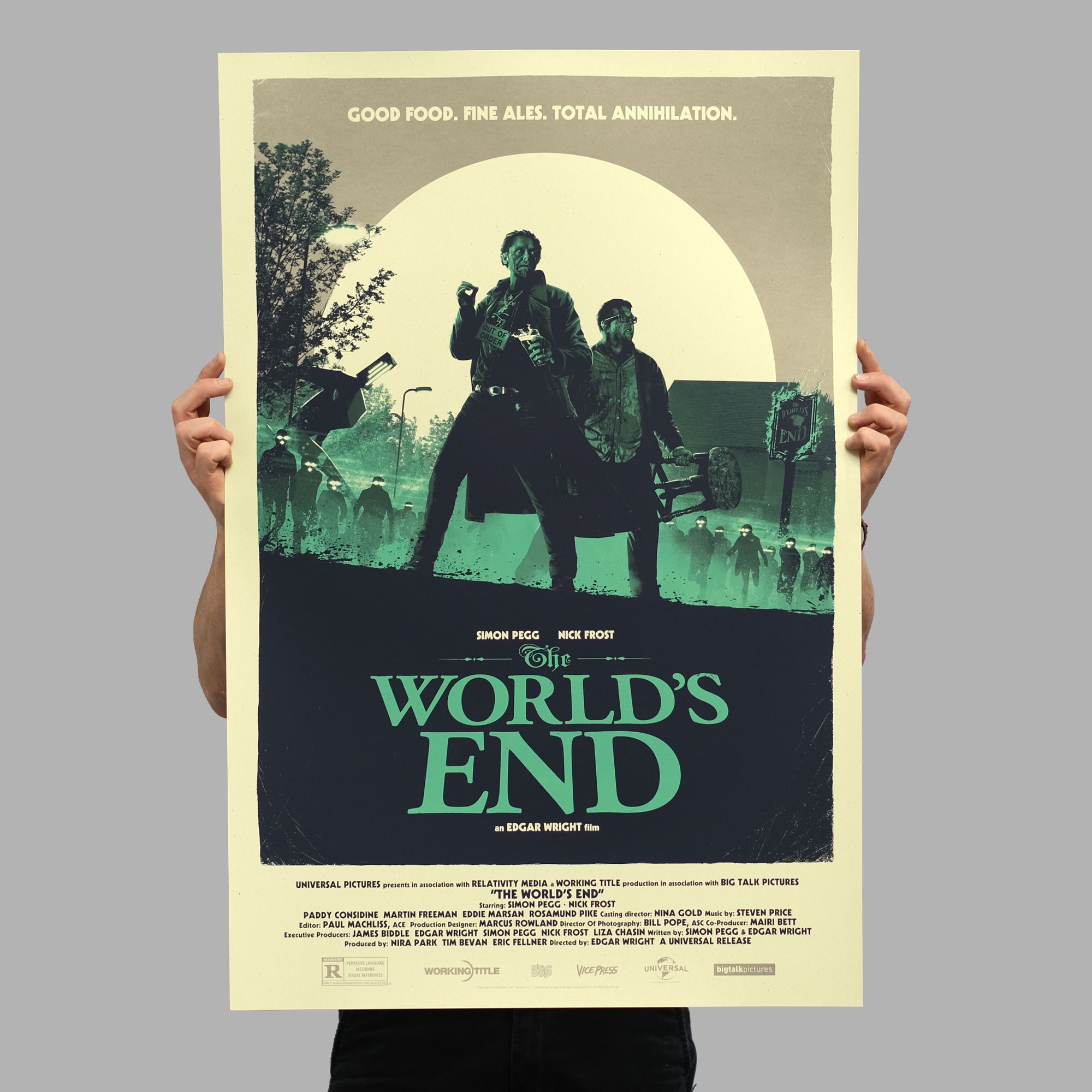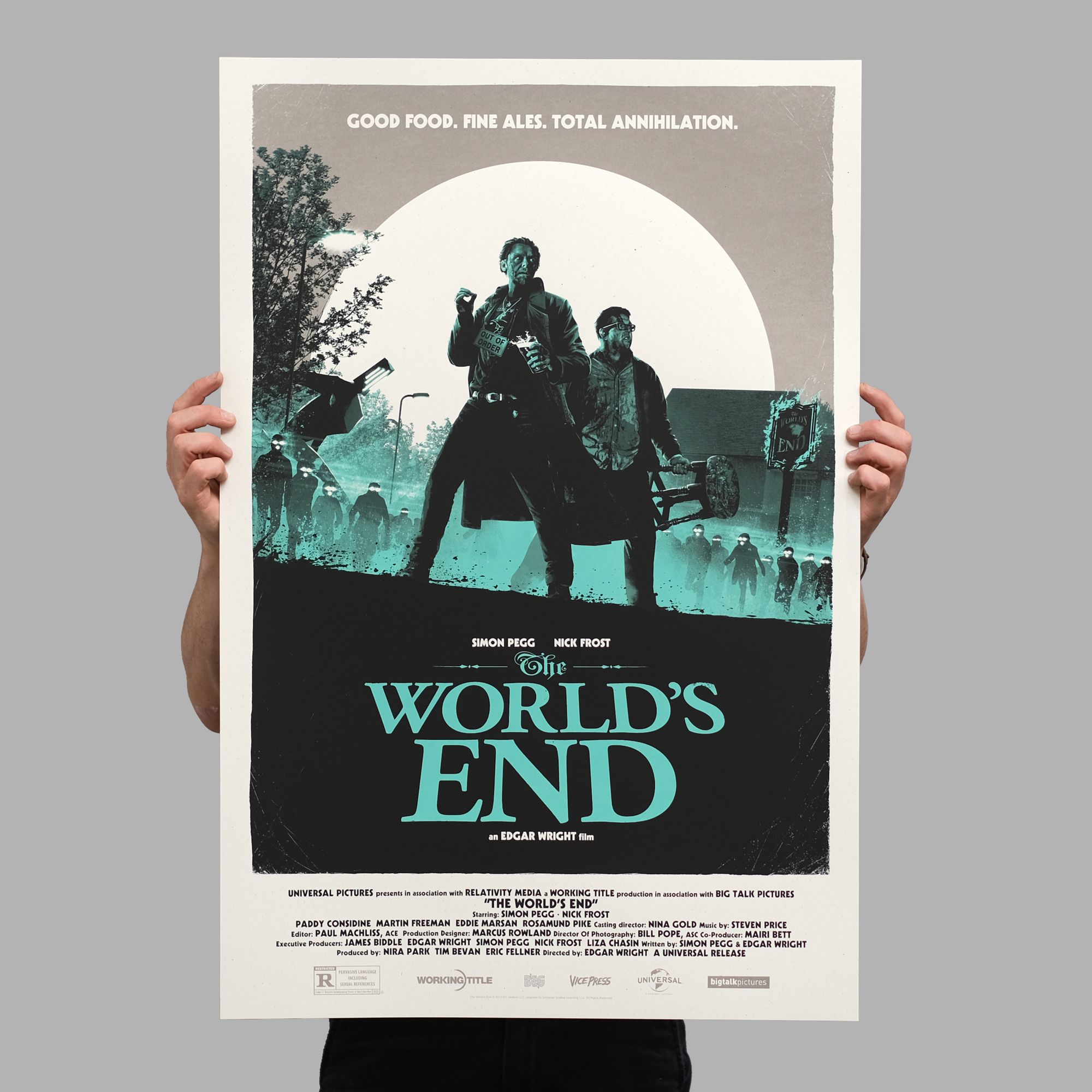 The second instalment, Hot Fuzz, landed in early 2020, before a protracted sign-off delay, attributed to Simon Pegg’s likeness, held The World’s End in limbo until late spring of 2021. The likeness issue resolved itself, with the poster artwork moving from approved to rejected and back to approved, all internally at the studio, but it meant that fans of the series had to wait patiently before the final poster hit the press.