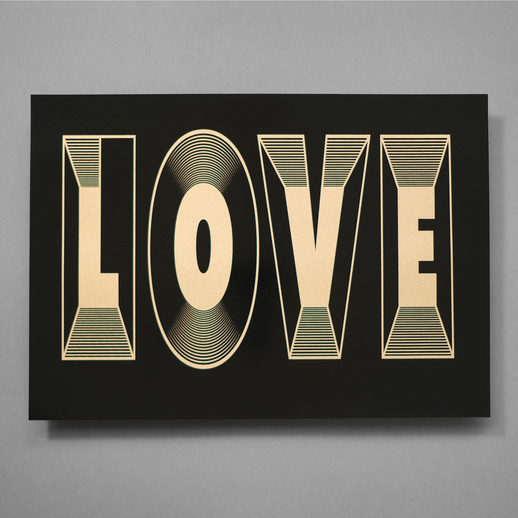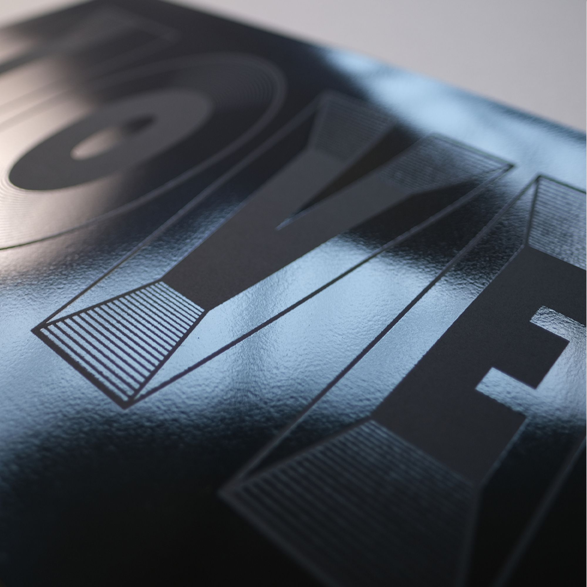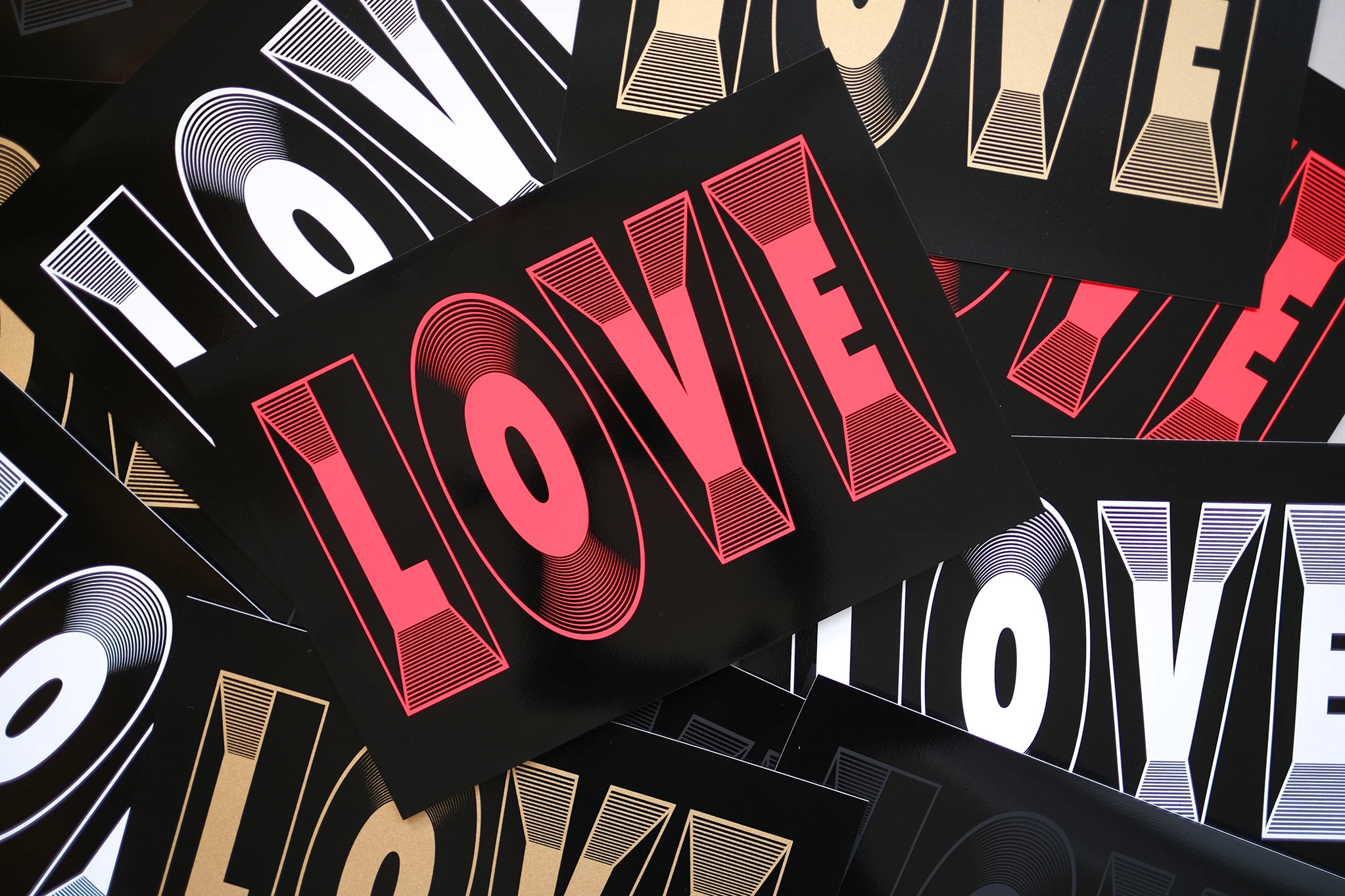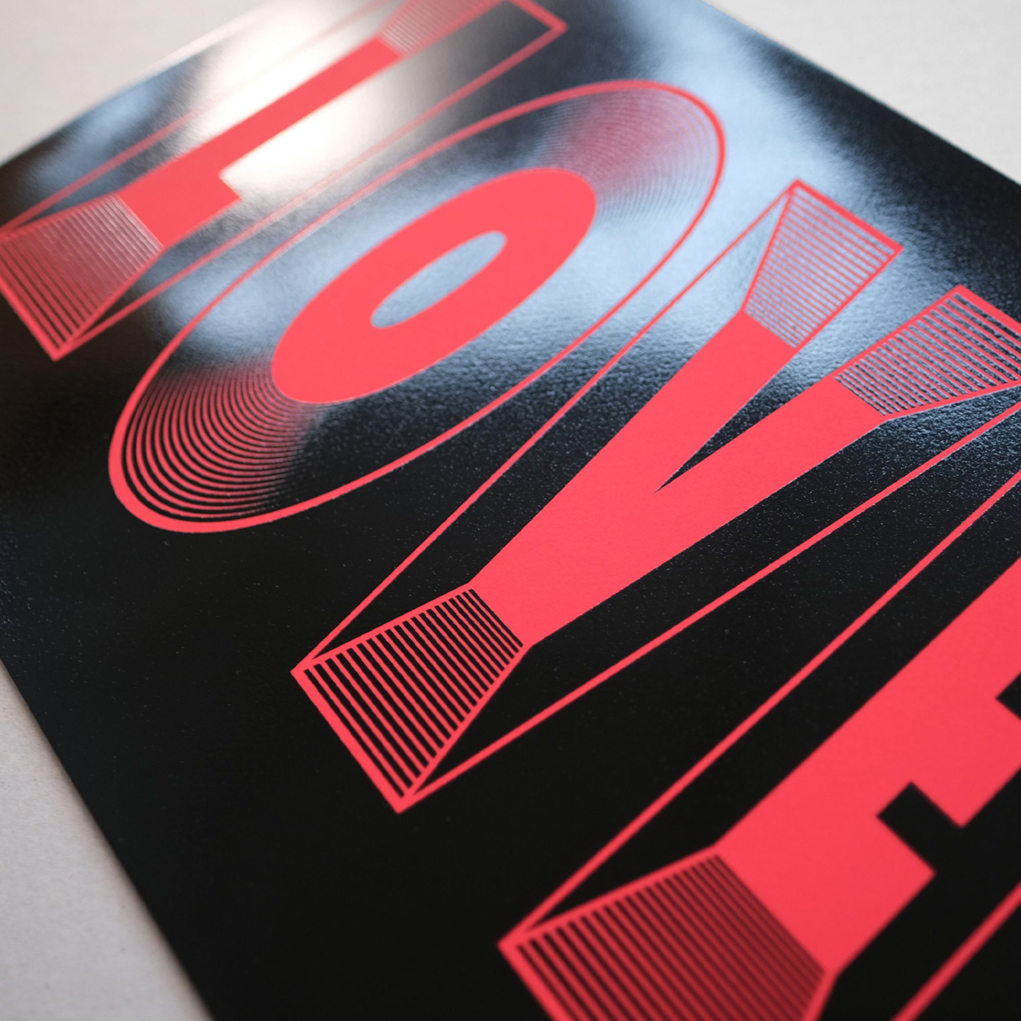 The typography was strong on-screen, but through the screen print process, we were able to elevate it to another level. Printing with matte colours (and one metallic ink) as a base, we then layered heavy high-gloss enamel black ink to create a thoroughly constructed and built looking screenprint. Super tactile and with brilliant depth, it is a print that captures the light and causes the word LOVE to move in and out of focus, regularly leaping from the paper toward the viewer.