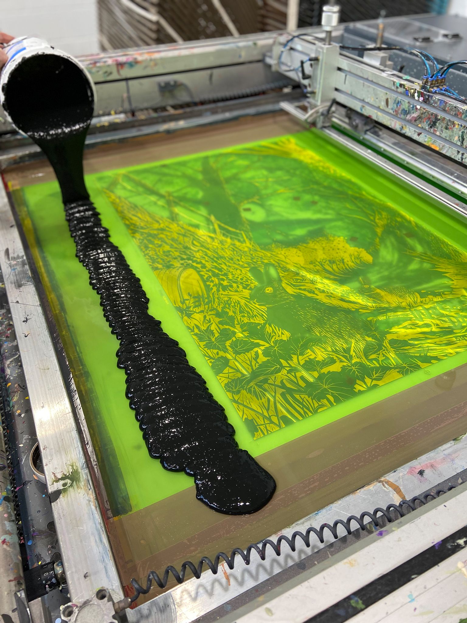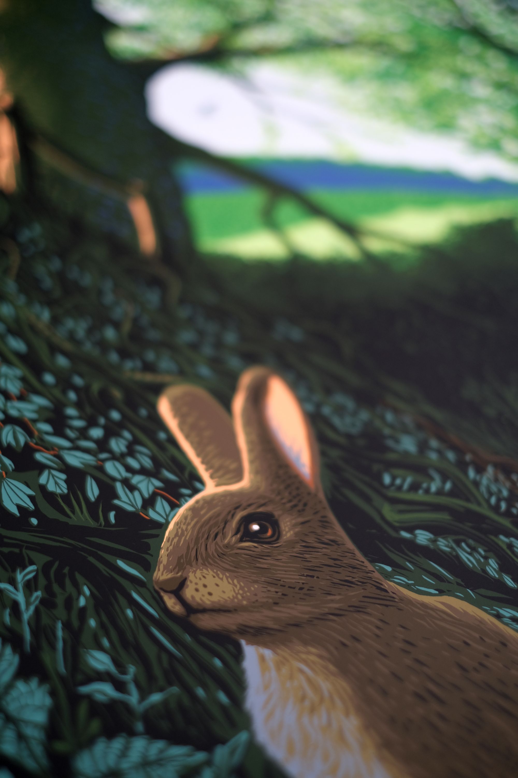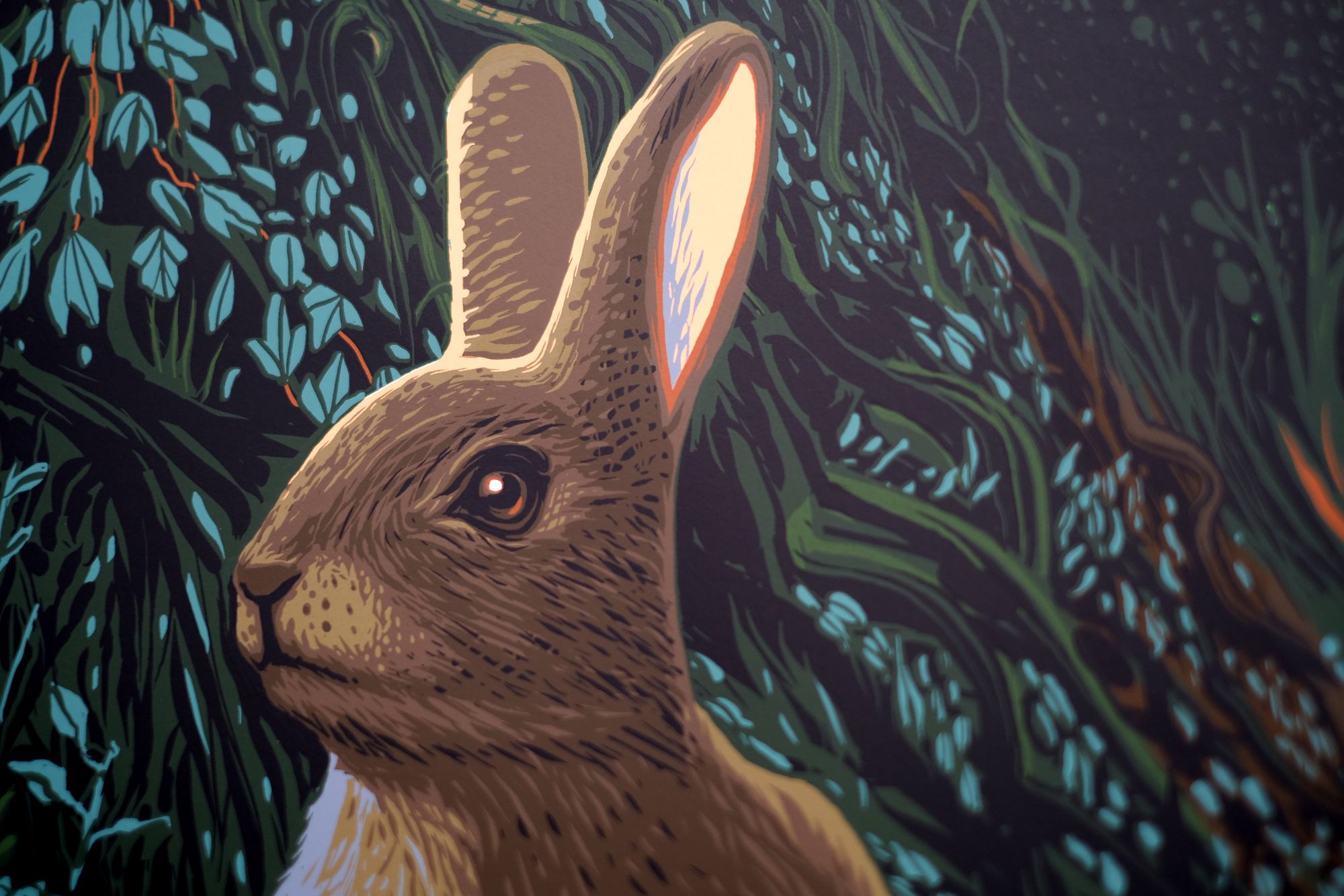 Evoking a moment of still tension amid the hidden pathways of a familiar English countryside, with their new screenprint edition Sam Chivers and Black Dragon Press invite us into the half-lit world of Richard Adams’ literary classic.